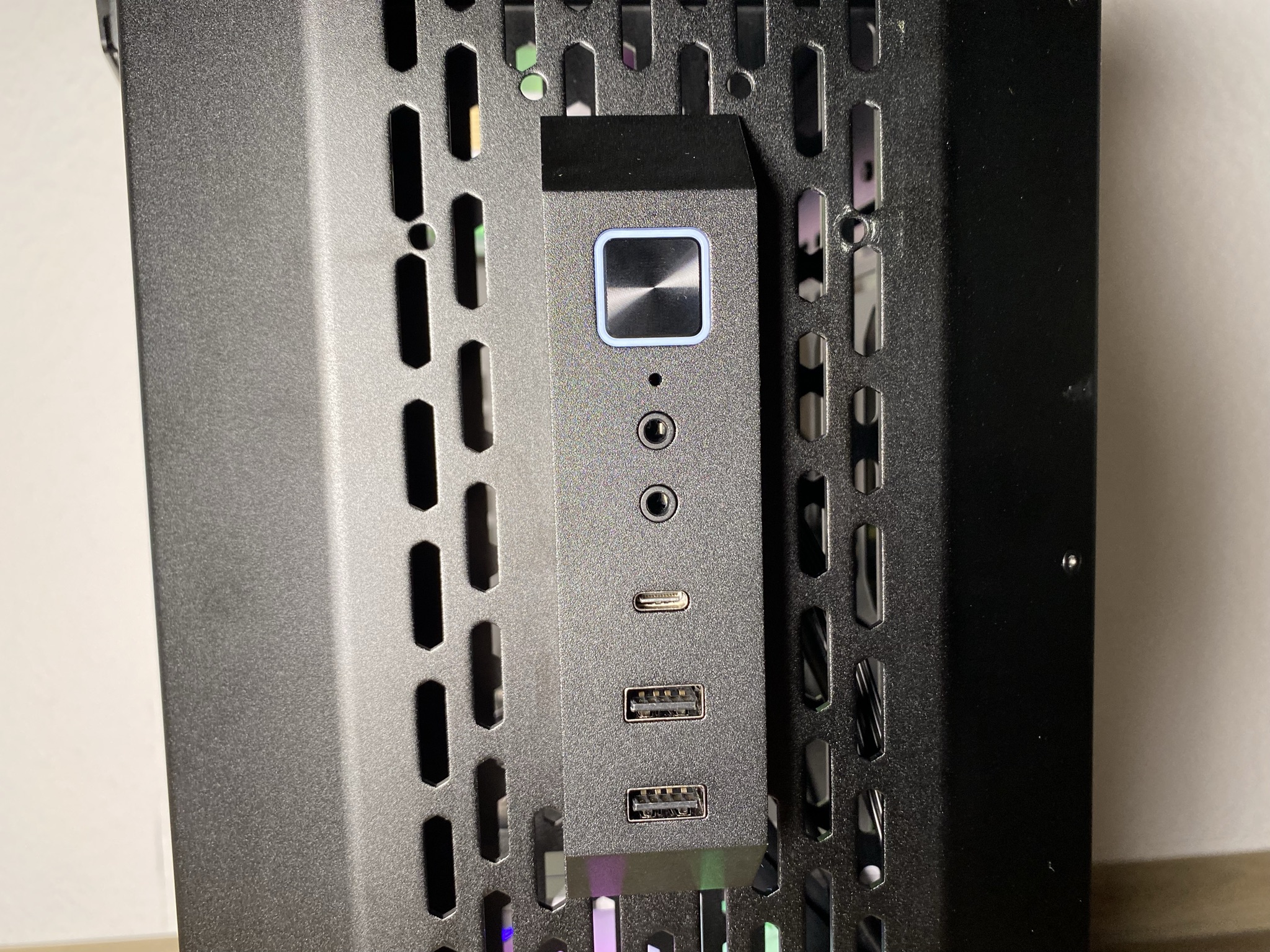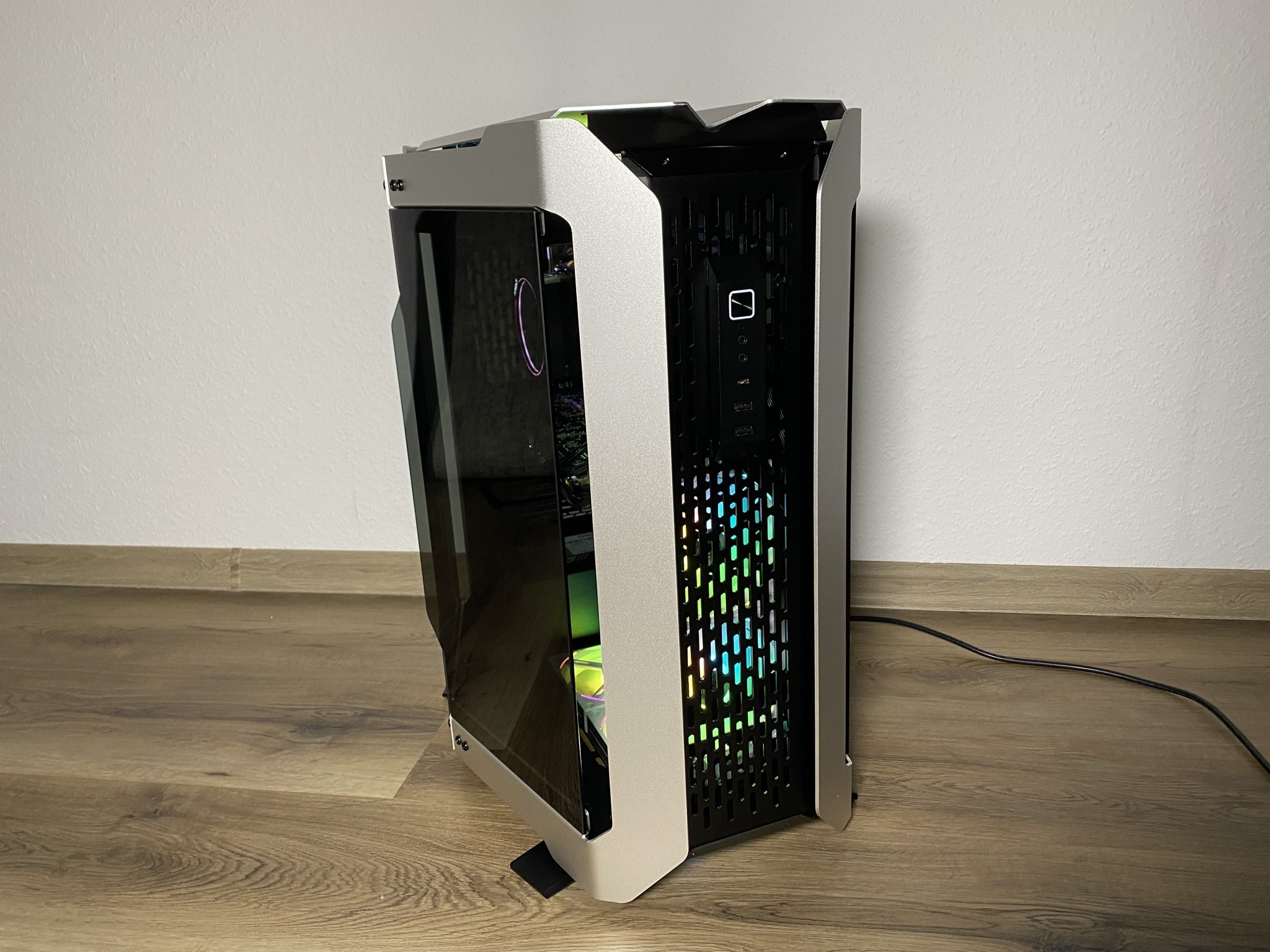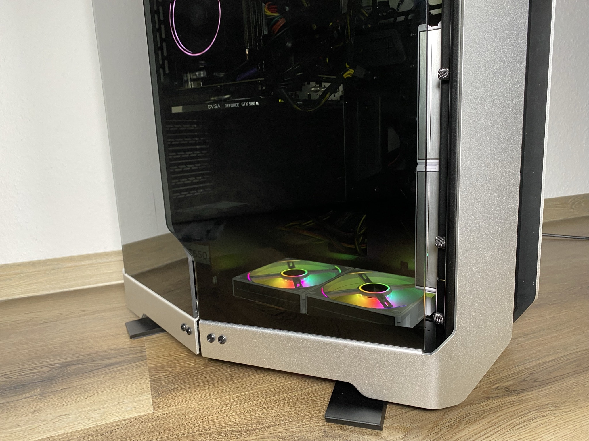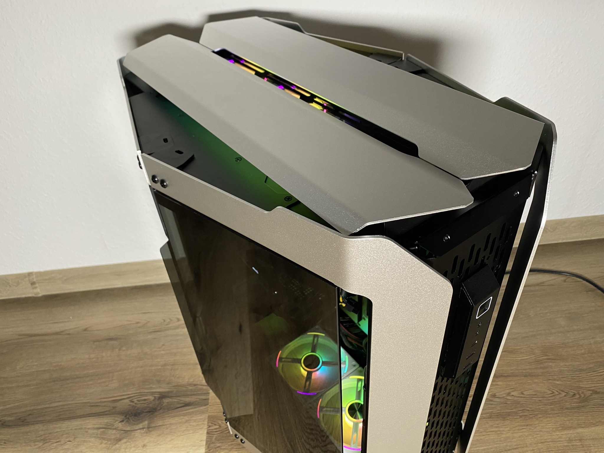 Besonders gut gelungen sind zudem die Glasscheiben des ODYSSEY X. Und das nicht nur aufgrund ihrer Optik. An einem kleinen sinnvollen Belüftungs- und somit Kühlungstrick wurde sich hier bedient. In der Mitte, sowie an den jeweiligen Seiten, sind kleine Lücken zwischen dem Glas und dem Aluminium. Das Gehäuse wird dadurch an beiden Seiten an simplen Stellen etwas mehr geöffnet und belüftet. Dabei wird jedoch auch auf eine Filterung der Luft mit einem Staubfilter am gesamten ODYSSEY X verzichtet.