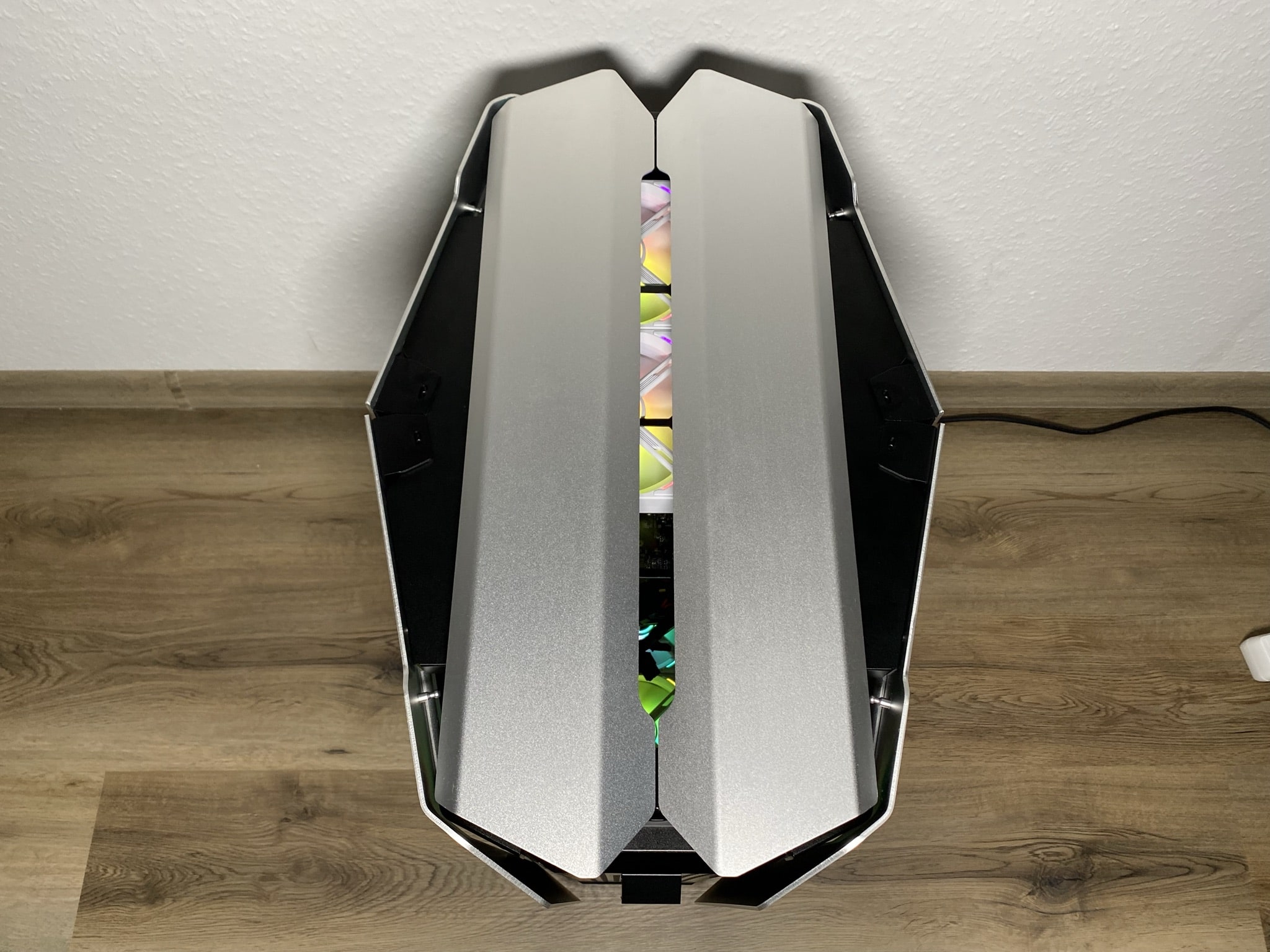 Ein weiteres zweischneidiges Schwert sind die mitgelieferten Aluminiumplatten für die, in diesem Fall der Performance-Variante, Oberseite des Gehäuses. Ohne montierte Scheiben lassen sie sich frei anpassen, so kann das Gehäuse individuell gestaltet werden. Leider ist man jedoch auf eine Möglichkeit beschränkt, wenn man die Panels montiert, da diese sonst oben nicht ordnungsgemäß in den Klipps sitzen und nur aufliegen.