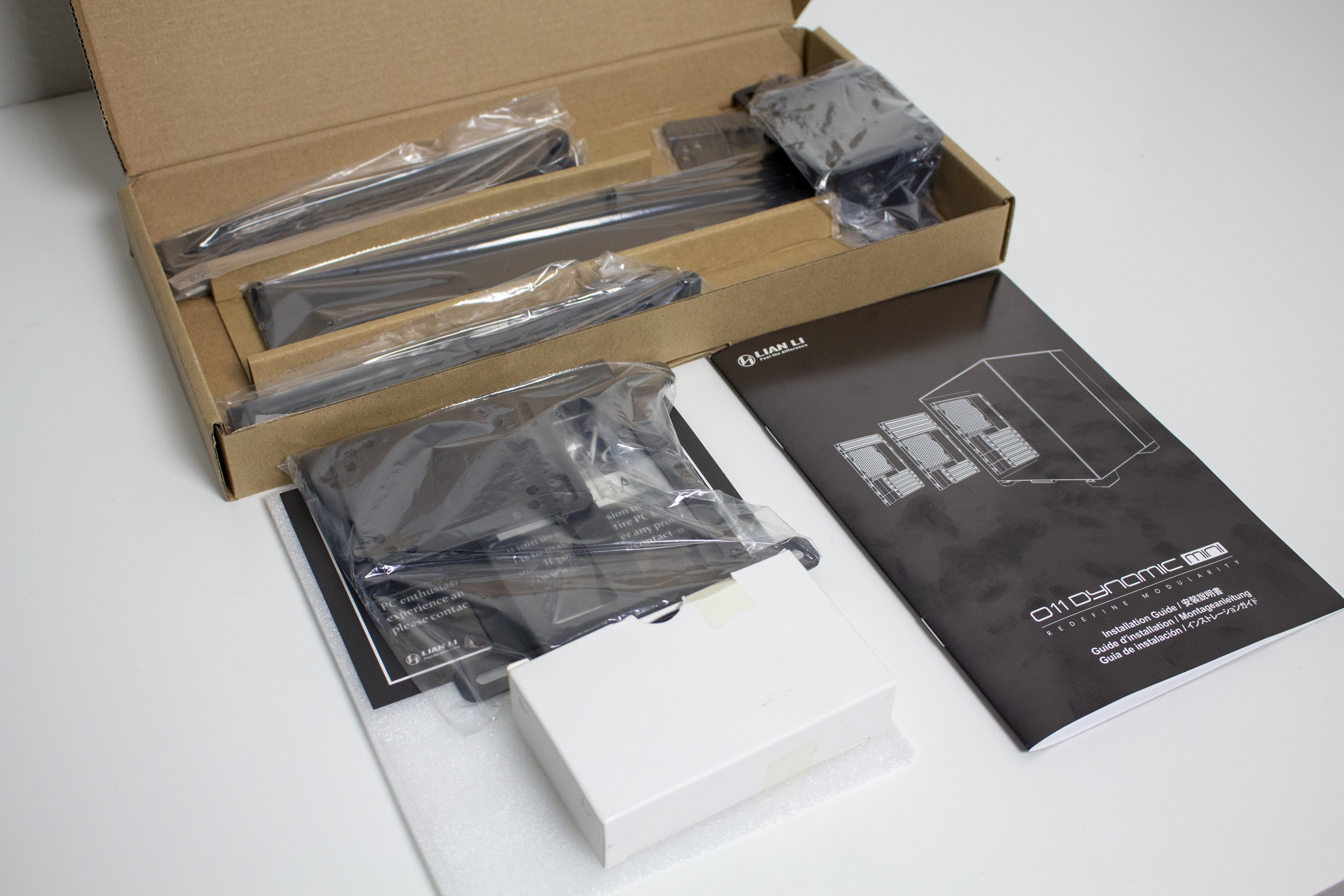 Das mitgelieferte Zubehör gestaltet sich beim Lian Li O11D Mini recht üppig. Dieses befindet sich außerhalb des Gehäuses zwischen den zwei Styropor-Blöcken. Verpackt in einer braunen Schachtel finden sich eine weitere Schachtel mit allen benötigten Schrauben und Kabelbindern, eine detaillierte Bedienungsanleitung mit Bildern und zahlreiche Gehäuseteile aus Stahl. Diese Teile sollen später den variablen Umbau des Gehäuserückseite ermöglichen. Außerdem gibt es noch spezielle Pumpenhalterungen für eine Wasserkühlung.