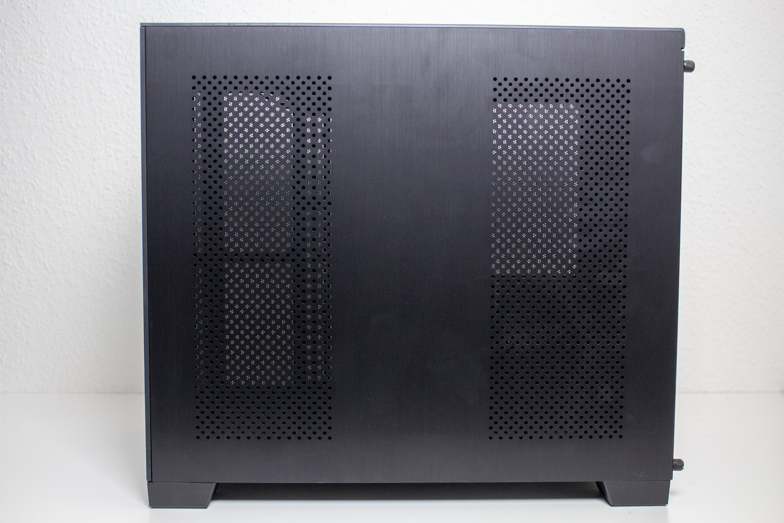 Das rechte Seitenteil des PC-O11D Mini besteht komplett aus Aluminium und verfügt über zwei Belüftungsgitter für das Netzteil bzw. mögliche Lüfter. Beide Gitter wurden auf der Innenseite mit einem magnetischen Staubfilter ausgestattet. Die Verbindung mit dem Korpus erfolgt über zwei Rändelschrauben. Diese Eigenschaft trifft bei dem linken Seitenteil nicht zu. Dieses besteht nämlich komplett aus Glas und kann nur entfernt werden, wenn vorher der Deckel demontiert wurde. Nur dann kann die Scheibe nach oben hin aus der Halterung gezogen werden.