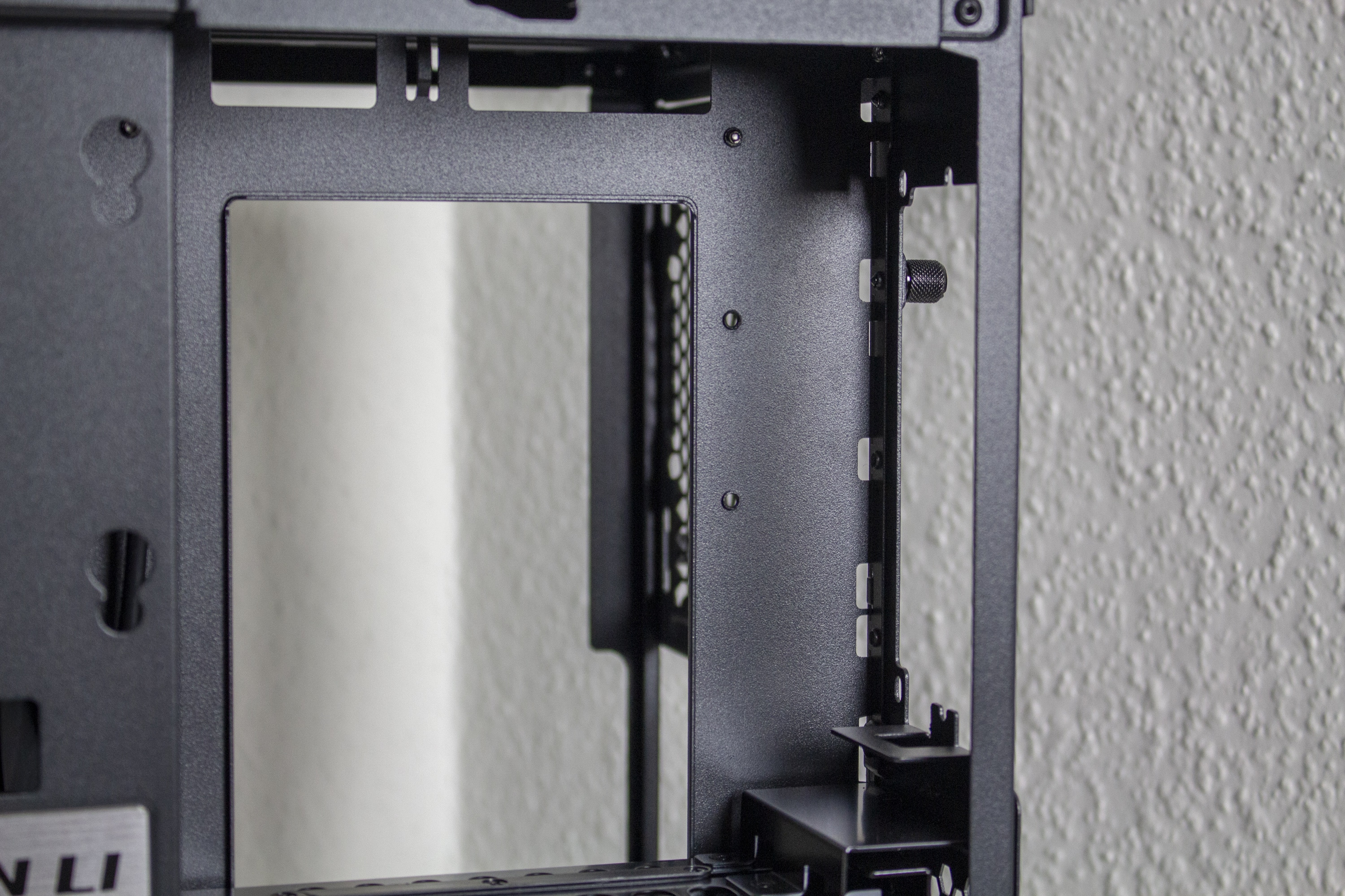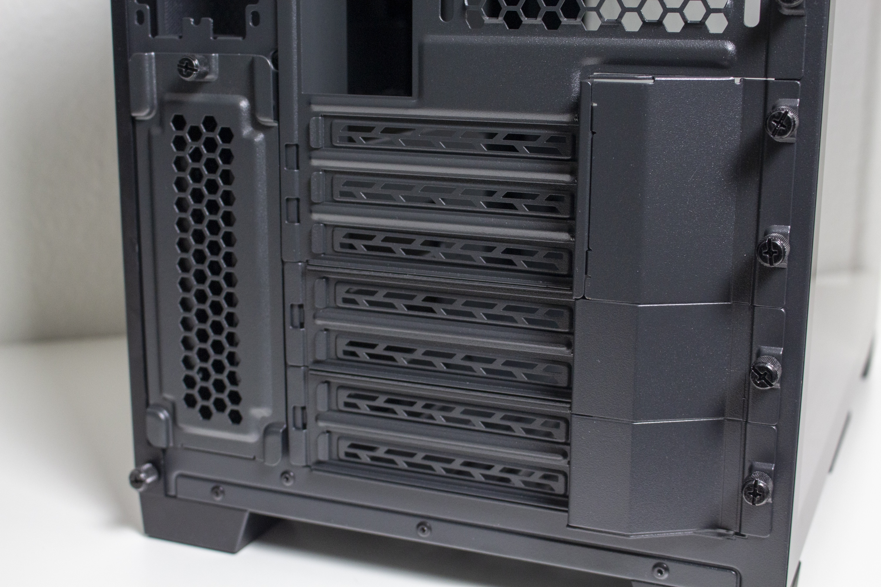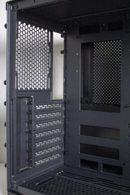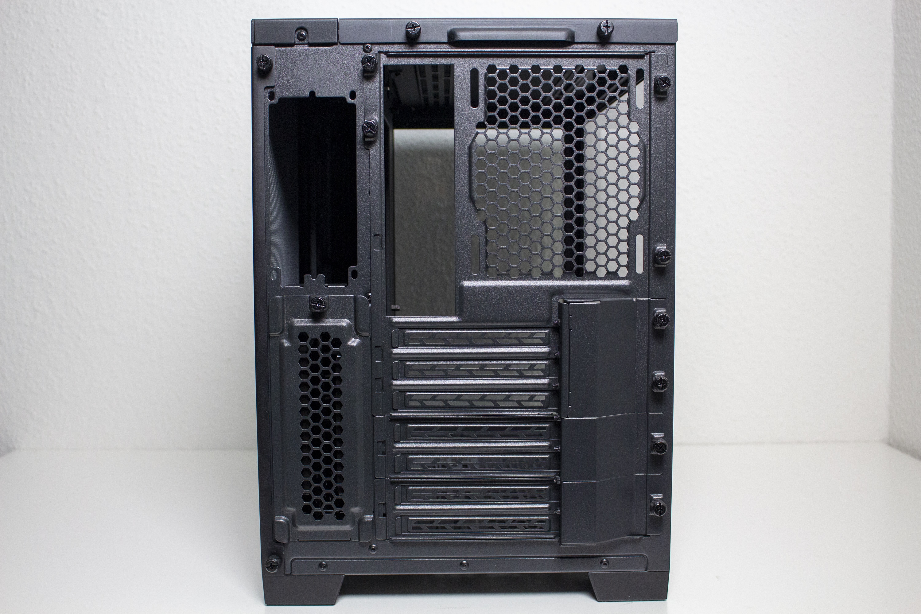 An der Rückseite zeigt sich auf den ersten Blick ein übliches Layout für Cube-Gehäuse. Auf der linken Seite findet man den Montageplatz für das SFX oder SFX-L-Netzteil und darunter eine entfernbare Blende hinter der sich zwei HDD-Rahmen für 3,5″-Festplatten verstecken. Die rechte Seite bietet Platz für einen 120-Millimeter-Lüfter, das I/O-Shield und für bis zu sieben Erweiterungskarten. Diese sind perforiert und wiederverwendbar. Wer etwas genauer hinschaut, kann an der Rückseite zusätzlich noch zahlreiche weitere Rändelschrauben erkennen. Was es sich damit auf sich hat, verraten wir aber erst auf der nächsten Seite.