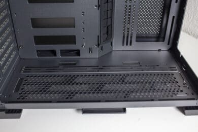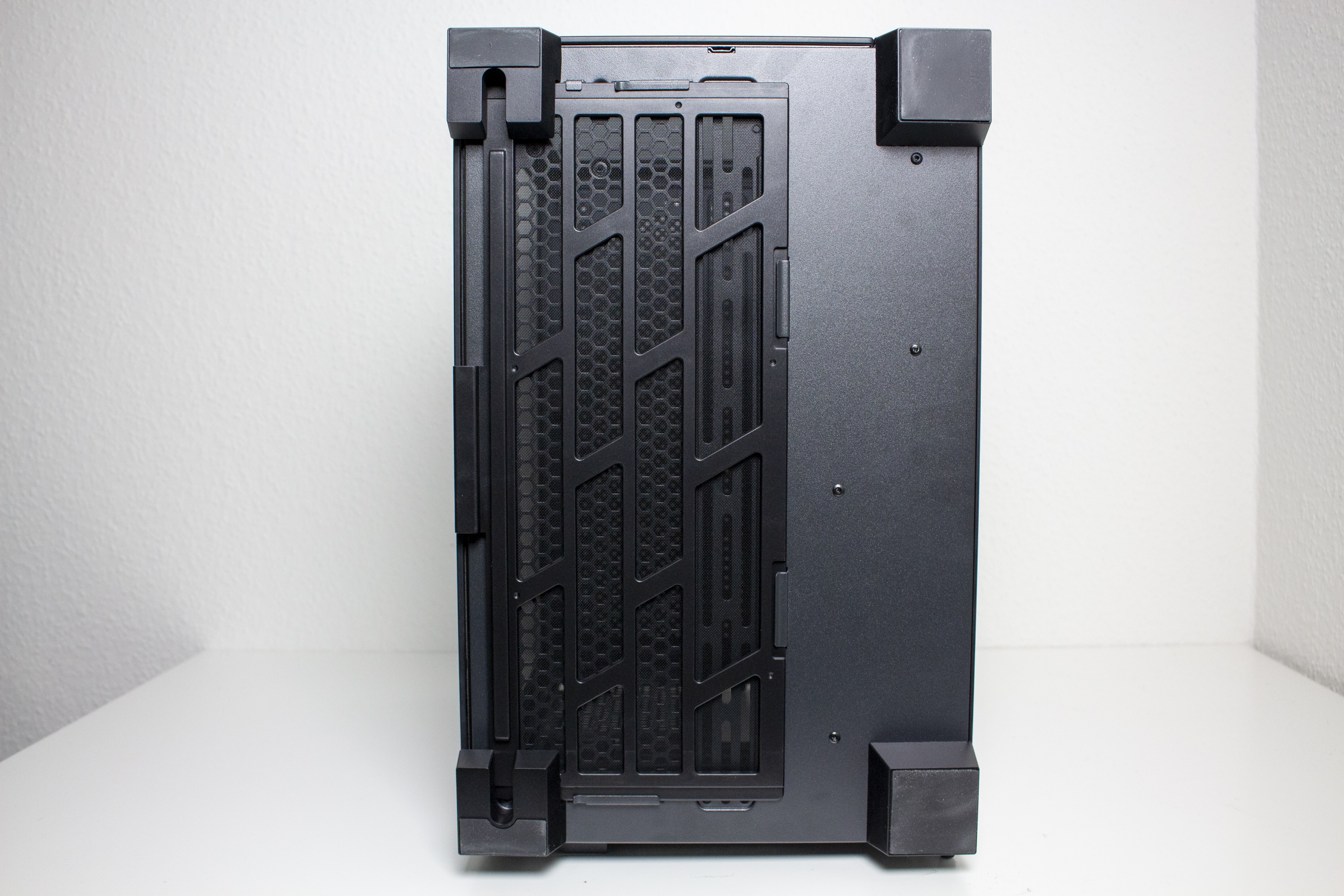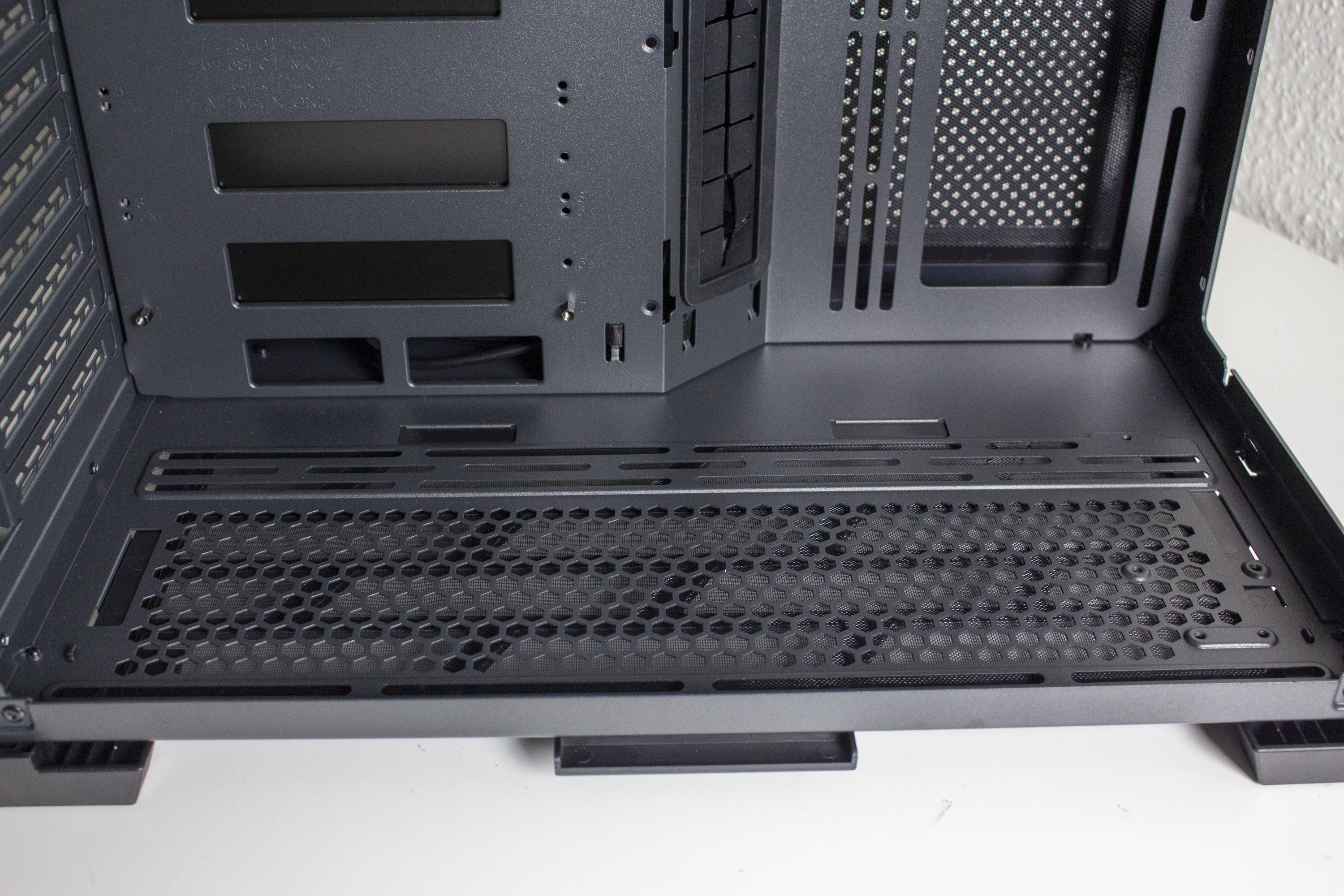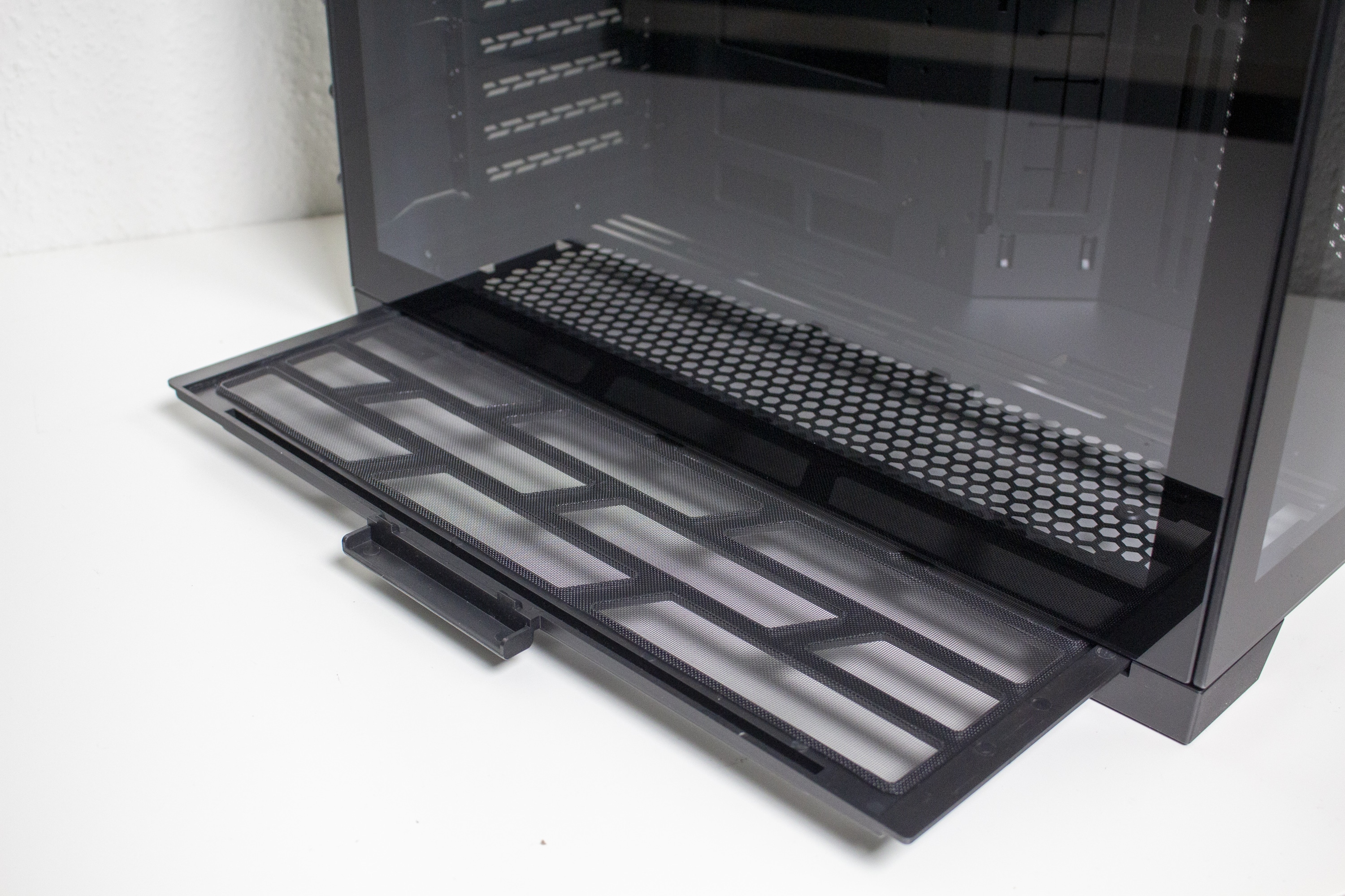 Einen festen Stand erhält das PC-O11D Mini durch vier große Füße aus Kunststoff, welche zur besseren Geräuschdämmung mit einer dünnen Schicht Moosgummi beklebt wurden. Ansonsten findet man an der Unterseite eine sehr große Öffnung für Lüfter oder Radiatoren. Diese wird ab Werk von einem feinen Staubfilterrahmen bedeckt. Zur Reinigung muss dieser einfach zur Seite hinausgezogen werden.