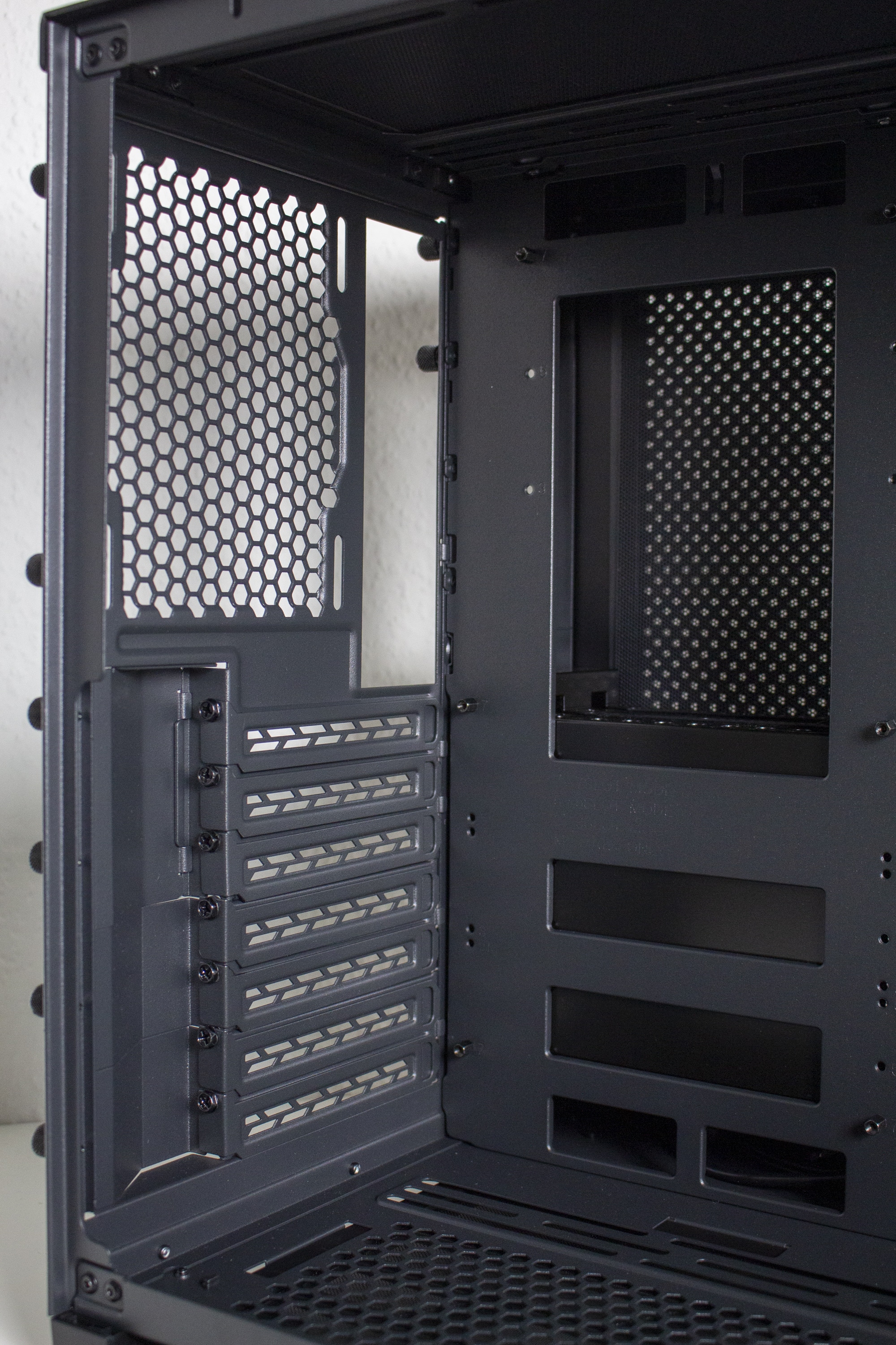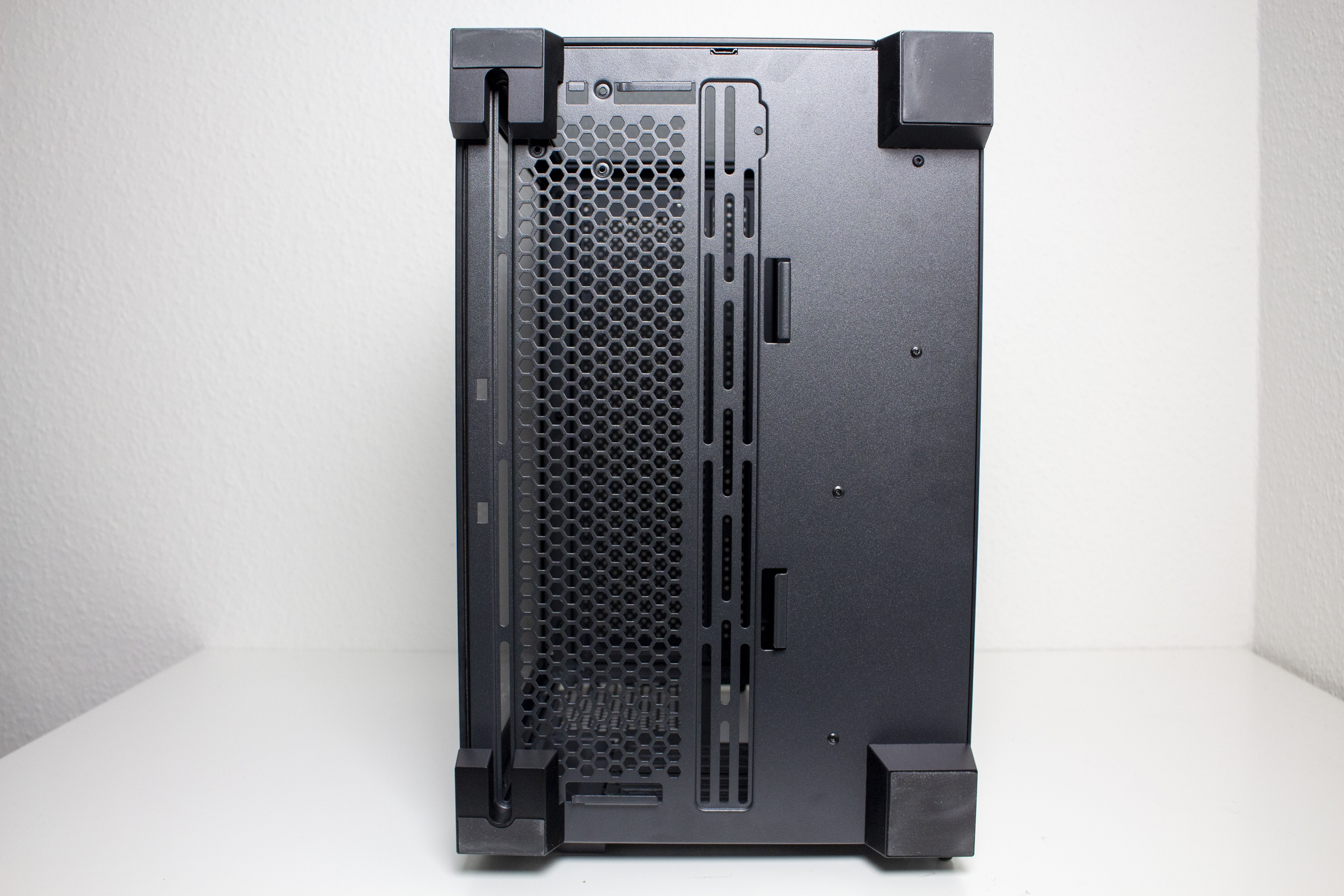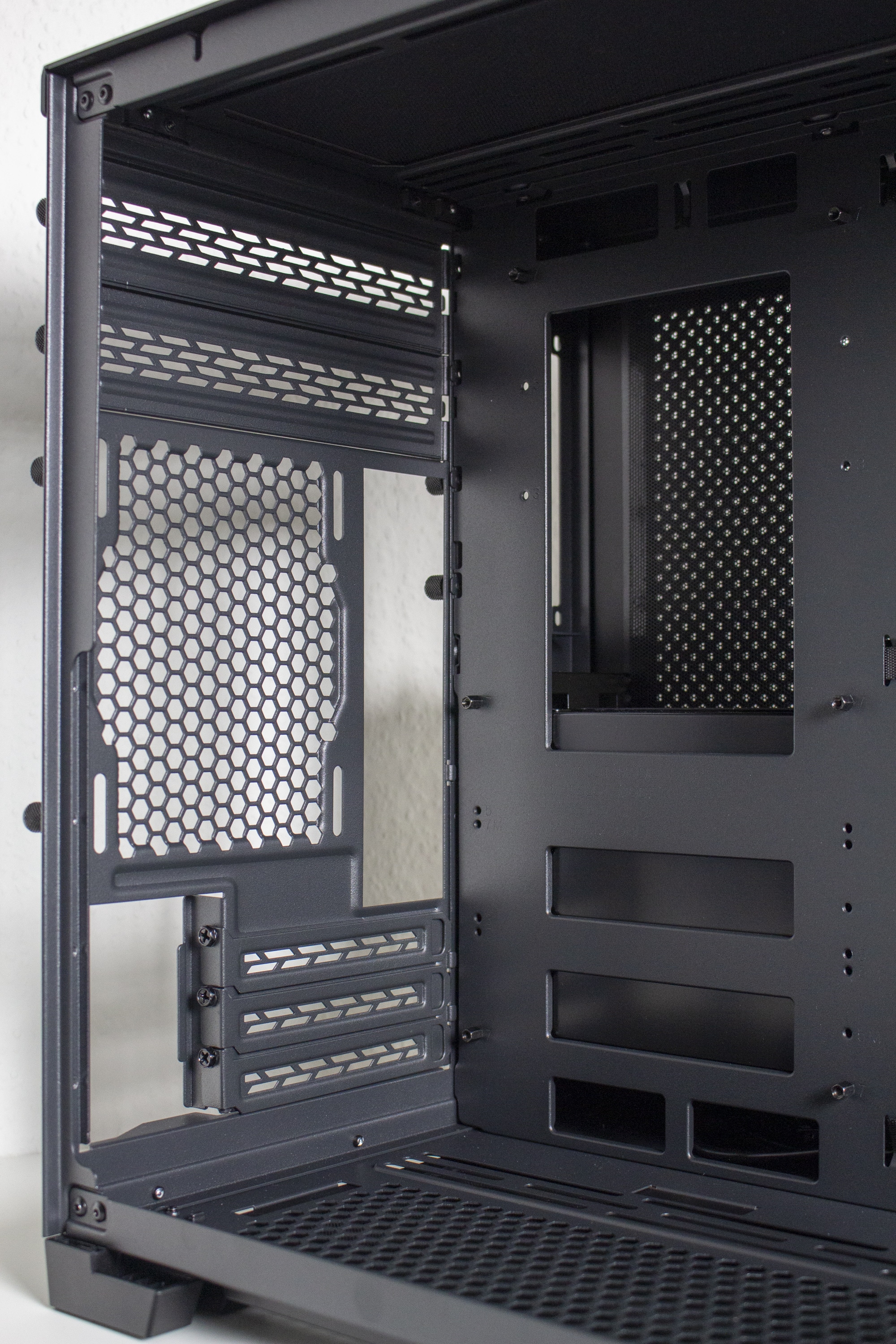 Der rechte Bereich der Rückseite bietet viel Platz und Montageschienen für Lüfter oder Radiatoren. Maximal ist hier Platz für einen 280-Millimeter-Radiator. Die Luftzufuhr erfolgt dabei über die gefilterte Öffnung im Seitenteil.