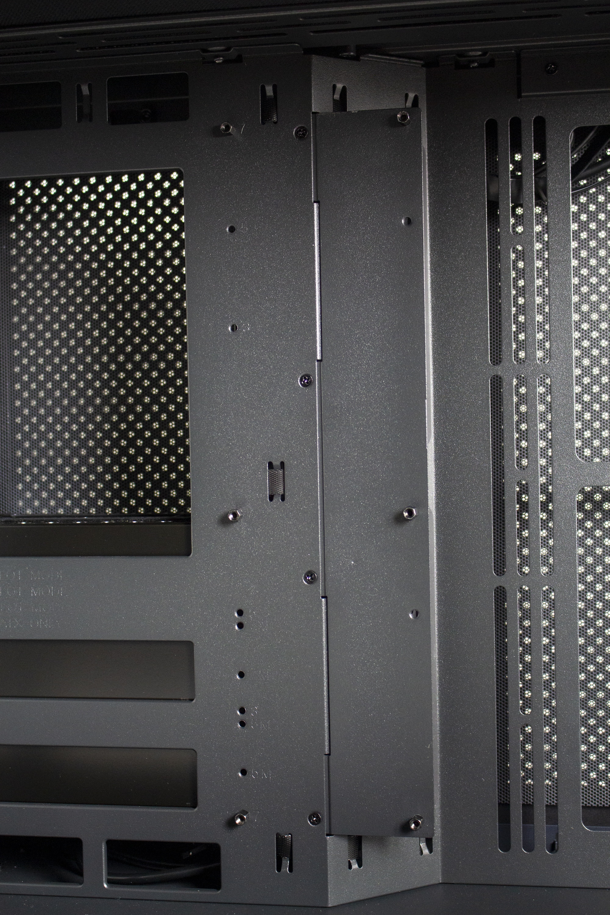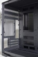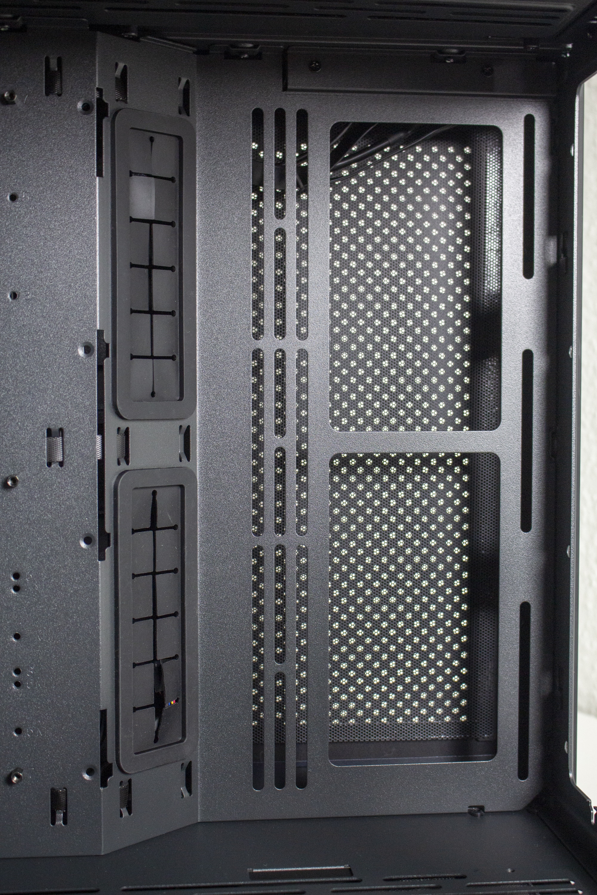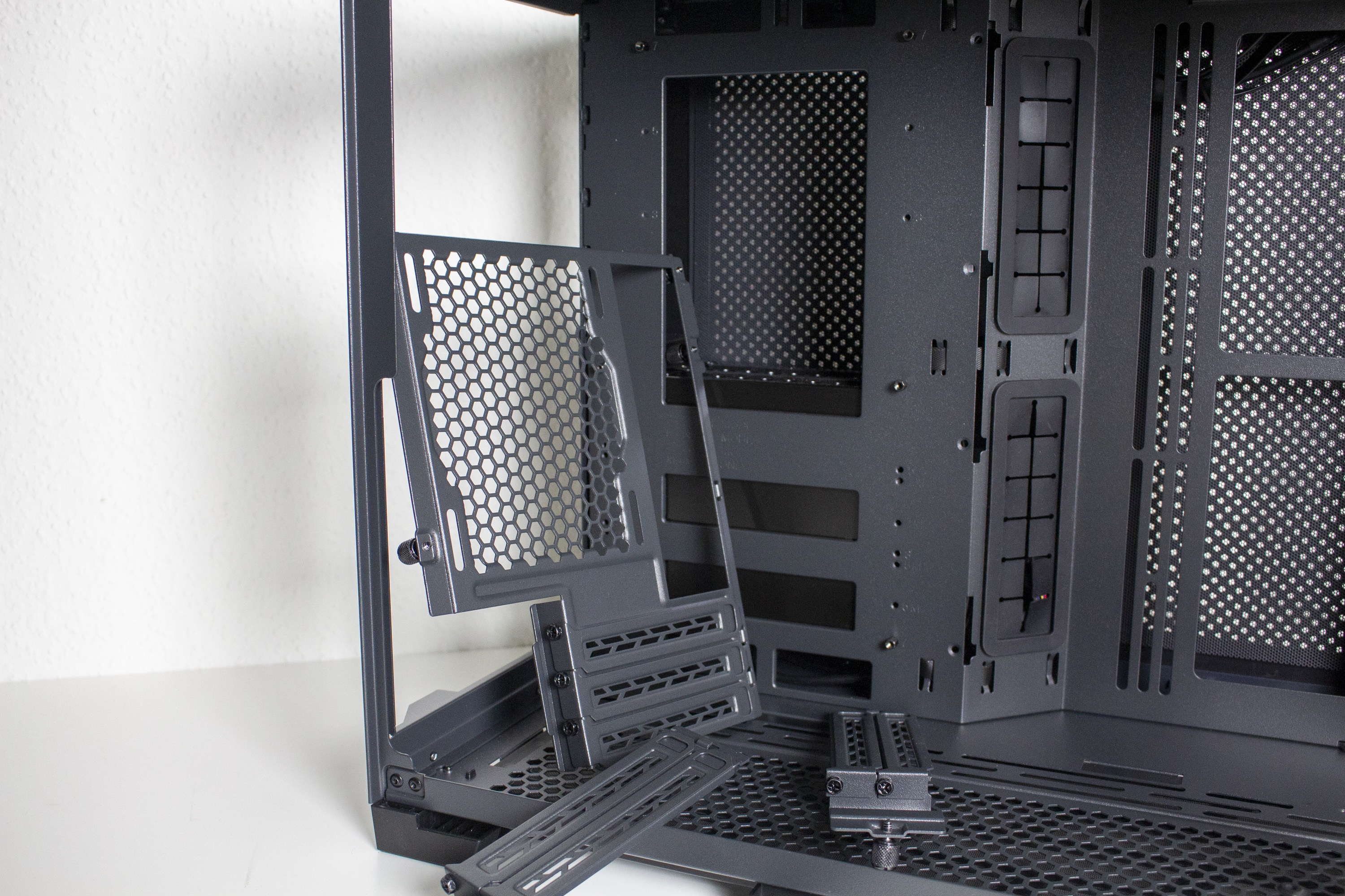 Der rechte Bereich der Rückseite bietet viel Platz und Montageschienen für Lüfter oder Radiatoren. Maximal ist hier Platz für einen 280-Millimeter-Radiator. Die Luftzufuhr erfolgt dabei über die gefilterte Öffnung im Seitenteil.