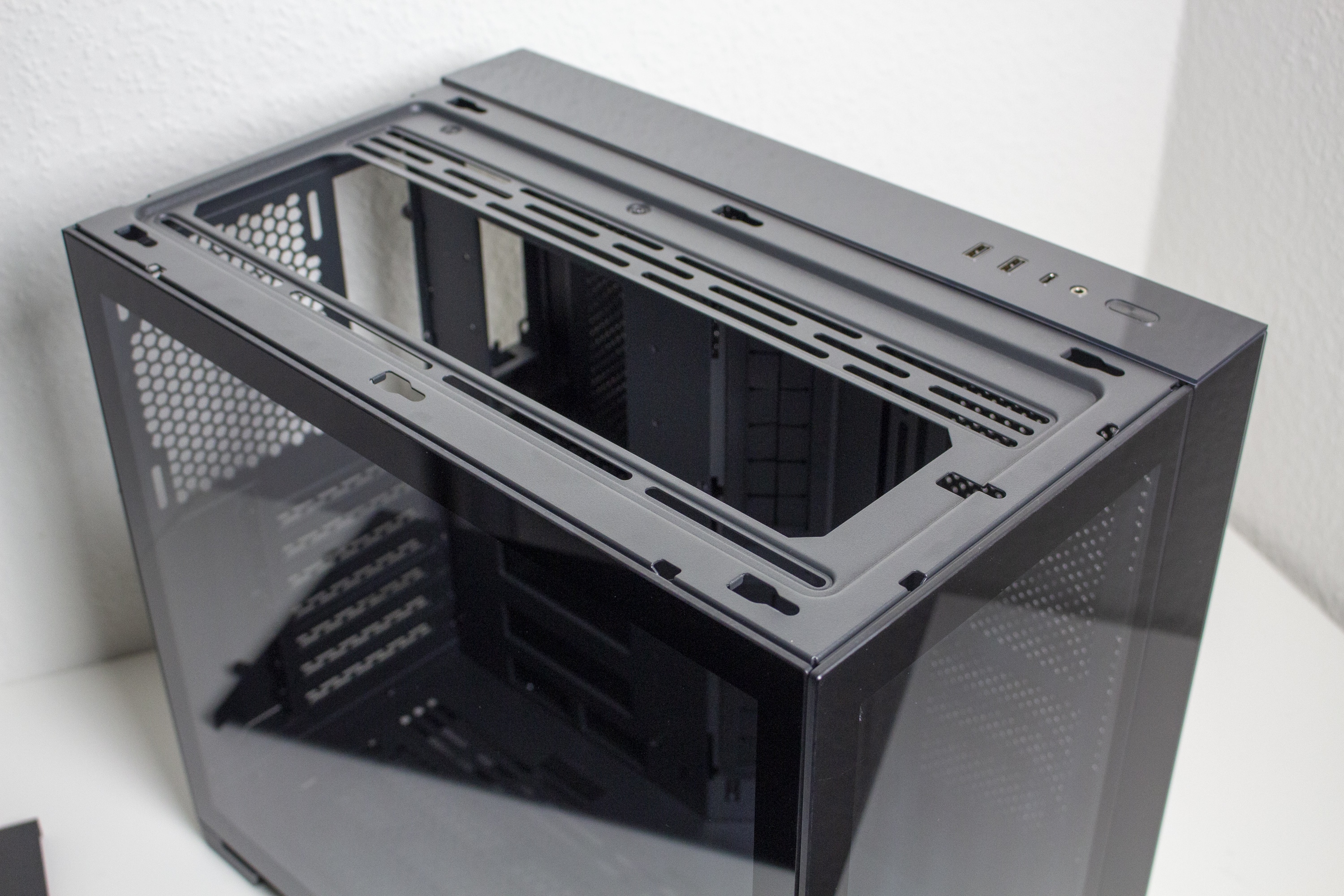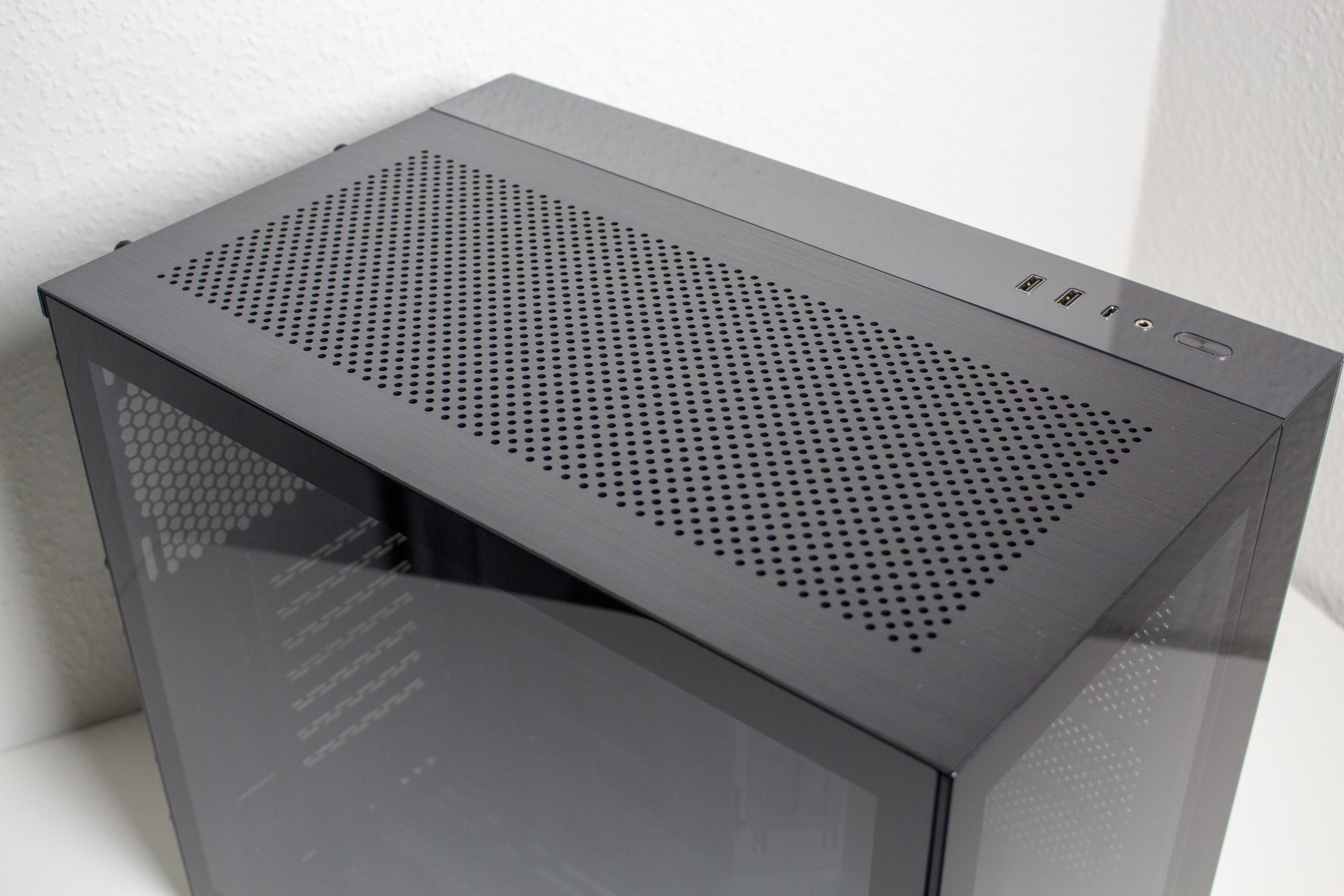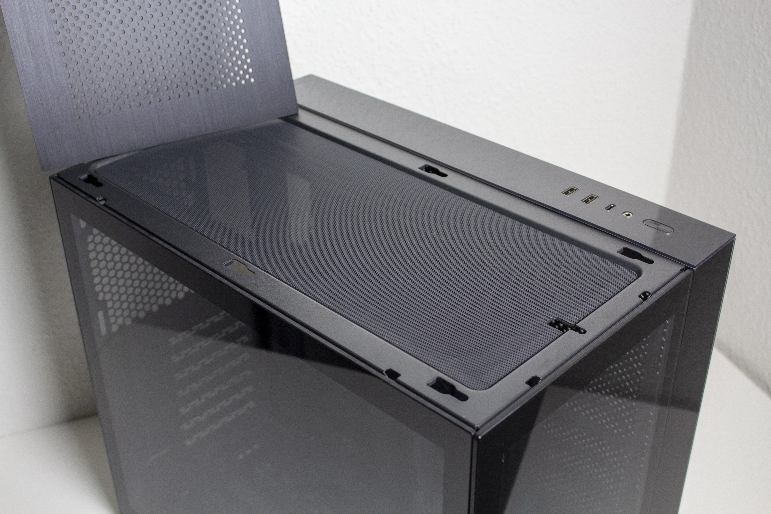 Der Deckel ist hingegen auf einen hohen Airflow ausgelegt. So verfügt das Aluminiumpanel über ein großes Lüftergitter unter dem sich ein magnetischer Meshfilter befindet. Entfernt man zwei Rändelschrauben an der Rückseite, kann der Deckel abgenommen werden. Entsprechend zur Front ist auch der rechte Teil des Deckels aus Glas gefertigt. Dort findet sich auch das länglich angebrachte I/O-Panel. Vorhanden sind hier zwei USB 3.0 Typ-A und ein USB 3.1 Typ-C-Anschluss. Außerdem lassen sich dort noch ein Power-Taster (blau beleuchtet) und ein HD-Audio-Comboport entdecken.