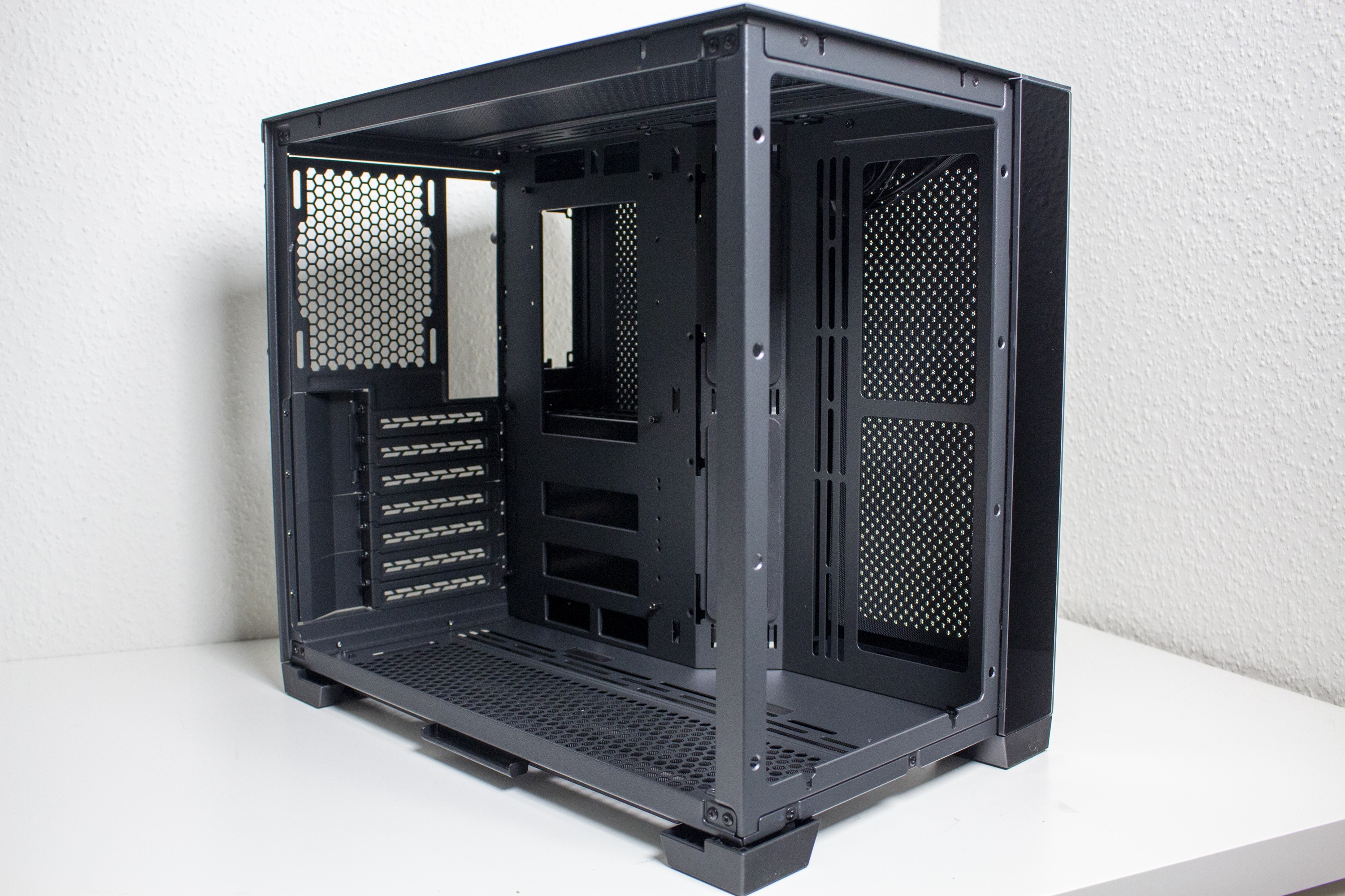 Ein besonderes Feature des Lian Li PC-O11 Dynamic Mini ist aber seine Modularität. So können durch Anpassung der Gehäuserückseite Mainboards in mit verschiedenen Formfaktoren verbaut werden, ohne dass das Gehäuse leer aussieht. Möglich sind ein Aufbau mit sieben Slots für ATX-Mainboards, einer mit fünf Slots für Mikro-ATX-Mainboards und ein letzter mit drei Slots für Mini-ITX-Mainboards. Je nach Konstellation gibt es dann mehr Platz für Radiatoren unter oder über dem Mainboard. Diese Lösung wirkt sehr durchdacht und bietet eine maximale Flexibilität.