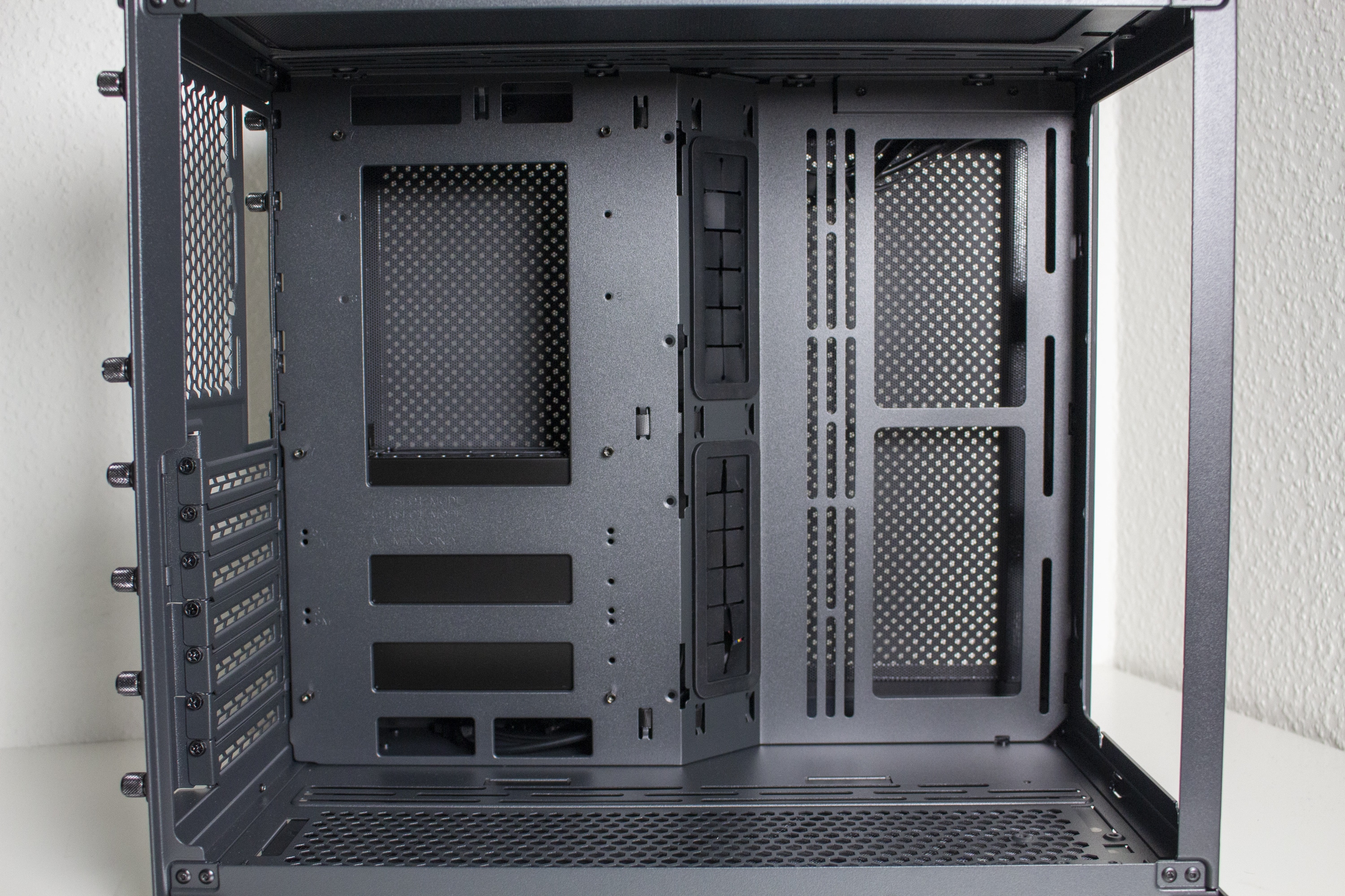 Wie für ein modernes Gehäuse zu erwarten ist, geht es im Innenraum sehr geräumig zu und typisch für ein Cube-Gehäuse ist dieser vertikal in zwei Bereiche unterteilt. Da der vordere Bereich jedoch die größeren Besonderheiten bietet, werfen wir im ersten Schritt einen Blick hinter das Mainboard-Tray.