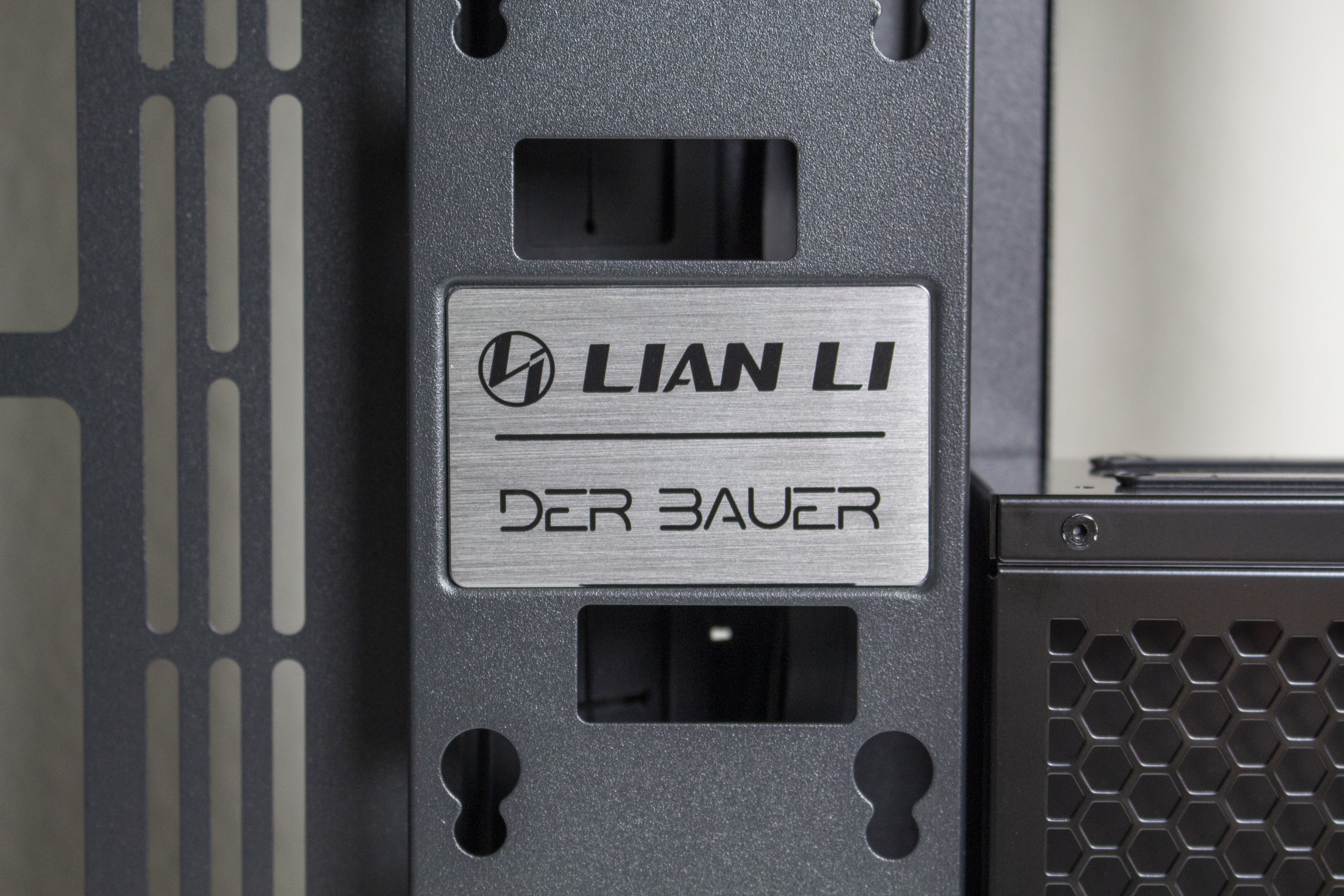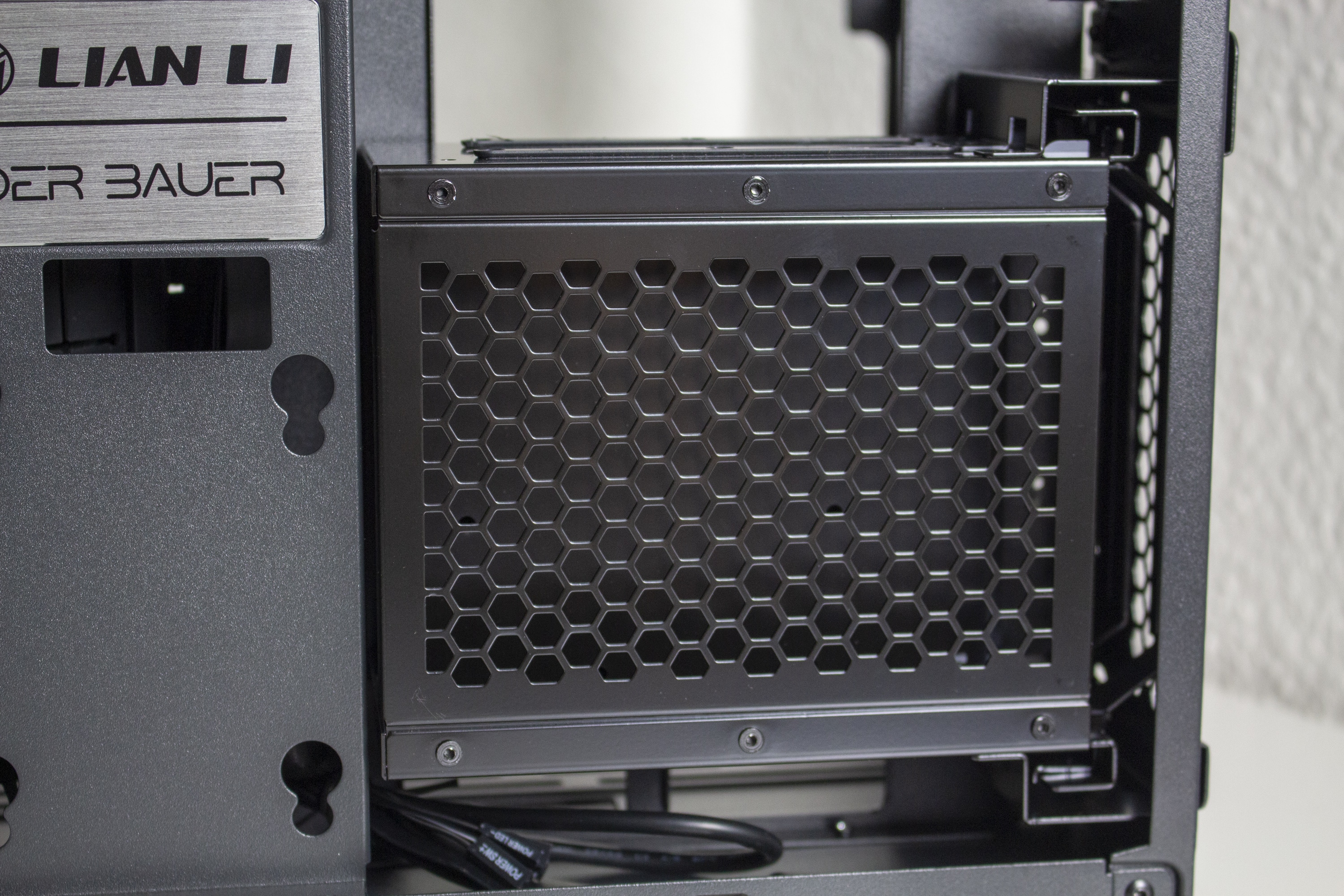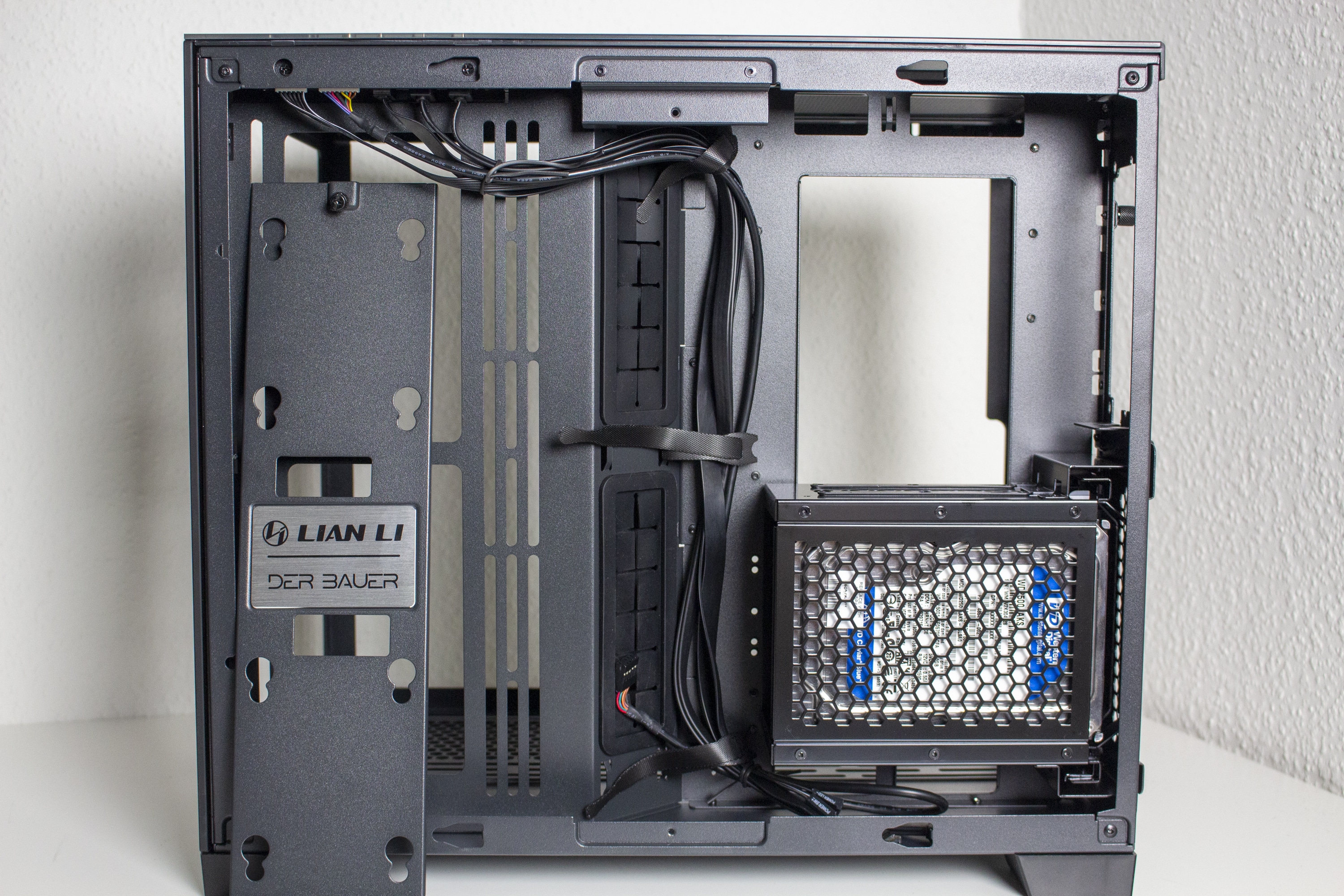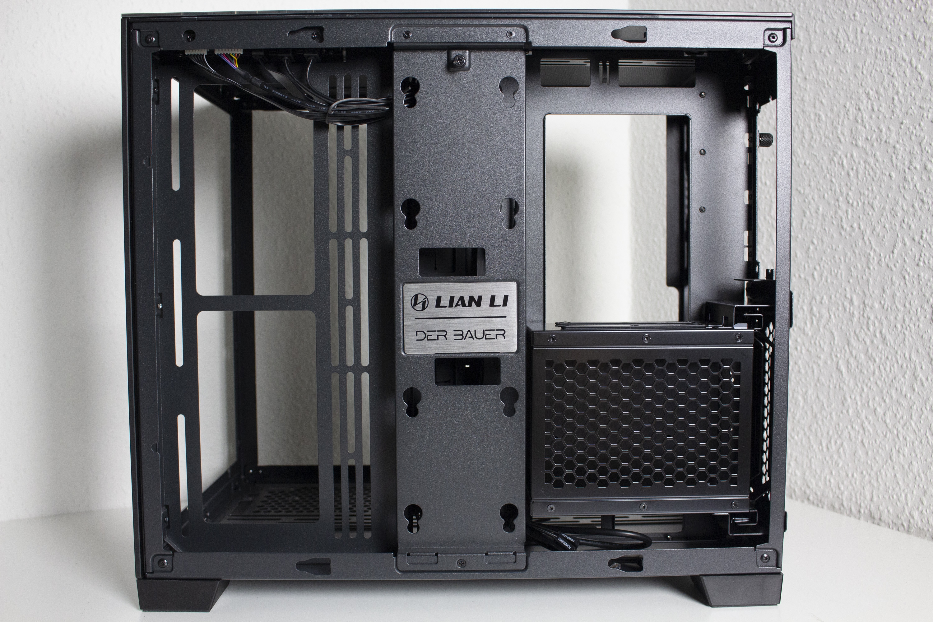 Entfernt man das rückwärtige Sidepanel, dann wird man direkt von einer HDD-Halterung für zwei 2,5″-Datenträger begrüßt. Außerdem wurde auf dieser Halterung eine Platte mit den Logos des Herstellers und des Profi-Übertakters Roman „der8auer“ Hartung angebracht. Nach Entfernung diese Rahmens mittels einer Rändelschraube, kommen dahinter der Montageplatz für das SFX- bzw. SFX-L-Netzteil und ein solider HDD-Käfig für zwei 3,5″ oder 2,5″-HDDs zum Vorschein. Sowohl der Käfig als auch die Rahmen sind vollständig aus Stahl und verfügen über entkoppelnde Elemente. Die Kammer bietet außerdem sehr viel Platz zum Verstecken von überflüssigen Kabeln und praktische Klett-Kabelbinder.