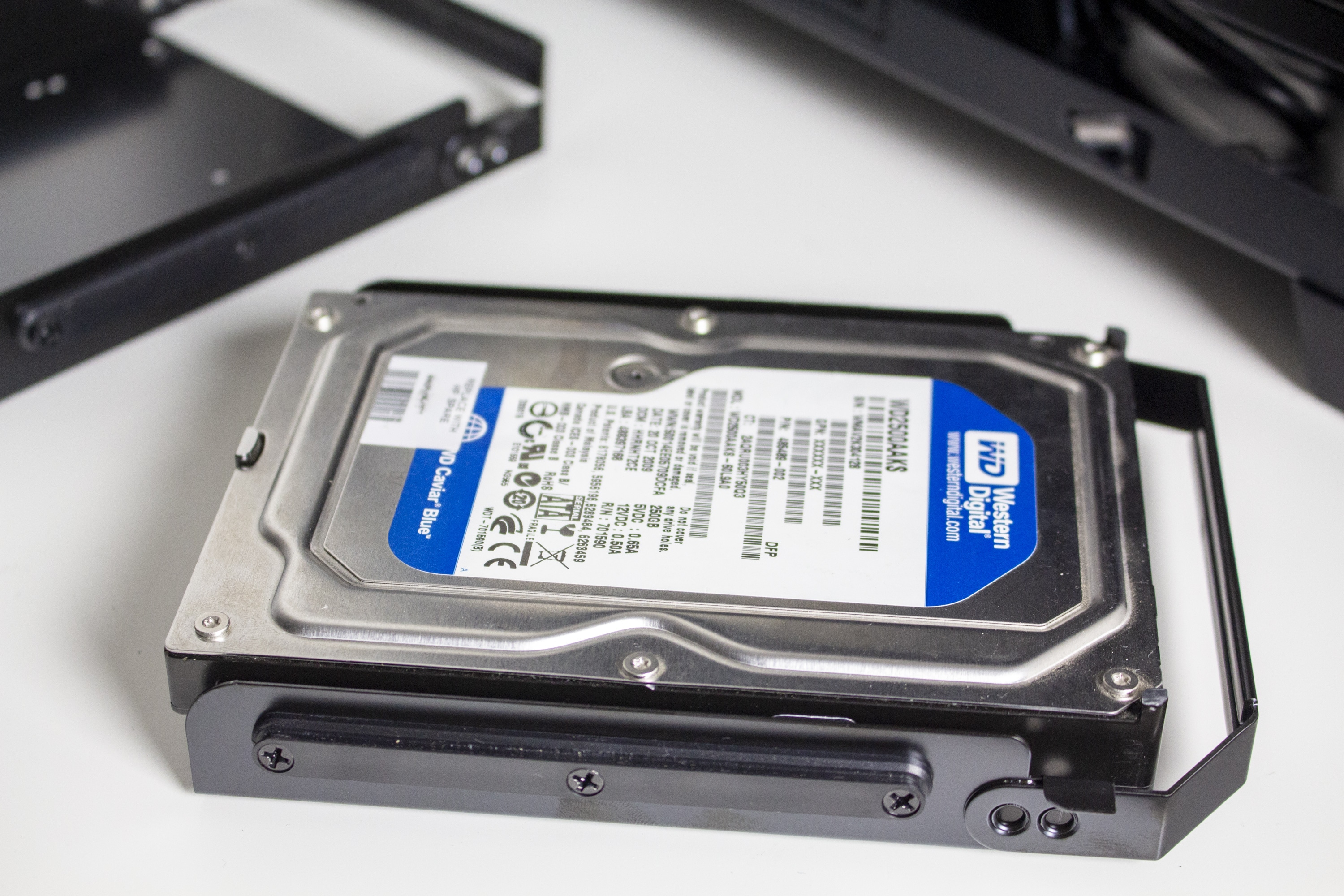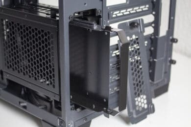 Die Befestigung der Festplatten erfordert in jedem Fall die Verwendung von Werkzeug. Große Festplatten werden mit dem Stahlrahmen verschraubt und zurück in den Käfig geschoben. Die Entkopplung soll über dünne Kunststoff- bzw. Gummischienen erfolgen. 2,5″-Geräte werden über Gummiringe in die entsprechende Halterung am vertikalen HDD-Rahmen geschoben.