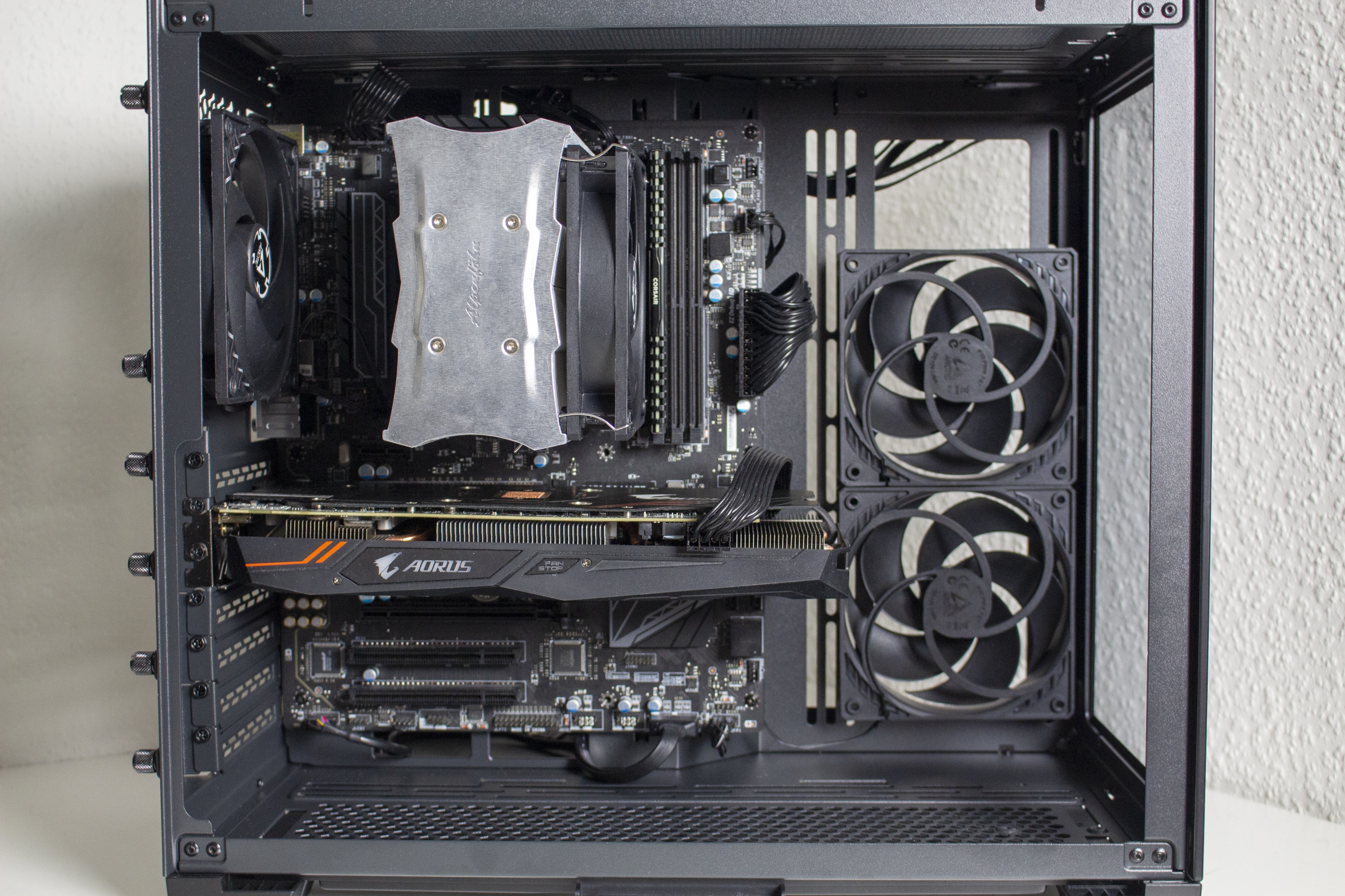 Nun kommen wir zum Systemeinbau. Als Hardware verwenden wir einen AMD Ryzen 5 1400* auf einem MSI B350 PC Mate mit 16GB Crucial Ballistix Sport LT grau DDR4-2666. Der Ryzen wird von einem EKL Alpenföhn Matterhorn Pure gekühlt und ist auf 3,8 GHz (1,25V) übertaktet. Für die Bildausgabe ist eine GTX 1060 6GB von Gigabyte AORUS zuständig. Die Stromversorgung erledigt das voll-modulare Corsair SF Series SF450 mit einem Effizienzgrad von 80 Plus Gold.