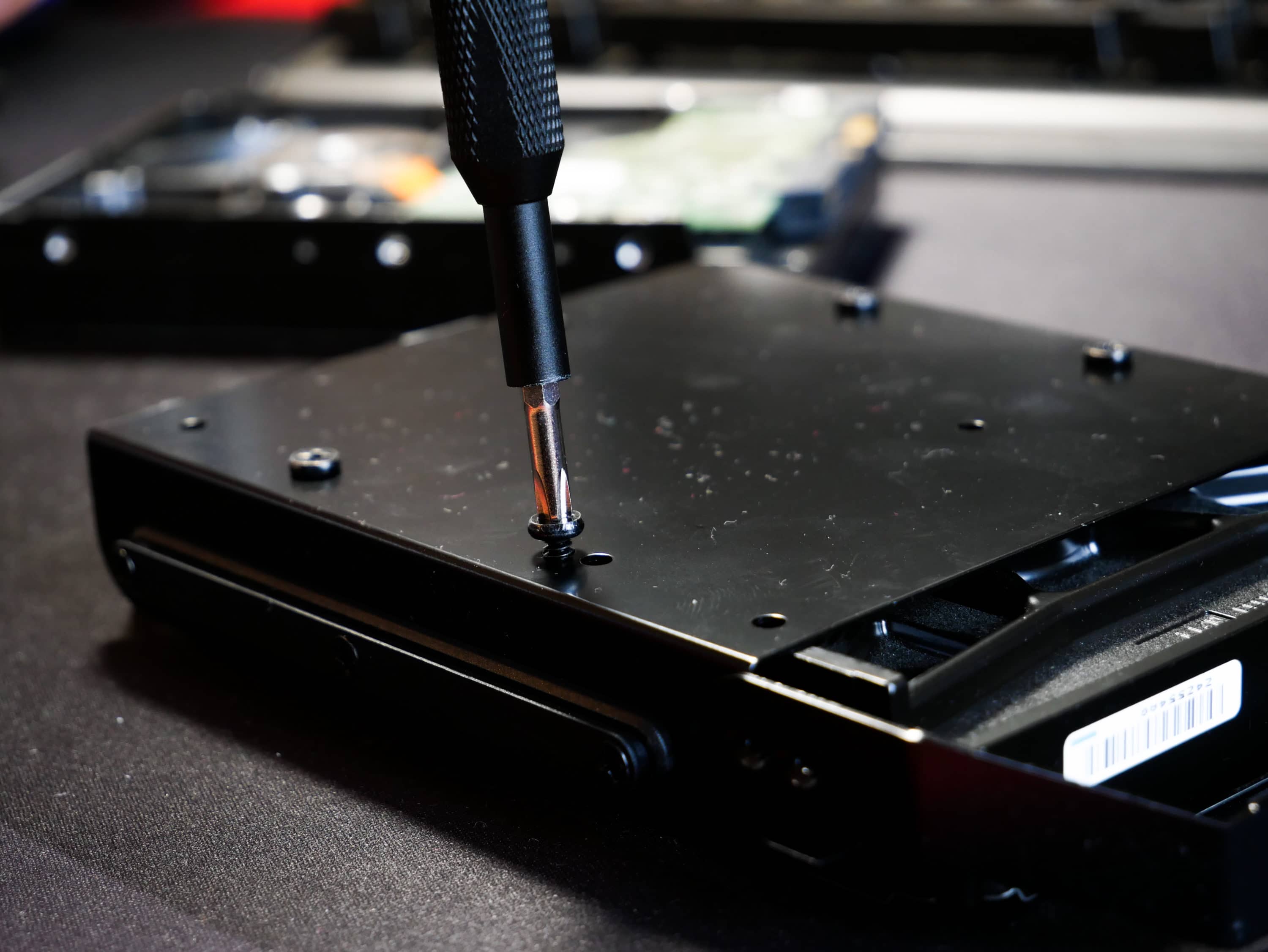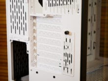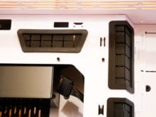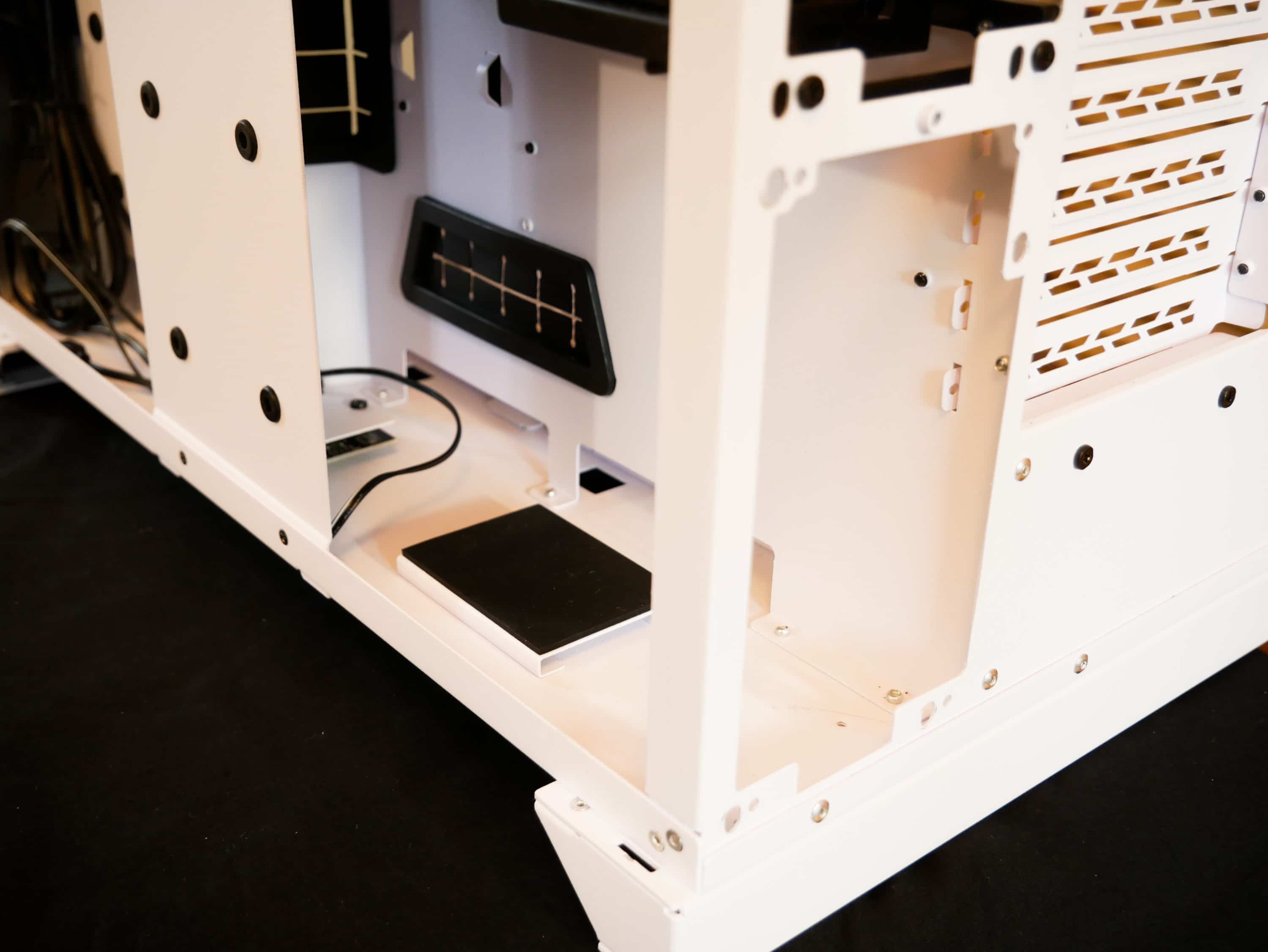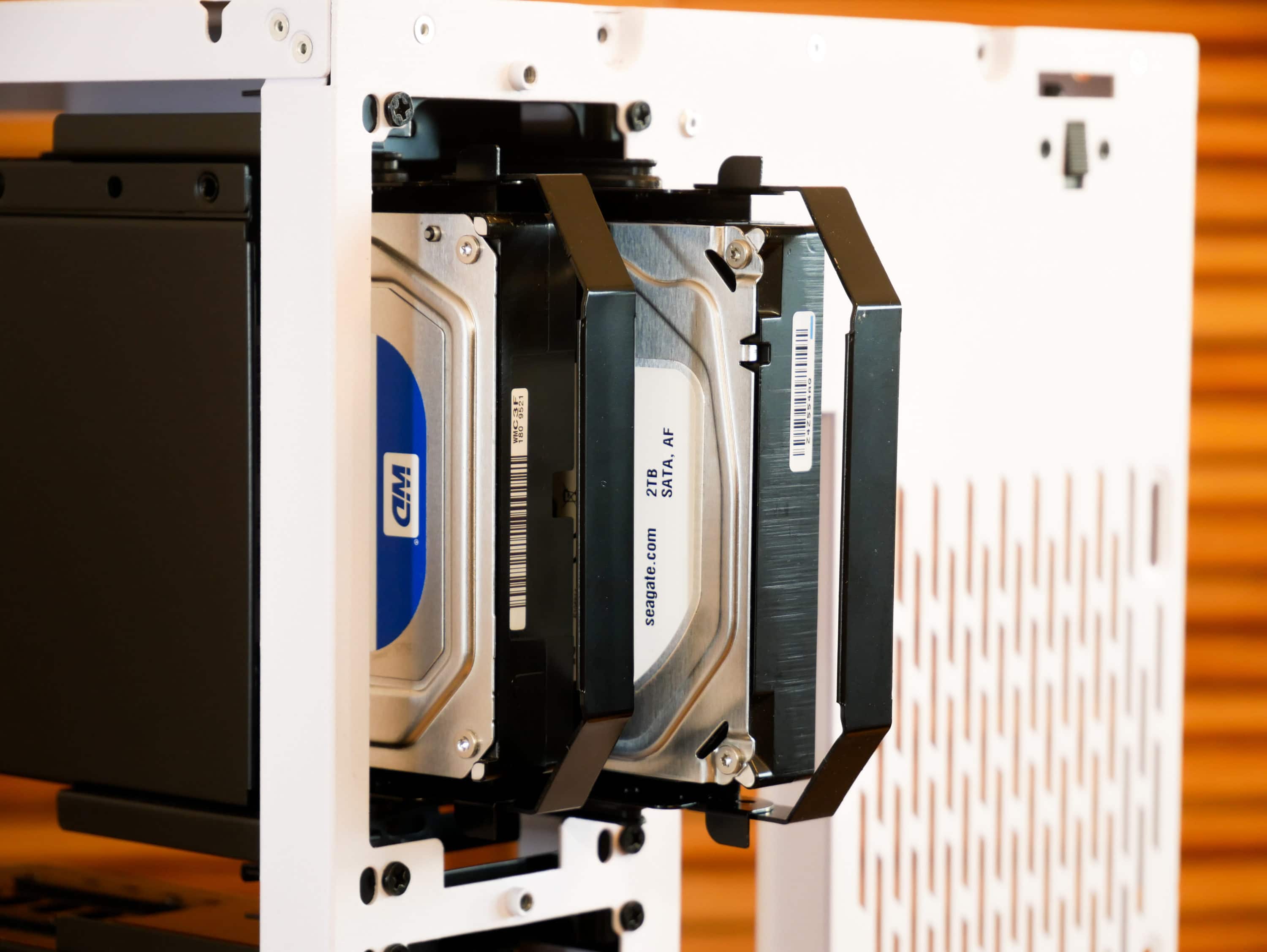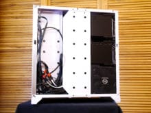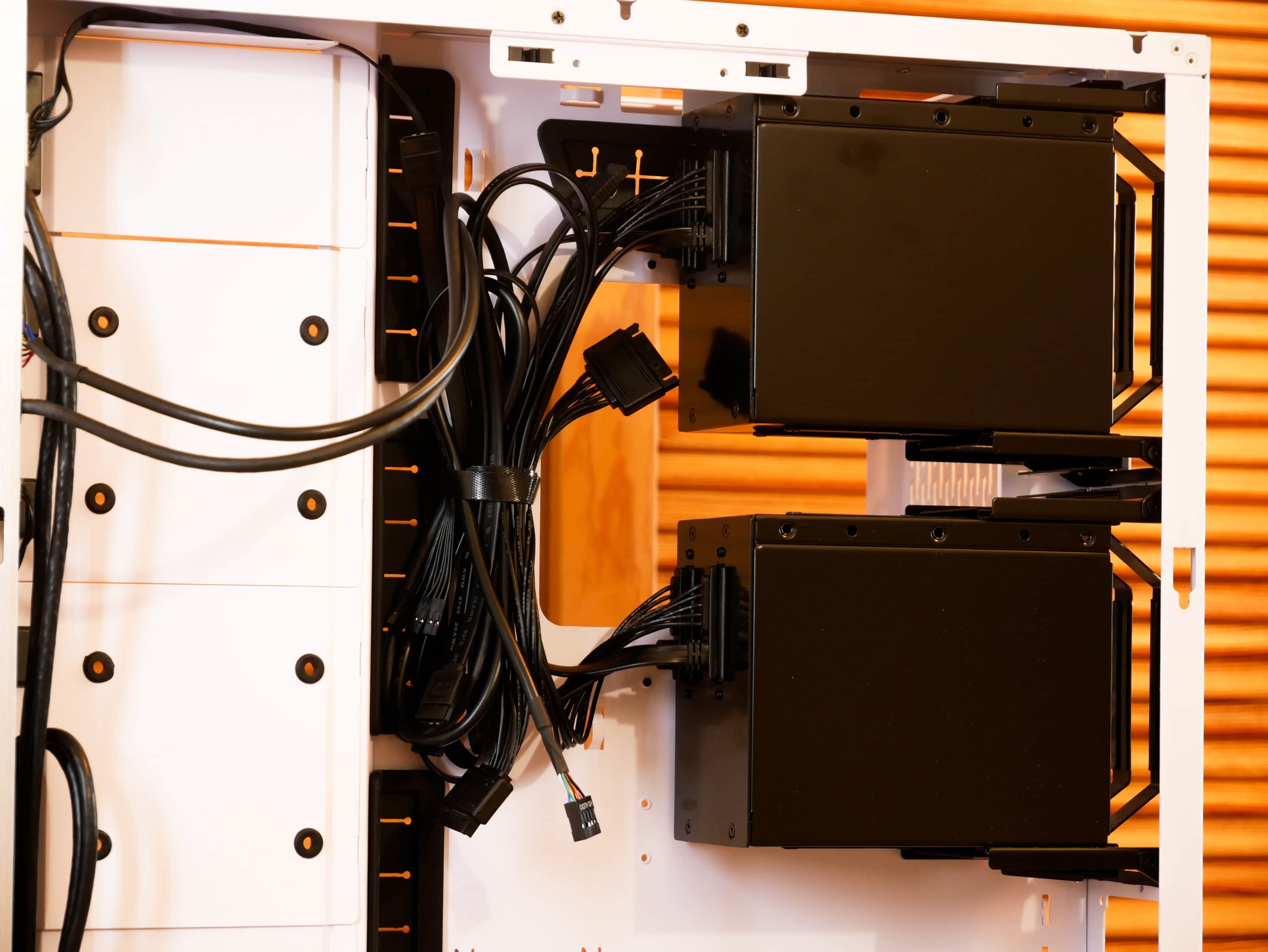 In der rechten Kammer kommen alle Laufwerke, das Netzteil und die Kabel unter. Rückseitig zugänglich sind die vier 2,5/3,5-Zoll-Laufwerksschächte, welche einzeln entnommen werden können und Hot-Swappable sind. Die Laufwerksschächte kann man auch entfernen und durch ATX-Netzteile ersetzen, sollte das nötig sein. Drei 2,5-Zoll-Laufwerke finden auch an den abnehmbaren Schlitten rechts neben dem Mainboard-Tray Platz. Diese können aber auch entfernt werden, um weitere 120-mm-Lüfter oder maximal einen 360er-Radiator anzubringen. Weitere drei 2,5-Zoll-Laufwerke haben hinter dem Mainboard-Tray an einer extra Verstrebung Platz. An allen Stellen, die eine gute Luftzufuhr oder Abluft brauchen, gibt es nach außen hin genügend Lüftungsschlitze.