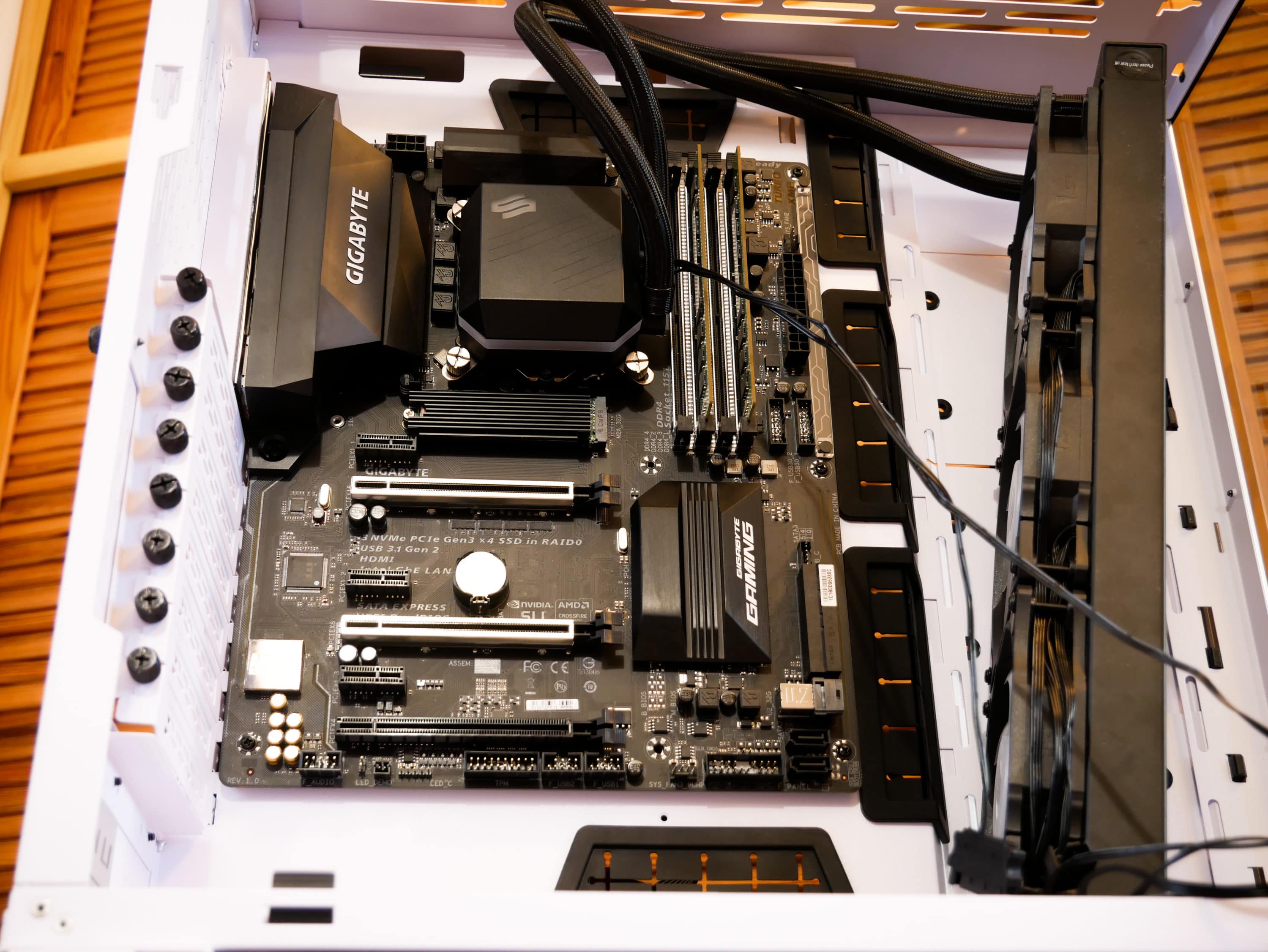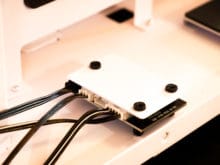 Für den Systembau wird ein Intel i7 6700K auf deinem Gigabyte Z270 Ultra Gaming und 16 GB Arbeitsspeicher verwendet. Die Kühlung des auf 4,2 GHz getakteten Prozessors übernimmt eine 360-mm-AiO-Wasserkühlung von SilentiumPC. Die Bildausgabe übernimmt eine NVIDIA GeForce GTX 980 Ti im Referenzdesign, die ebenfalls von einer All-in-One-Wasserkühlung gekühlt wird. Das ganze System wird von einem 750 Watt Netzteil von Thermaltake mit Strom versorgt. Für eine schönere Optik sorgt ein gesleevtes Kabelverlängerungsset von CableMod in Weiß-Schwarz.