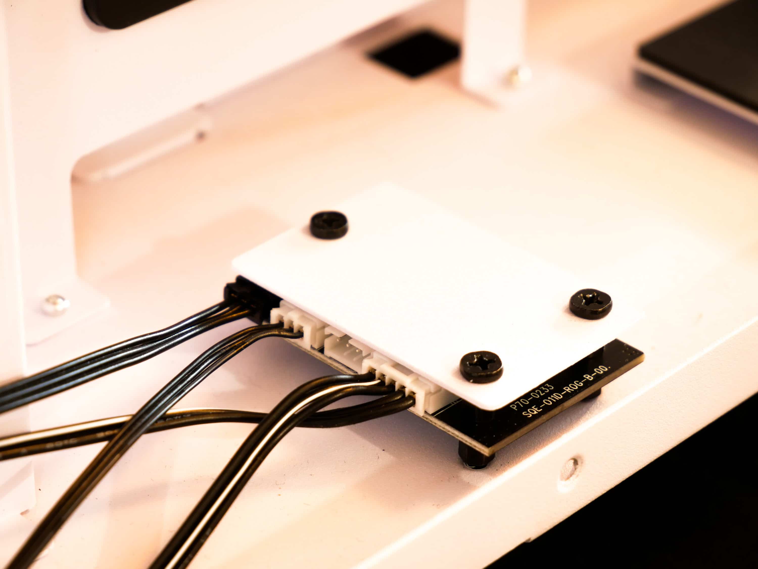 Für die digital adressierbare Steuerung der Beleuchtung hat Lian Li dem Case extra einen eigenen RGB-LED-Controller spendiert. Dieser steuert entweder den RGB-Streifen selbst mithilfe der beiden Knöpfe am I/O-Panel, oder kann das Signal direkt von einem Mainboard durchschleifen. Dazu ist ein 3-Pin-D5VG-Anschluss (xx_x) notwendig.