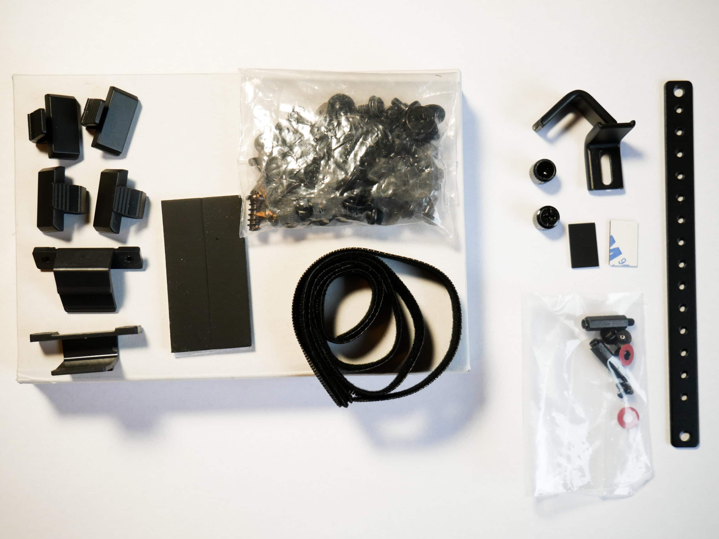 In einem kleinen Karton, der in den von hinten zugänglichen Laufwerksschächten steckt, befindet sich das Montagezubehör. Dazu gehören unterschiedliche Schrauben für die Installation von SSDs und Festplatten, sowie Klett-Kabelbinder für ein perfektes Kabelmanagement.