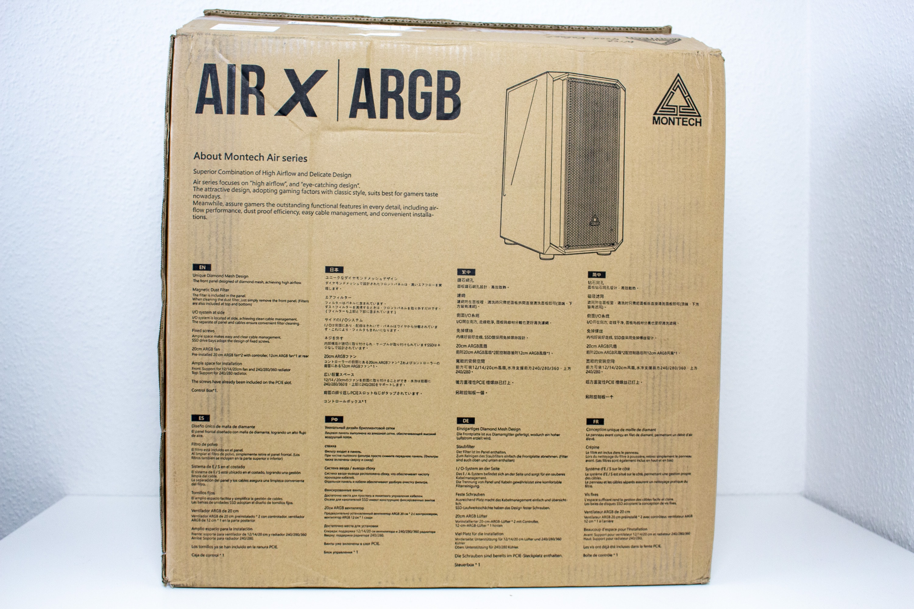Das Montech Air X ARGB kommt verpackt in einem braunen Karton mit schwarzer Schrift. Innerhalb des Kartons ist der Tower von zwei Blöcken aus normalem Styropor und einer Folie aus Kunststoff umhüllt. Aufgrund des Gewichts von ca. 7,3 Kilogramm hätten die Blöcke aber durchaus etwas stabiler gestaltet werden können.