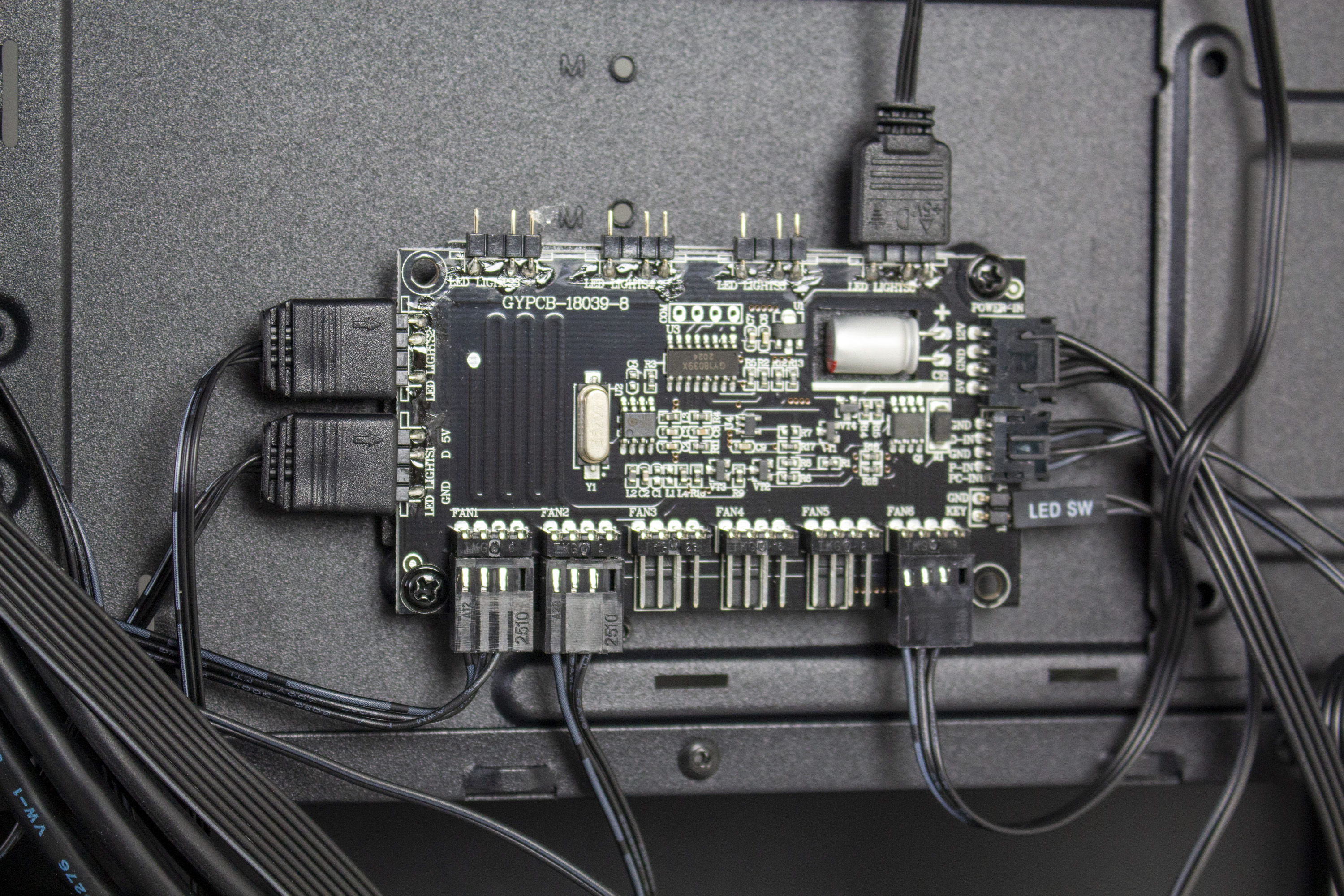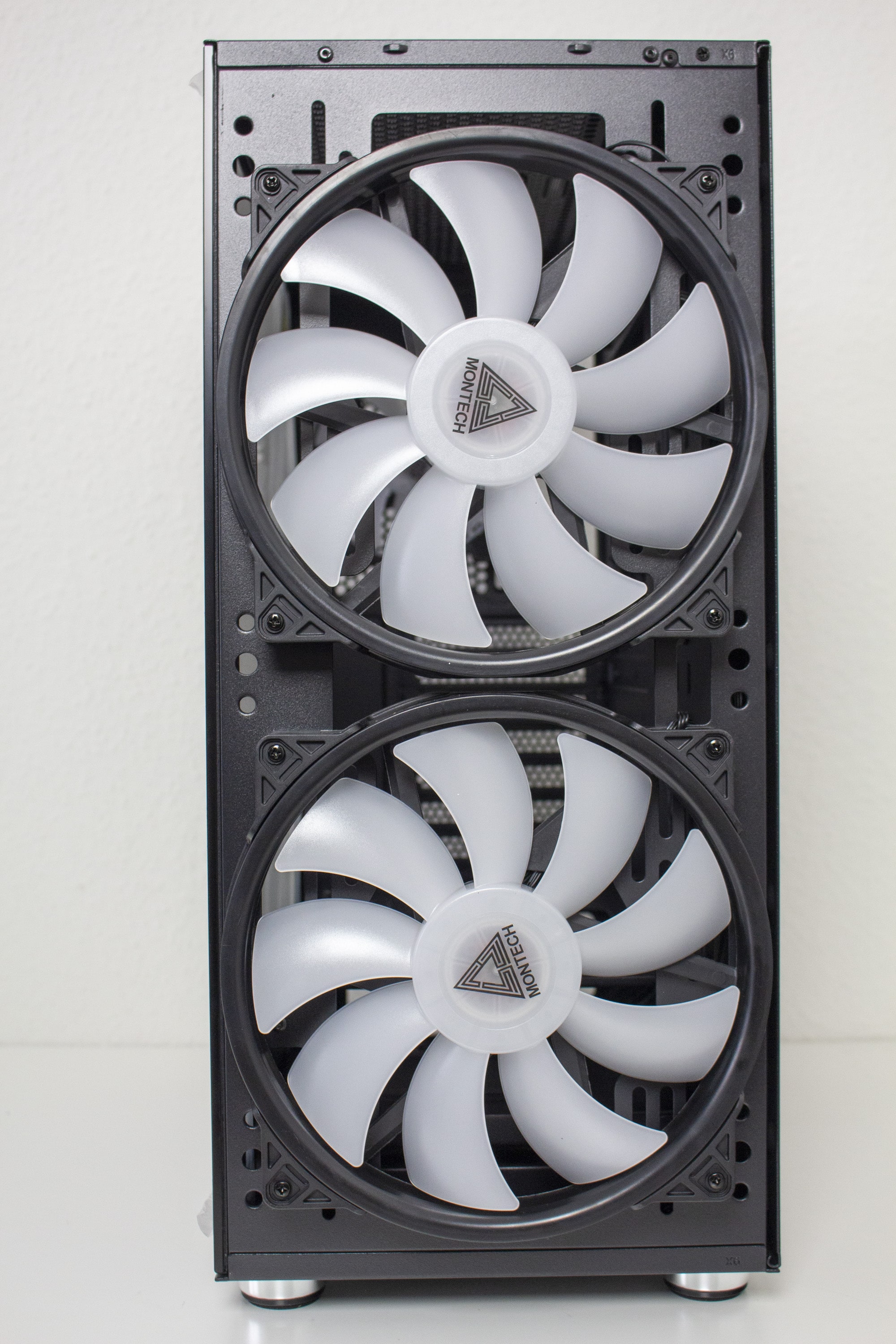 Ab Werk verbaut Montech im Air X drei Lüfter. In der Front kommen zwei besonders große 200-Millimeter Lüfter zum Einsatz. Diese verfügen über digital-adressierbare LEDs und drehen mit maximal 700 Umdrehungen pro Minute. Im Heck kommt zusätzlich ein 120-Millimeter Lüfter zum Einsatz. Auch dieser verfügt über LEDs, dreht aber mit maximalen 1300 Umdrehungen pro Minute. Alle Lüfter sind milchig-weißt gestaltet und werden per 3-Pin-Kabel mit der Steuerplatine auf der Rückseite verbunden. Über diese kann deren Geschwindigkeit zentral über einen einzelnen Mainboard-Anschluss gesteuert werden. Die Stromversorgung der Platine erfolgt über SATA.
