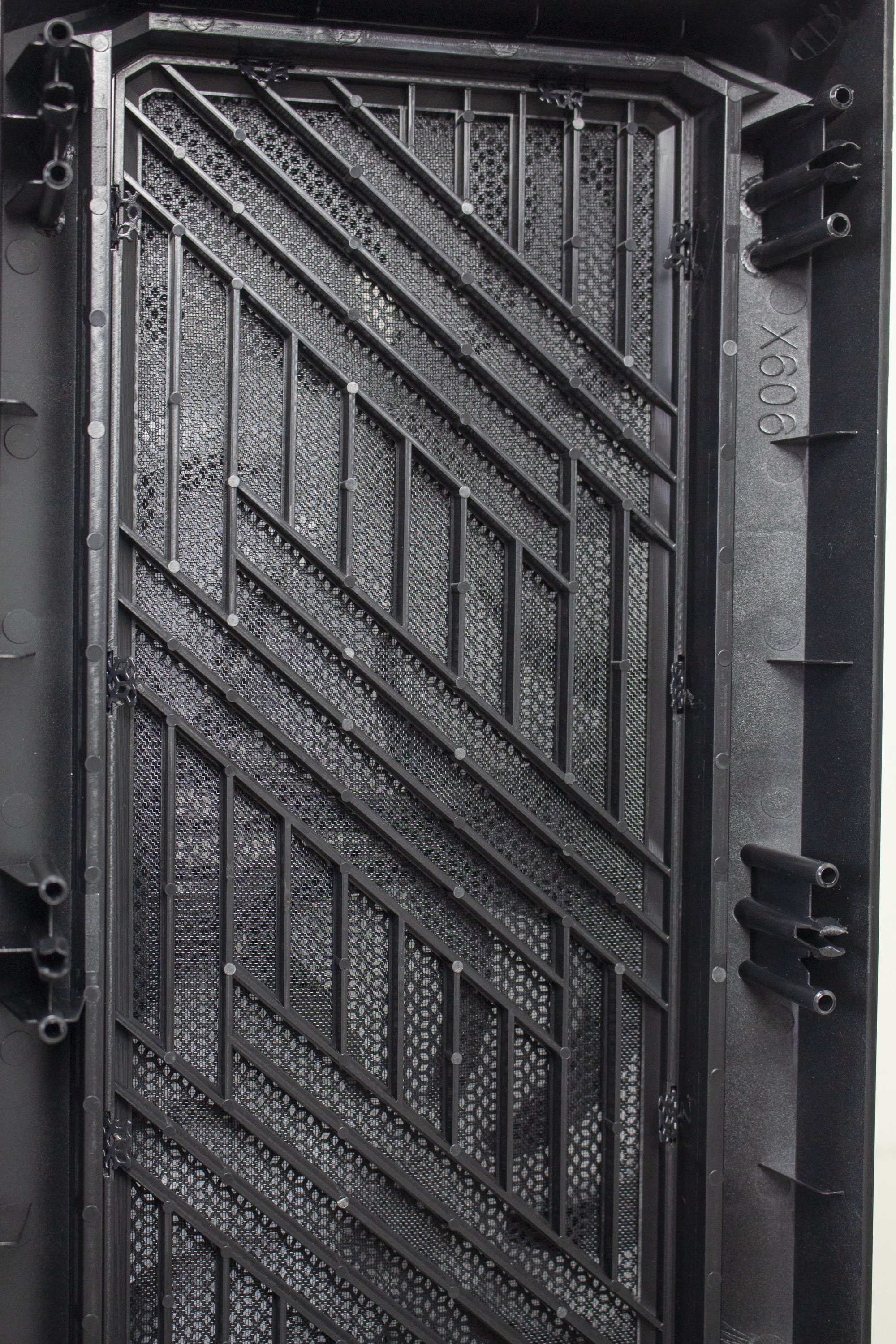 Äußerlich wagt Montech bei Air X keine großen Experimente und setzt lieber auf altbewährte Materialien und eine zeitlose Optik. So besteht der Tower fast vollständig aus Stahl. Lediglich das Frontpanel verfügt über einen Rahmen aus stabilem Kunststoff. Der größte Teil des Frontpanels besteht allerdings aus einem Mesh in Form von Diamanten. Hinter dem Mesh befindet sich zudem ein zusätzlicher Staubfilter, der aber leider fest mit dem Frontpanel verbunden ist. Zieht man die Front ab, kommen die zwei vorinstallierten 200-Millimeter-Lüfter zum Vorschein. Alternativ können hier auch drei 140- oder drei 120-Millimeter-Lüfter verbaut werden.