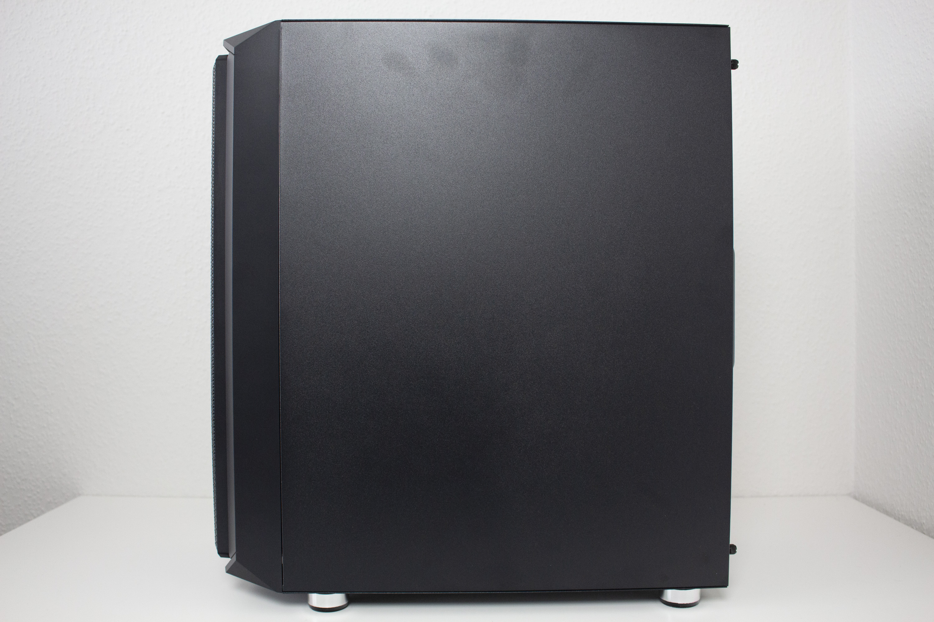 Wie es sich für ein modernes Gehäuse mit RGB-Effekten gehört, ist das linke Seitenteil aus einem 4 Millimeter starken gehärtetem Glas gefertigt. Beim Montagesystem verzichtet Montech vollständig auf seitliche Rändelschrauben und klebt das Glas stattdessen auf einen Stahlrahmen. Das ermöglicht ein sauberes Erscheinungsbild und vereinfacht die Montage. Auf der linken Seite setzt der Hersteller auf ein Sidepanel aus herkömmlichen Stahl. Das Seitenteil ist 0,7 Millimeter stark und verfügt am hinteren Ende über eine Ausziehhilfe sowie zwei normale Rändelschrauben zur Befestigung.