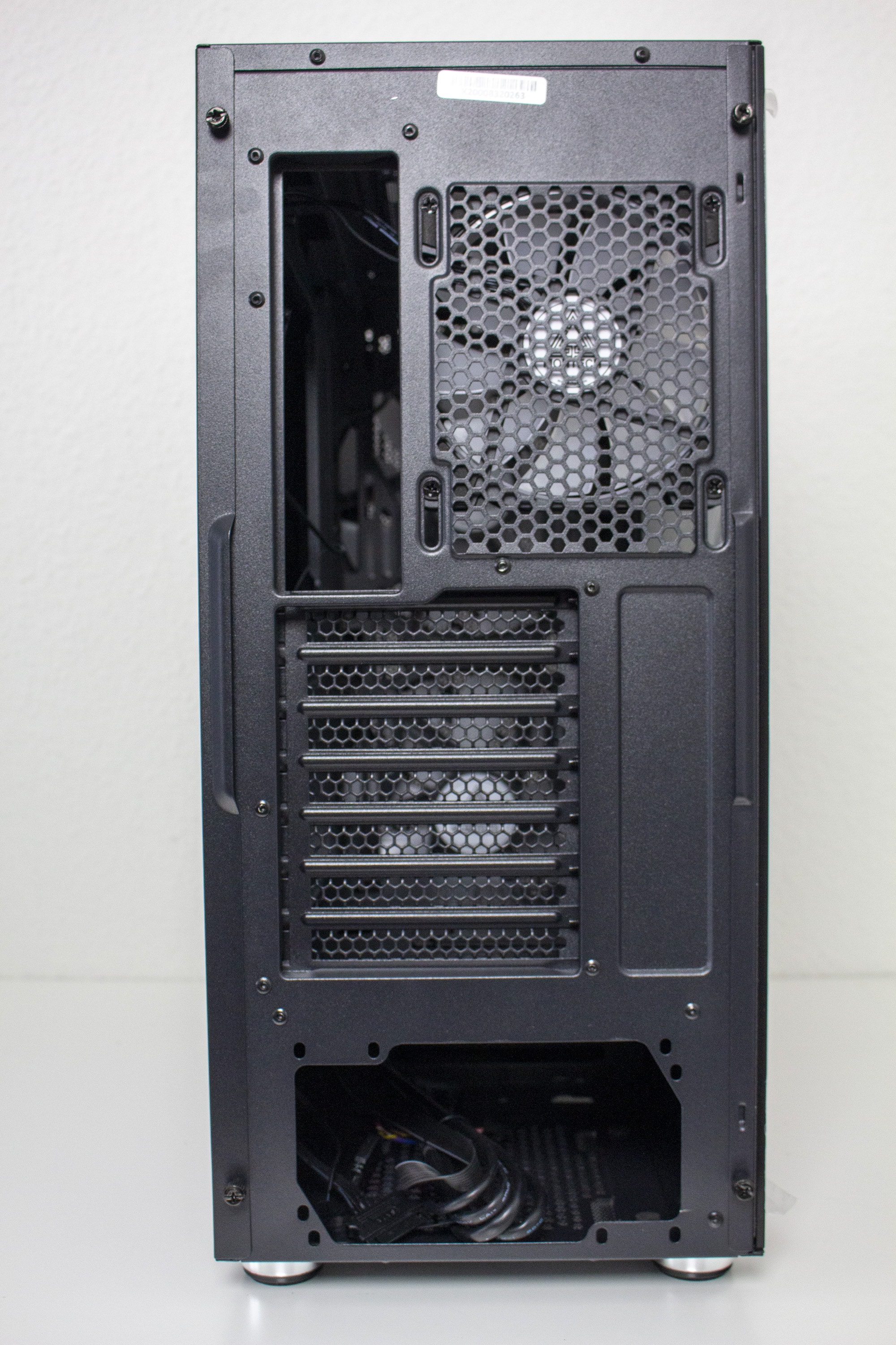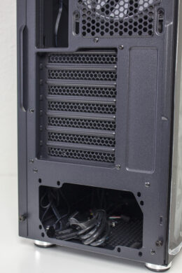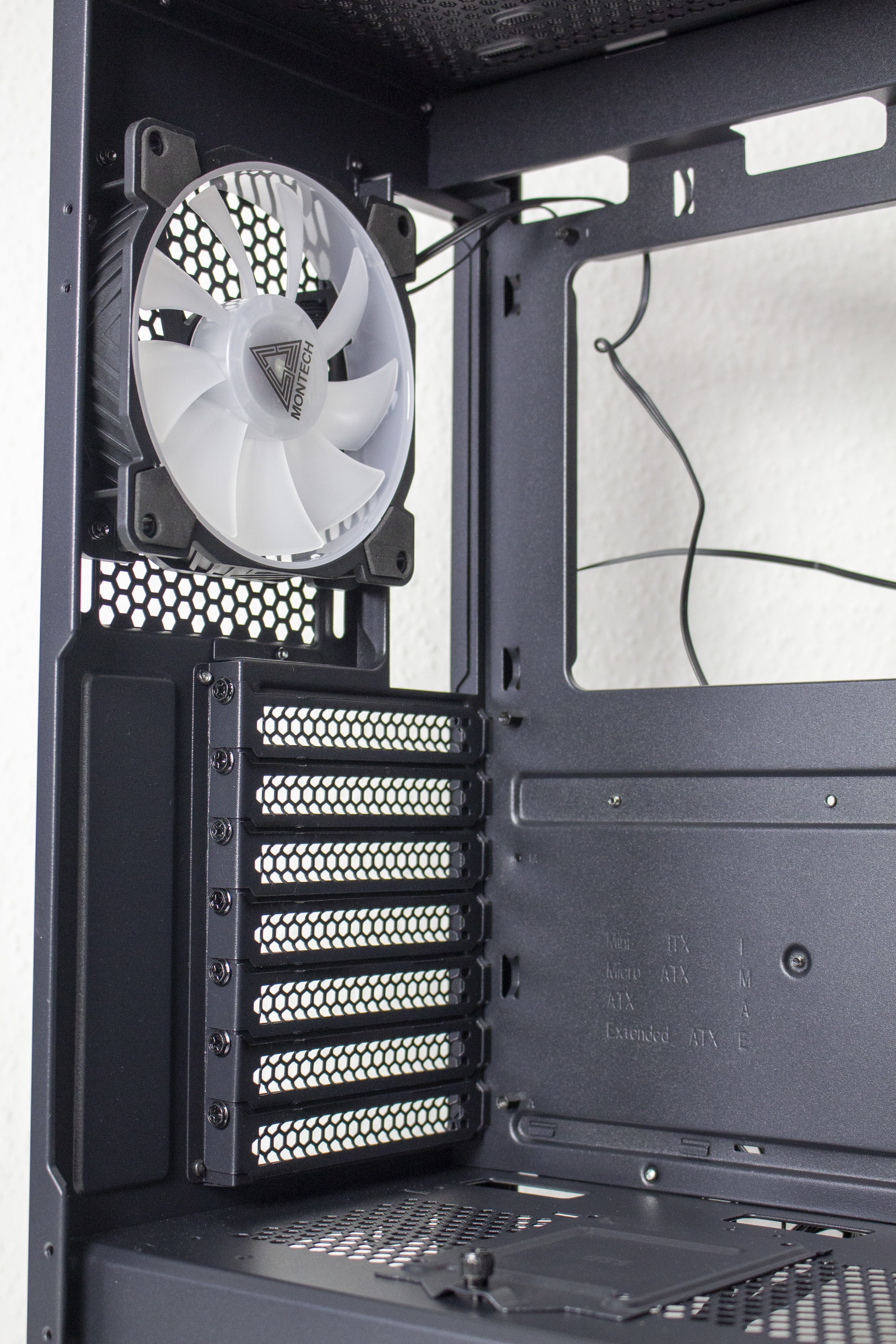 Das Heck des Air X ARGB verbirgt keine großen Überraschungen. Das Netzteil wird im Boden platziert und kann, durch die acht Bohrungen, wahlweise mit dem Lüfter nach oben oder unten montiert werden. Darüber finden sich sieben wieder verwendbare PCI-Slotblenden, die im Innenraum verschraubt wurden. Im oberen Bereich hat Montech den dritten vorinstallierten Gehäuselüfter untergebracht.