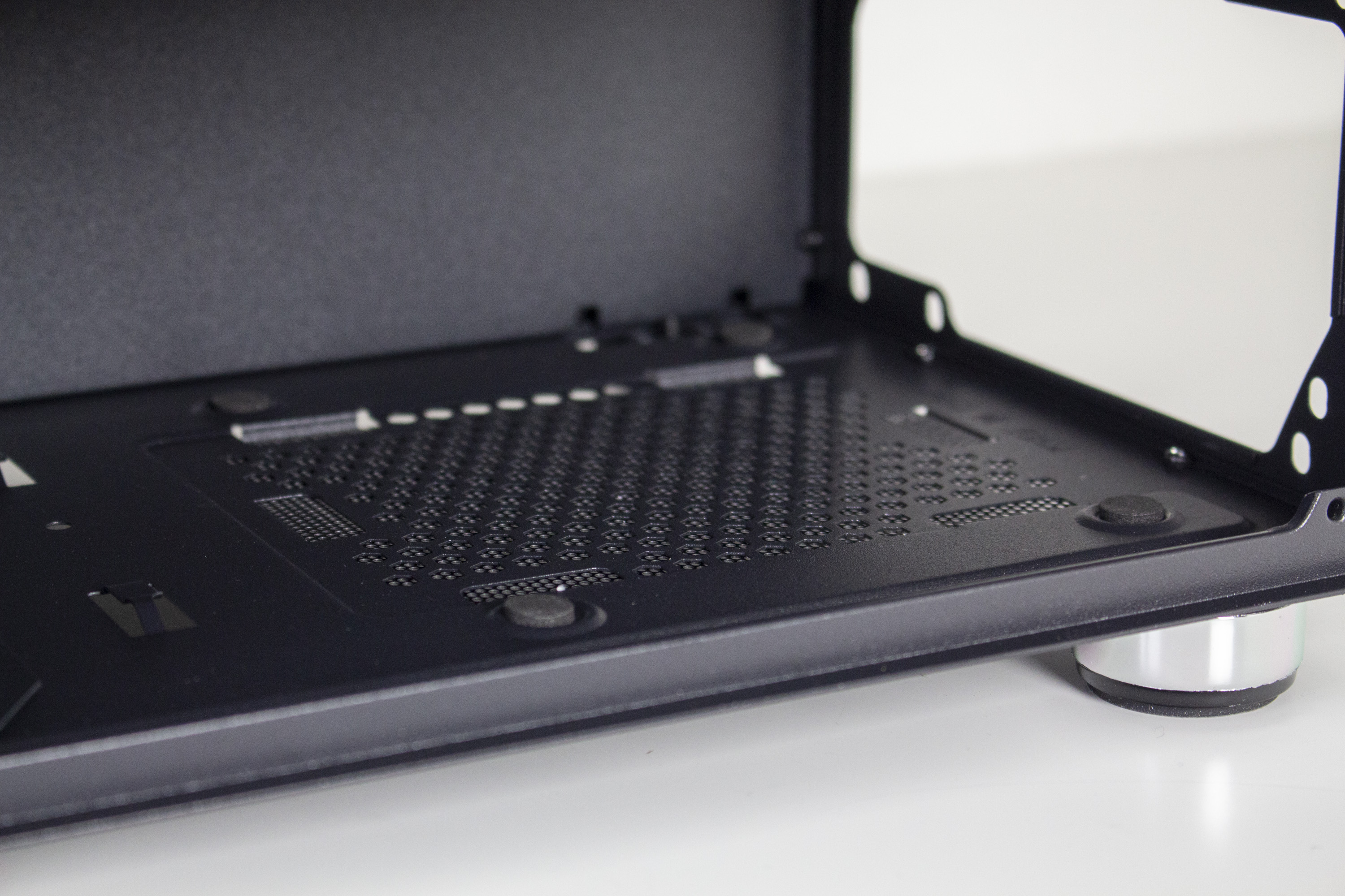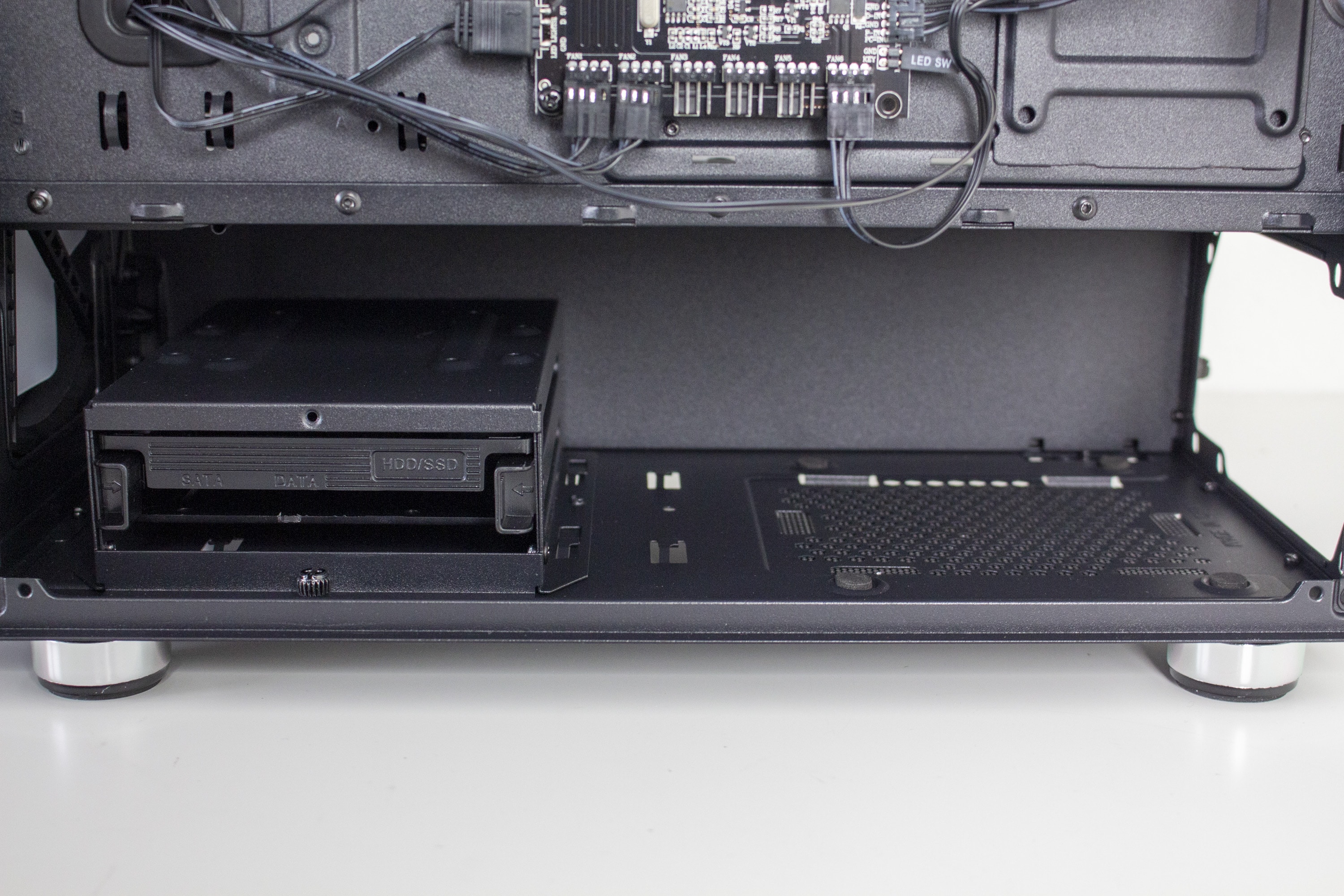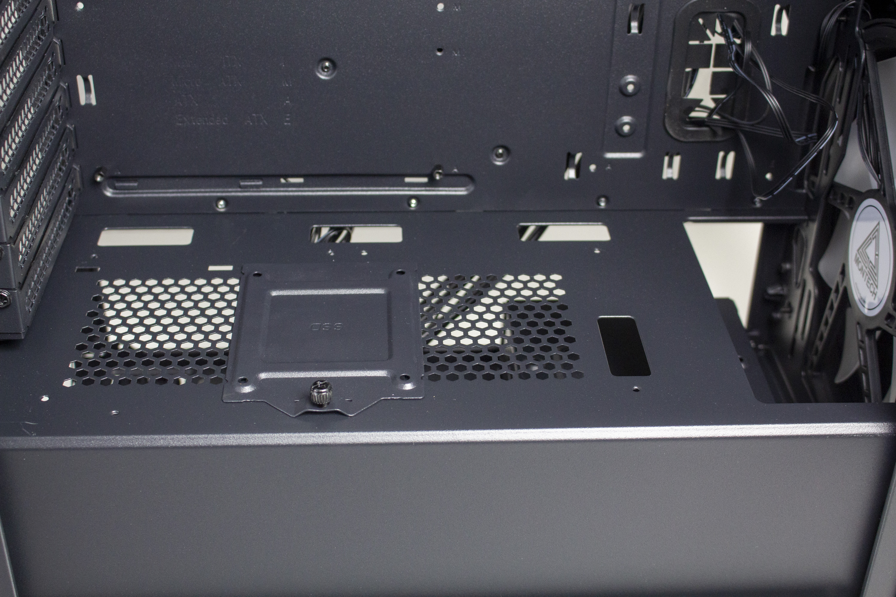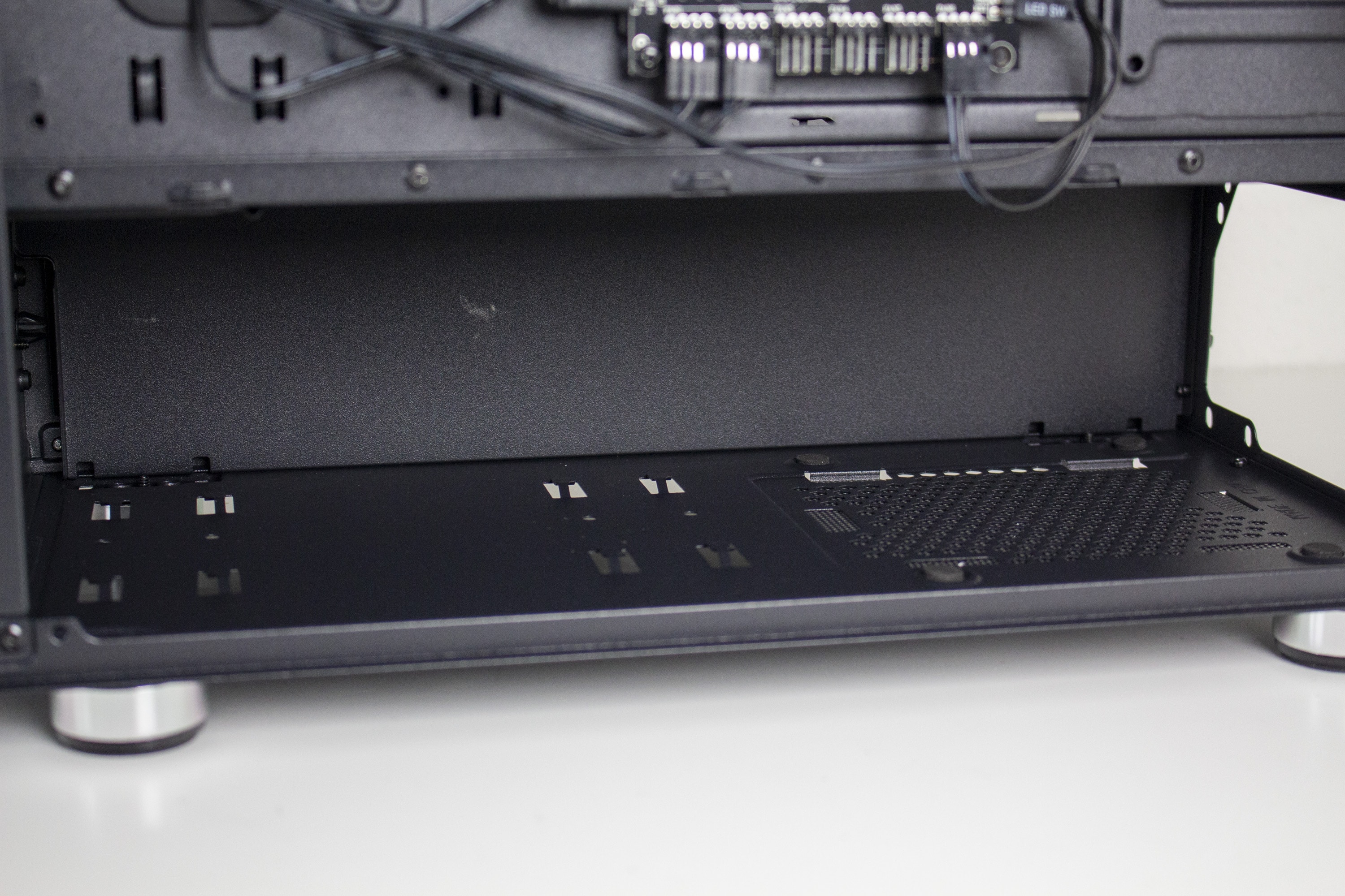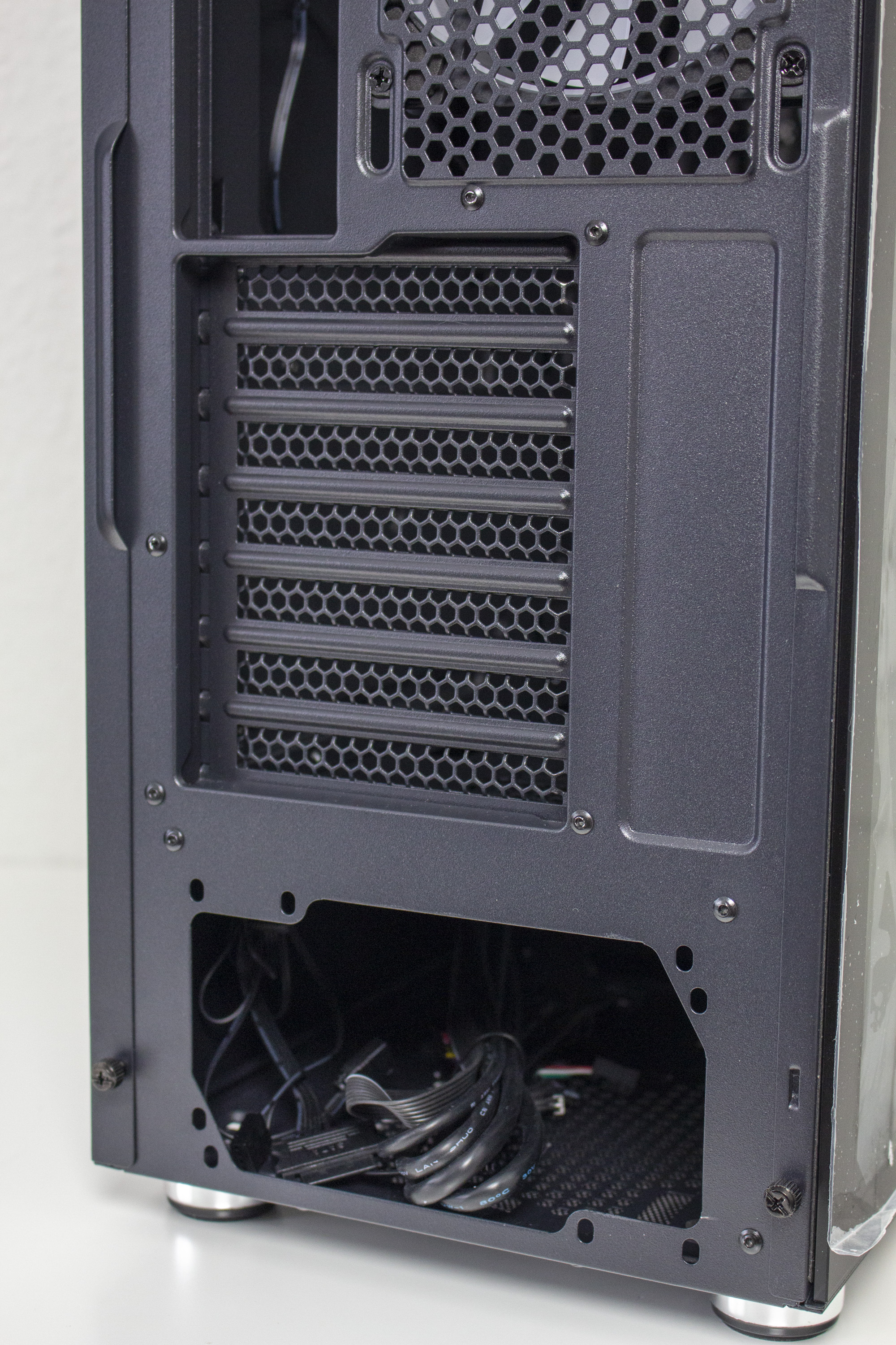 Der untere Bereich wird durch eine Abdeckung vor neugierigen Blicken geschützt. Um aber trotzdem eine gewissen Luftzirkulation zu ermöglichen, gibt es an der Oberseite ein großes Lüftungsgitter. Zusätzlich verfügt die Abdeckung über vier Kabelmanagement-Öffnungen und einen großen Ausschnitt für einen Radiator in der Front.