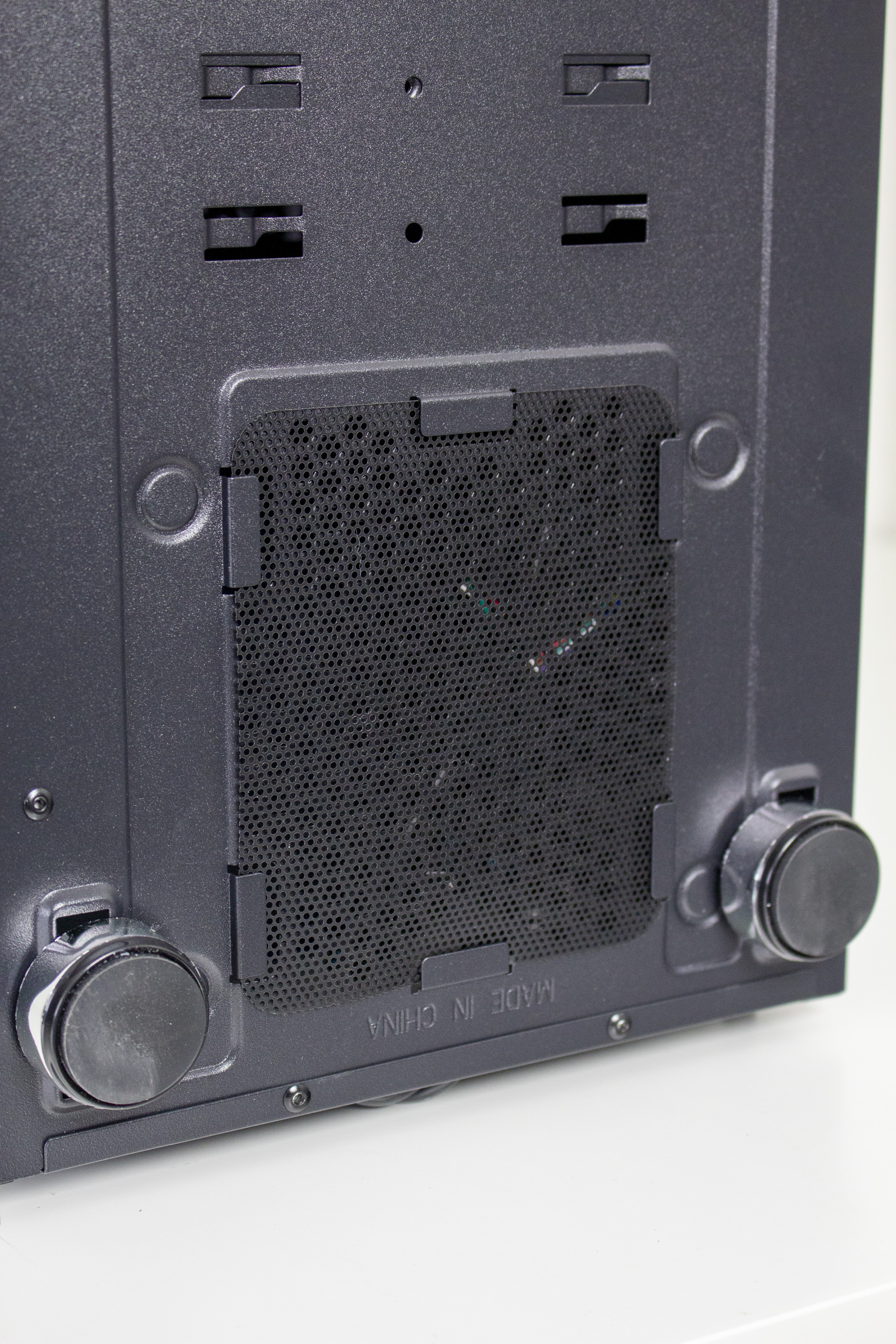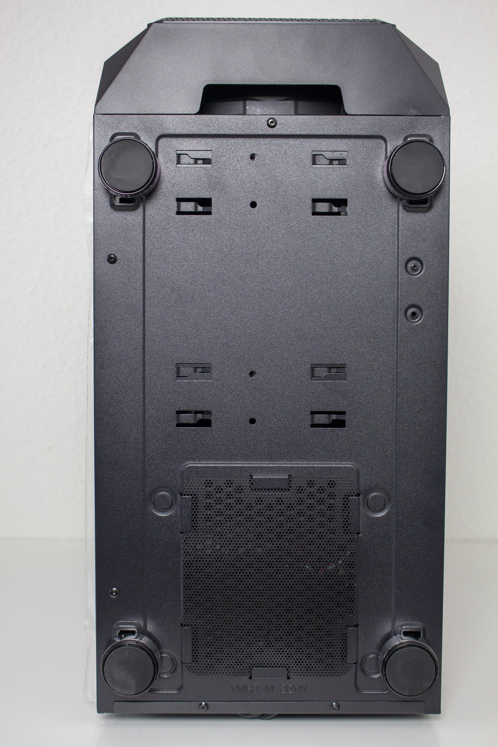 Das Montech Air X ARGB steht auf vier soliden Kunststofffüßen. Diese verfügen jeweils über eine Schicht Gummi zur Entkopplung und sind silbern gehalten. Das im Boden platzierte Netzteil wird durch einen einfachen Meshfilter vor starken Staubansammlungen geschützt. Angesichts des Preises hätten wir uns hier aber eine etwas wartungsfreundlichere Lösung gewünscht.