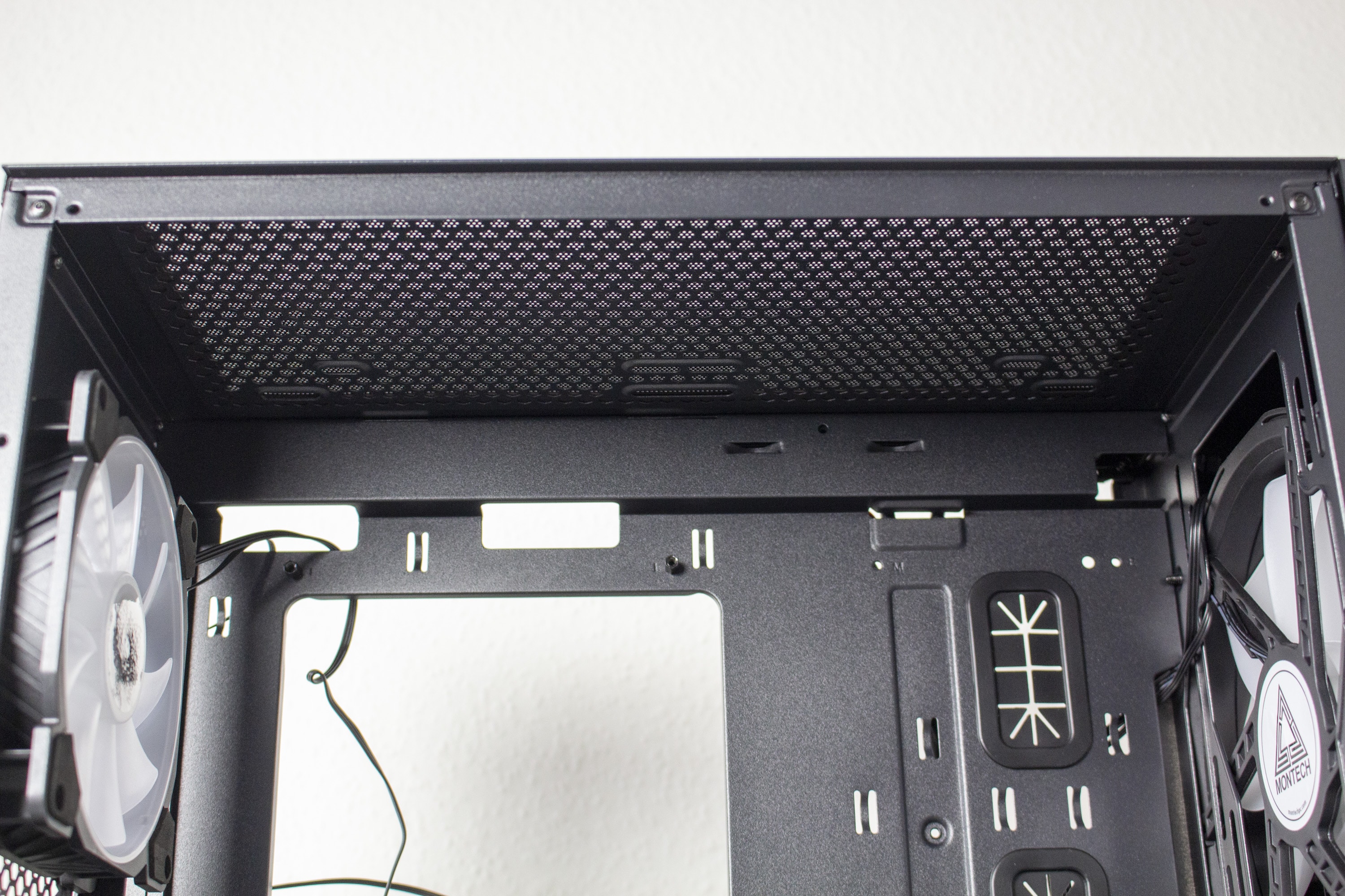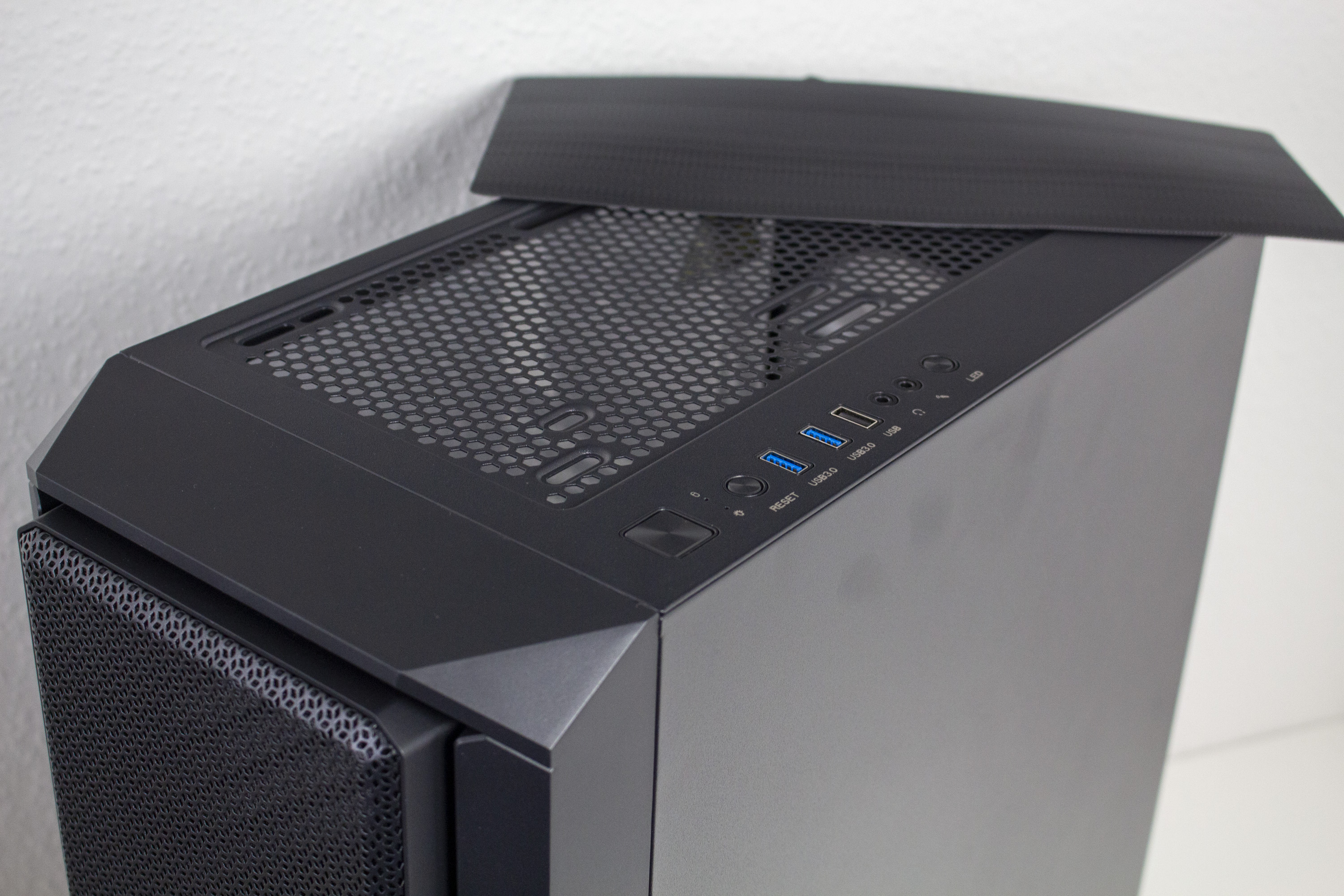 „Form-follows-function“ gilt auch für den Deckel. Dieser besteht aus einem großen Lüftungsgitter mit nach außen versetzten Montageschienen für Lüfter oder Radiatoren. Um eine schlichte Optik zu erhalten und den Innenraum vor Staub zu schützen, platziert Montech vor dem Gitter zusätzlich einen magnetischen Staubfilter. Im rechten Bereich der Deckelpartie findet man ein länglich verbautes I/O-Panel. Vorhanden sind hier drei Taster (Power, Reset, LED), drei USB-Ports (2x USB 3.0, 1x USB 2.0) und zwei Anschlüsse für Kopfhörer sowie Mikrofon.