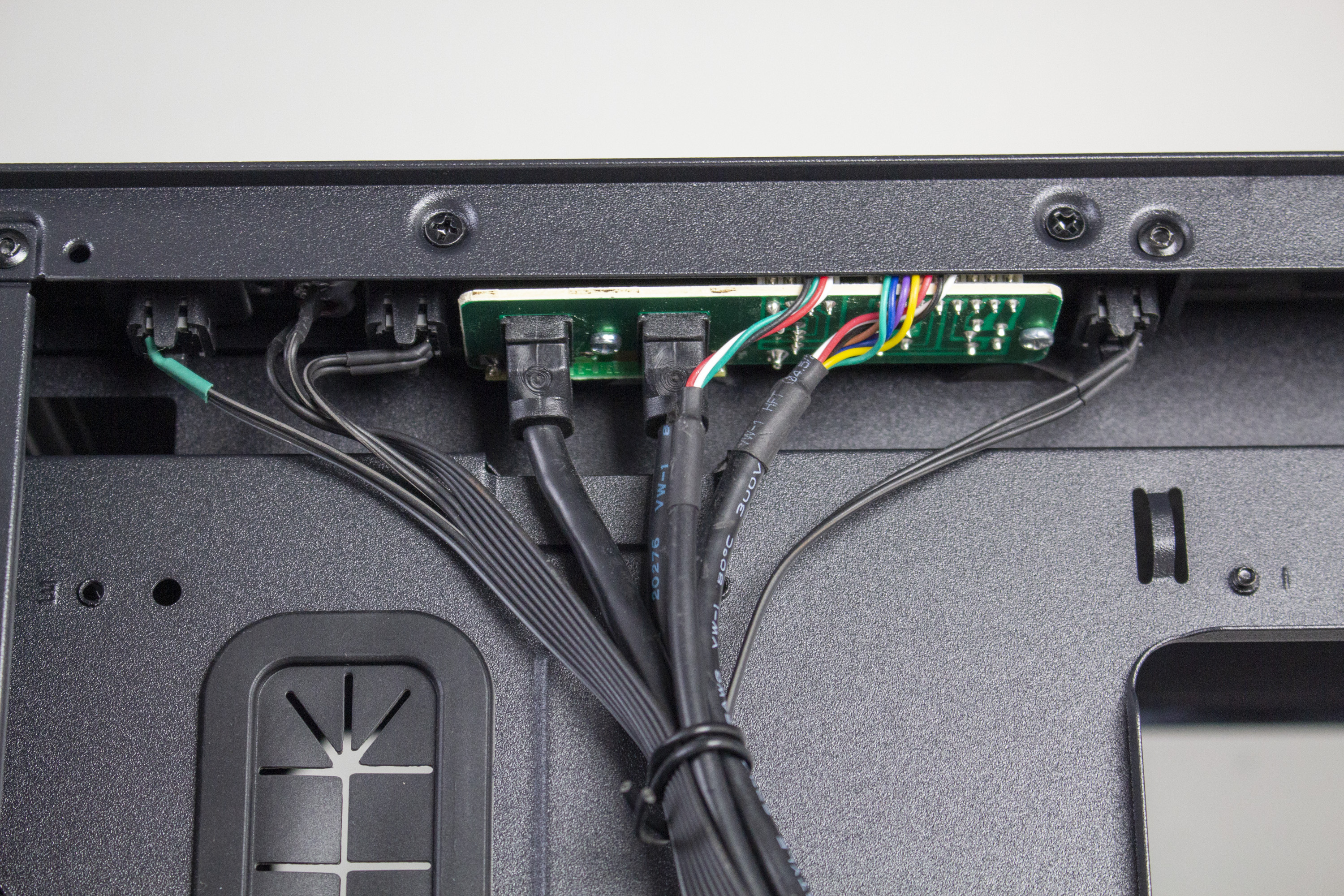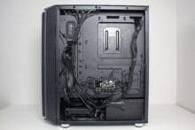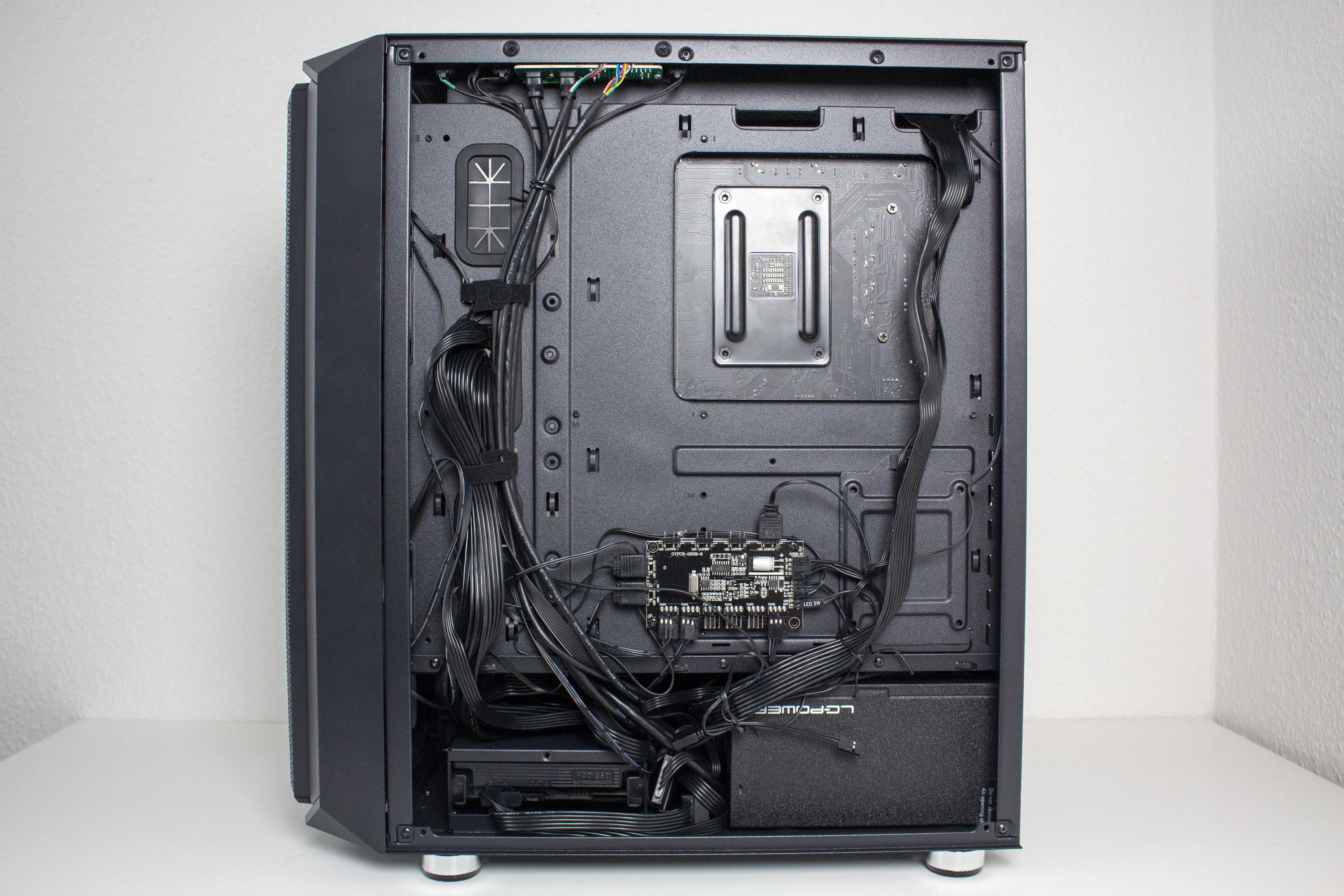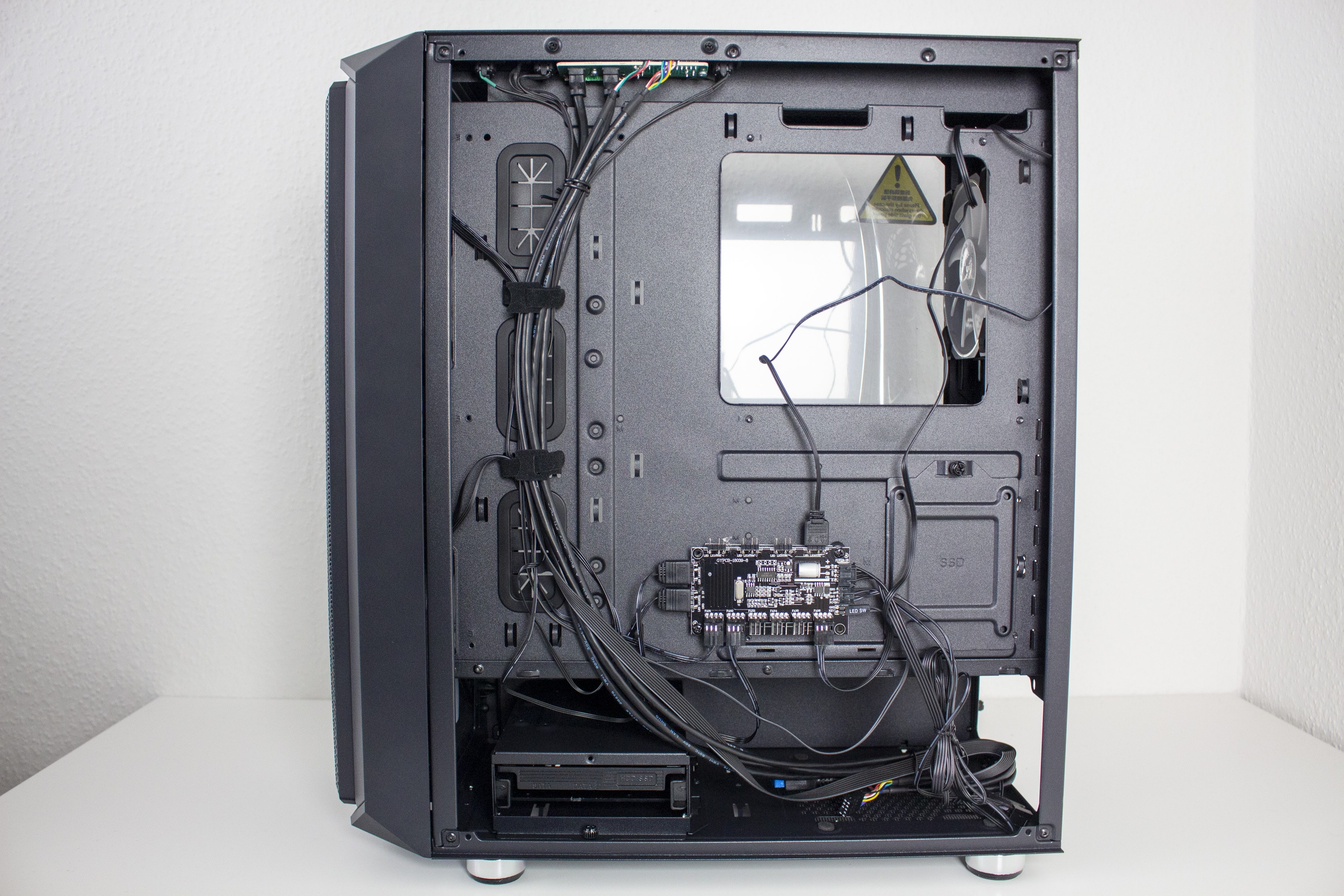 Der Einbau des Testsystems stellte uns im Montech Air X vor keine großen Herausforderungen. Durch die geräumige Gestaltung der Hauptkammer konnte das Mainboard trotz verbautem CPU-Kühler problemlos verschraubt und verkabelt werden. Auch die teilweise vorinstallierten Abstandshalter bzw. die Nuss zum Eindrehen der restlichen Abstandshalter haben die Einbauzeit deutlich verkürzt. Der Platz hinter dem Mainboard-Tray ist mit 20 Millimeter als ausreichend zu bezeichnen. Durch die zahlreichen Lösen für Kabelbinder konnten alle Kabel problemlos verzurrt werden. Die teilweise gummierten Kabelmanagement-Öffnungen wurden sinnvoll platziert und ermöglichen einen ordentlich wirkenden Innenraum. Lediglich die farbigen Enden der I/O-Panel-Kabel trüben das Gesamtbild etwas.