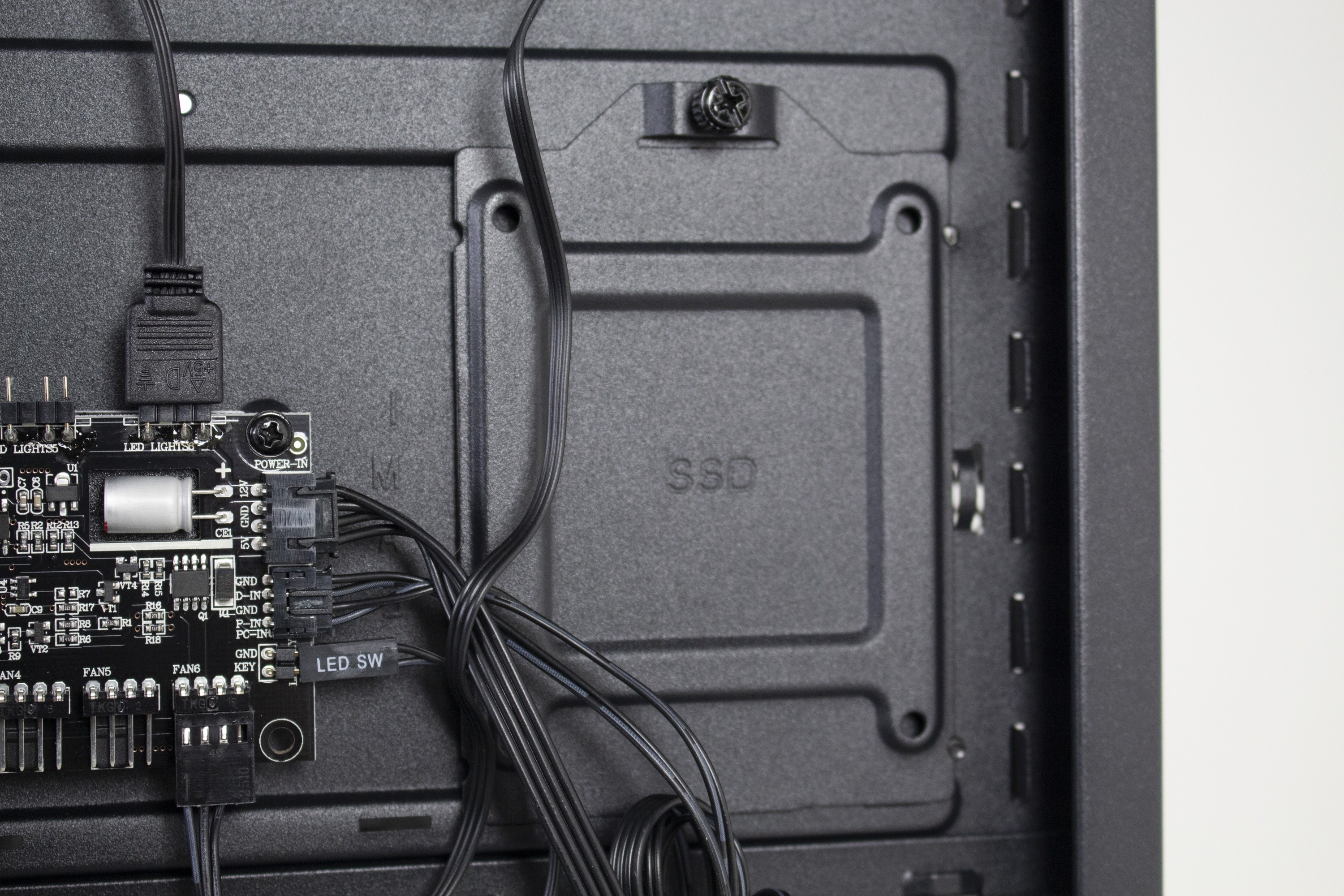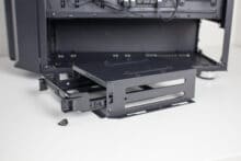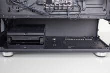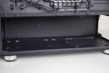 Wenden wir uns nun der Rückseite des Mainboard-Trays zu. Hier gibt es mit 20 Millimetern zwar ausreichend, aber nicht unendlich viel Platz. Durch die vielen Stahllaschen für Kabelbinder sollte man die Kabel aber passend verzurren können. Zusätzlich spendiert der Hersteller dem Air X noch zwei wiederverwendbare Klettstreifen. Unterhalb der Netzteilblende wird natürlich das Netzteil montiert. Dieses ruht auf vier dünnen Elementen aus Moosgummi. Links daneben befindet sich ein einfacher HDD-Käfig, der, bei Bedarf, versetzt oder ausgebaut werden kann.