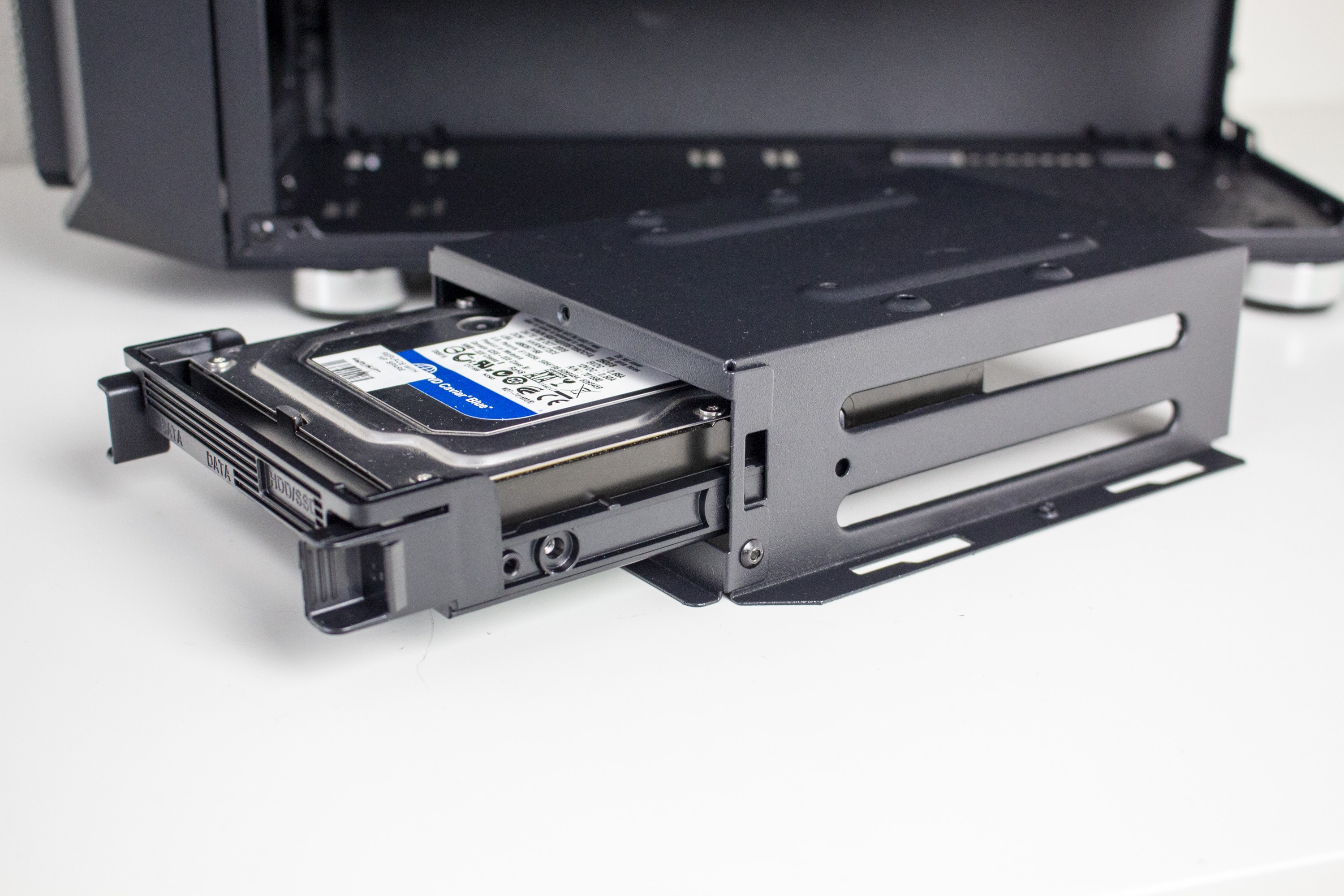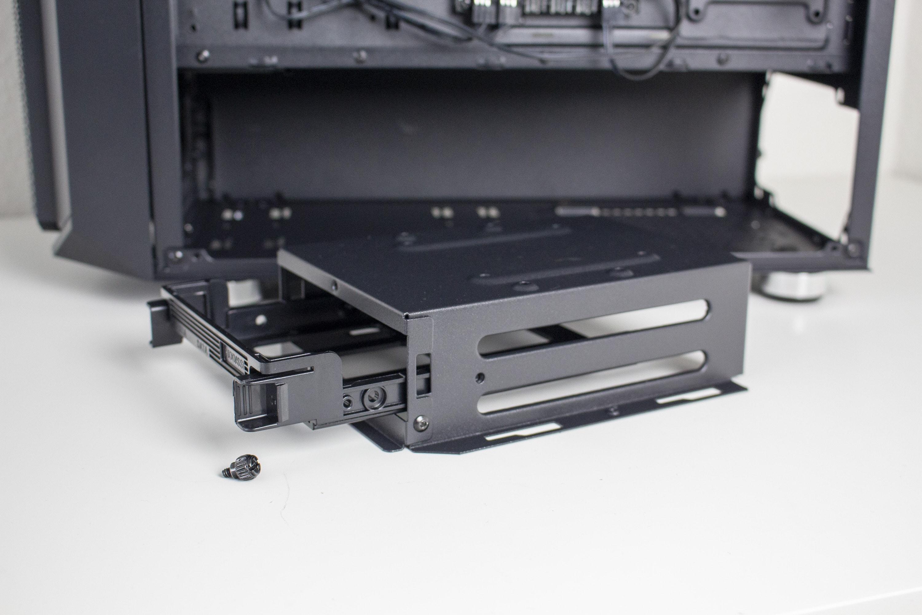 Das Montech Air X unterstützt ab Werk insgesamt vier Datenträger. Dazu verbaut der Hersteller zwei Stahlrahmen für 2,5″-SSDs hinter dem Mainboard-Tray bzw. oberhalb der Netzteilabdeckung. Zusätzlich können im HDD-Käfig innerhalb der Netzteilkammer zwei 3,5″- oder zwei 2,5″-Datenträger verbaut werden. Dazu stehen ein Kunststoffrahmen und diverse HDD-Schrauben zur Verfügung.