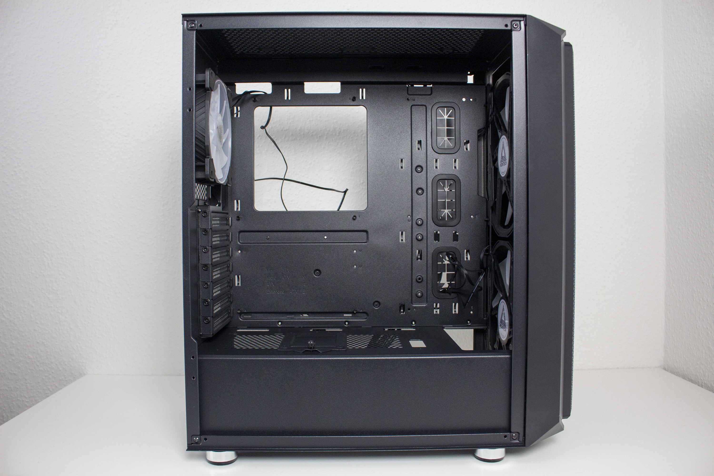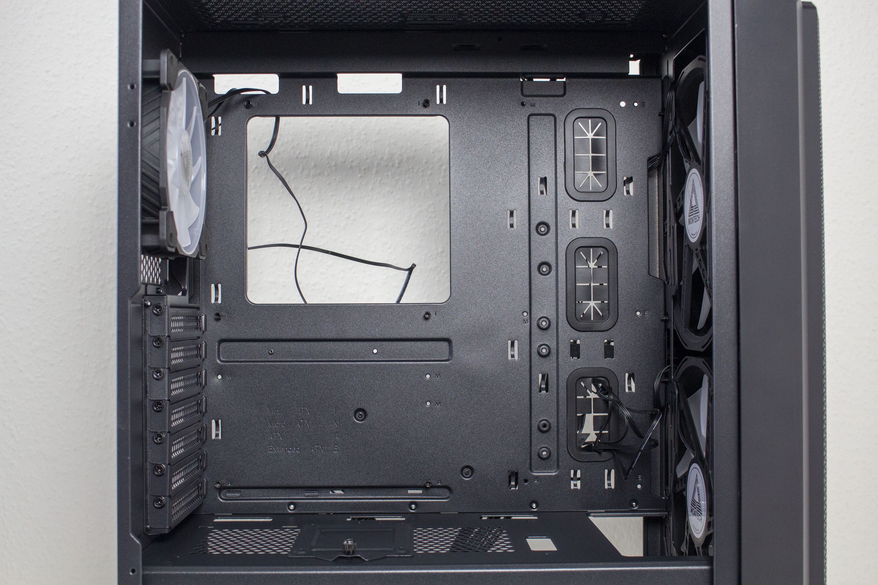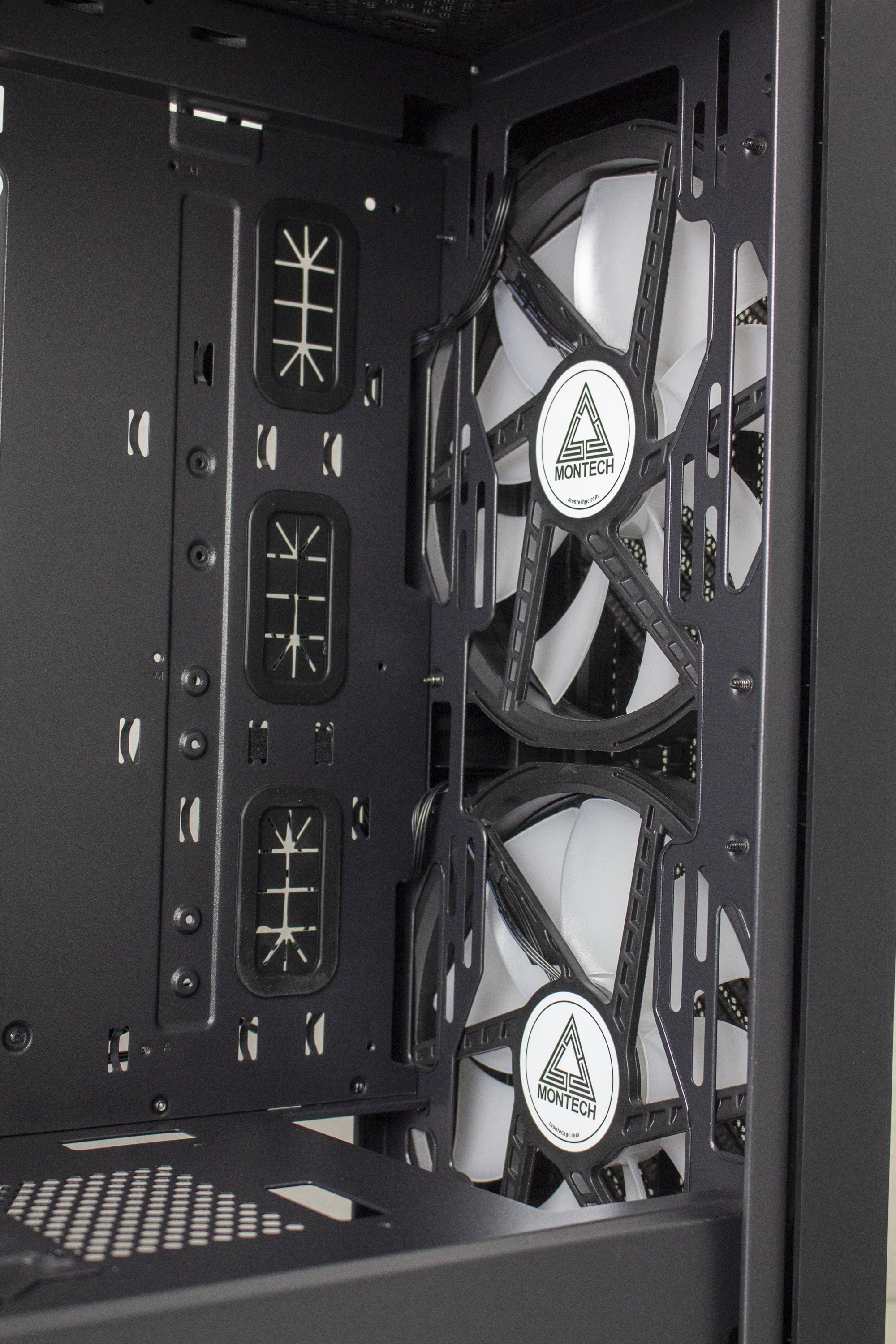 Der Innenraum des Air X folgt den aktuellen Standards für Midi-Tower. So kommt ein Zwei-Kammer-System mit einem schwarz lackierten Innenraum zum Einsatz. In der oberen Hauptkammer gibt es viel Raum für die Komponenten und hinter den großen Frontlüftern gibt es keine Elemente, die den Airflow beeinflussen könnten. Zusätzlich kann man in der Front auch erkennen, dass diese für das große Lüfterformat gut vorbereitet wurden. Montech hat also nicht nur große Lüfter in einen normalen Korpus gebaut. Das Mainboard-Tray ist plan gestaltet und verfügt über zahlreiche Ausschnitte für das Kabelmanagement und eine CPU-Kühler-Backplate. Drei dieser Öffnungen sind sogar mit Gummimanschetten ausgestattet.