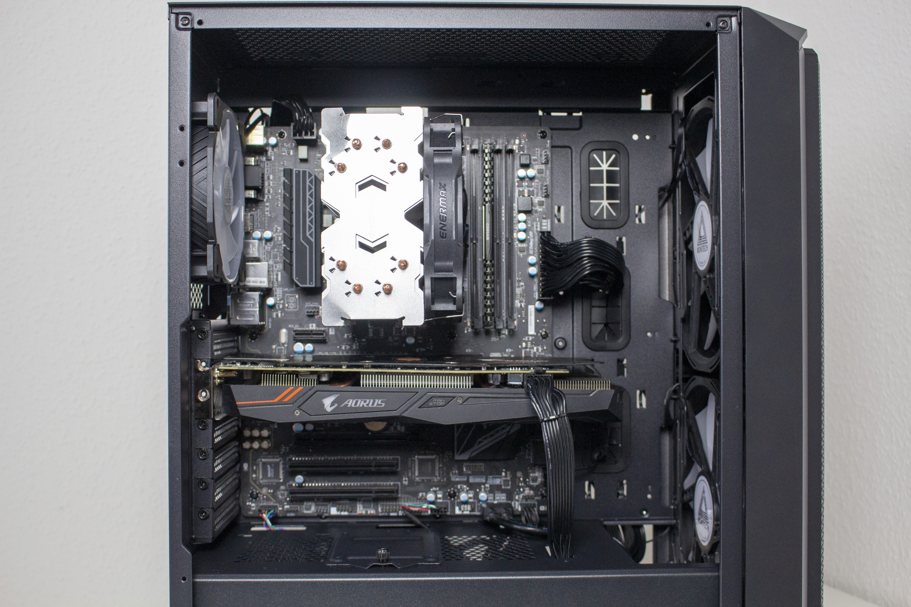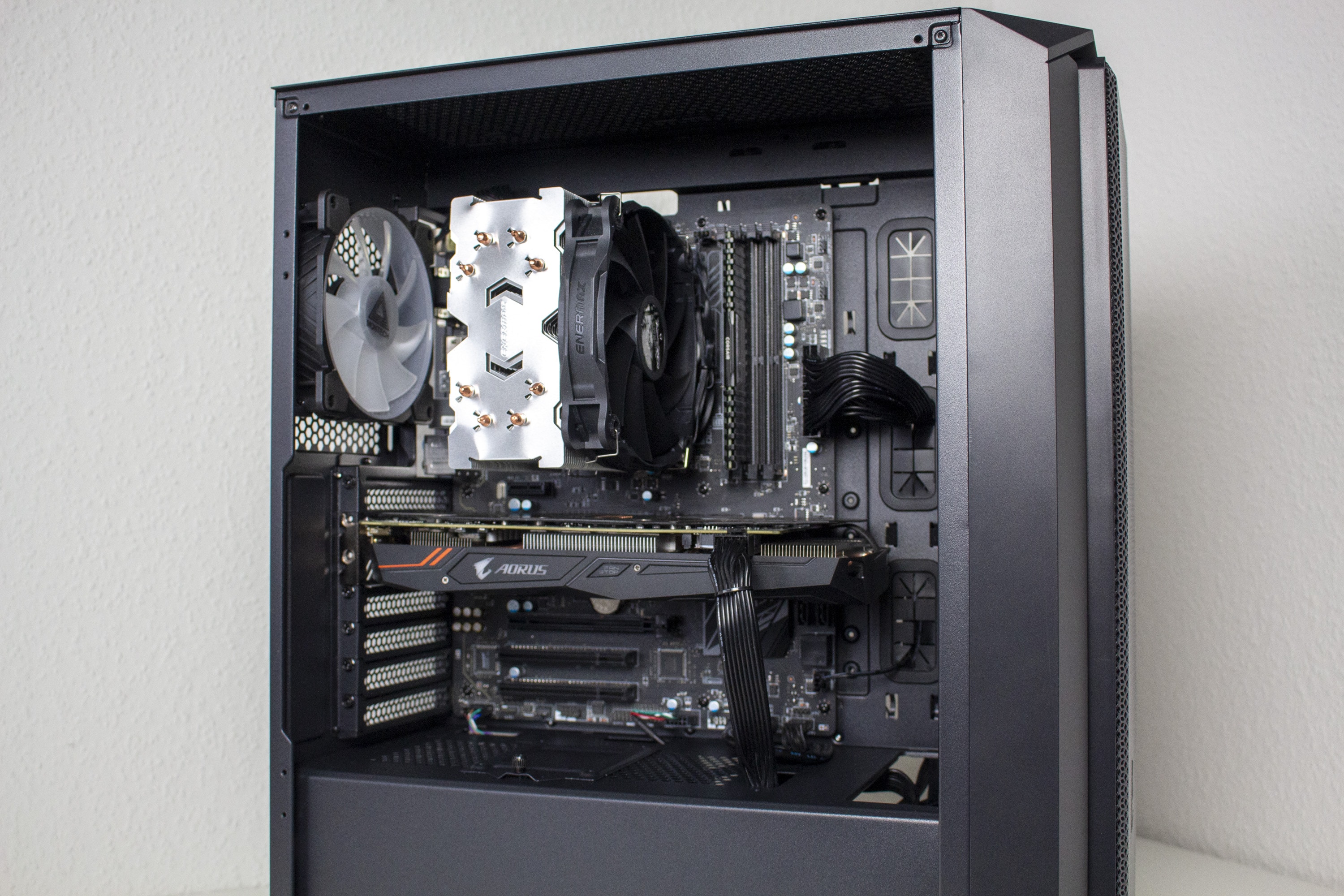 Nun kommen wir zum Systemeinbau. Als Hardware verwenden wir einen AMD Ryzen 5 1400 auf einem MSI B350 PC Mate mit 16GB Crucial Ballistix Sport LT grau DDR4-2666. Der Ryzen wird von einem Enermax ETS-F40 Silent Edition gekühlt und ist auf 3,8 GHz (1,25V) übertaktet. Für die Bildausgabe ist eine GTX 1060 6GB von Gigabyte AORUS zuständig. Die Stromversorgung erledigt das vollmodulare LC-Power LC550 V2.31 Platinum mit einem Effizienzgrad von 80 Plus Platinum.