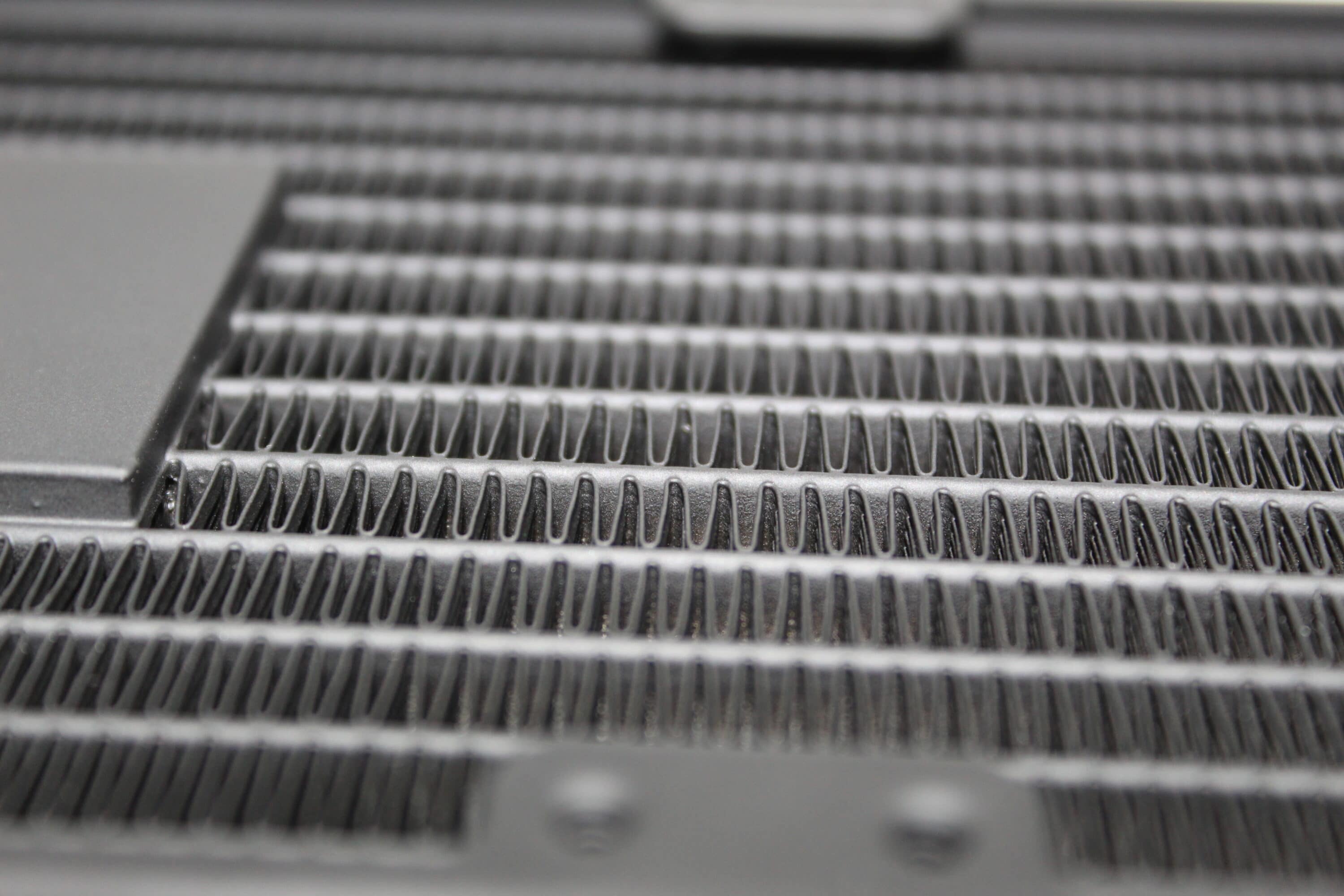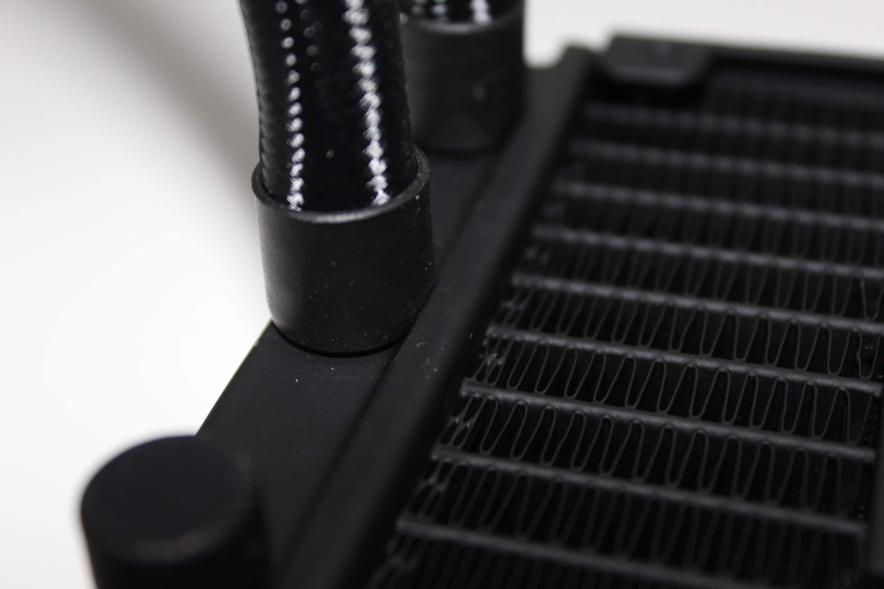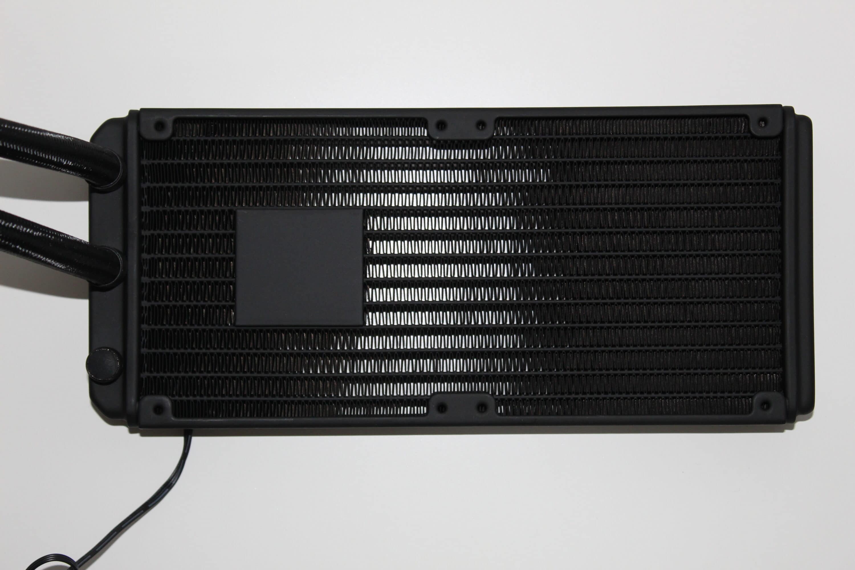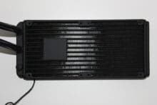 Die Lamellen des Radiators sind gut gefertigt und optisch lassen sich keine Mängel feststellen. Der Wasserblock ist für eine Kompaktwasserkühlung überraschend leicht – dies ist dem Fakt geschuldet, dass die Pumpe unüblicherweise im Radiator verbaut ist. Durch diesen Wechsel wird etwas Lamellenplatz abgegeben, da die Pumpe direkt im Radiator sitzt – nicht etwa daneben. Das PWM-Kabel für die Pumpeneinheit wird ordentlich herausgeführt und besitzt eine angemessene Länge. Laut MSI dient diese Änderung dazu, dass die Lebensdauer der Pumpe erhöht wird, indem man diese von der Wärmequelle entfernt.