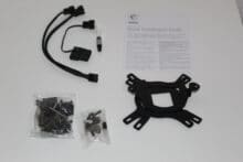 Neben der eigentlichen Wasserkühlung befindet sich ebenfalls eine Anleitung, das Montagematerial für die verschiedenen Sockel, Wärmeleitpaste und einige Adapterkabel für die Lüfter im Karton. Um die Lüfter mit einen einzelnen PWM-Anschluss versorgen zu können, wird ein Y-Kabel beigelegt. Für den Fall, dass auch dies nicht möglich ist, gibt es einen Adapter auf MOLEX. Als Letztes gibt es noch ein weiteres Anschlusskabel, um die Geschwindigkeit der Lüfter zu reduzieren.