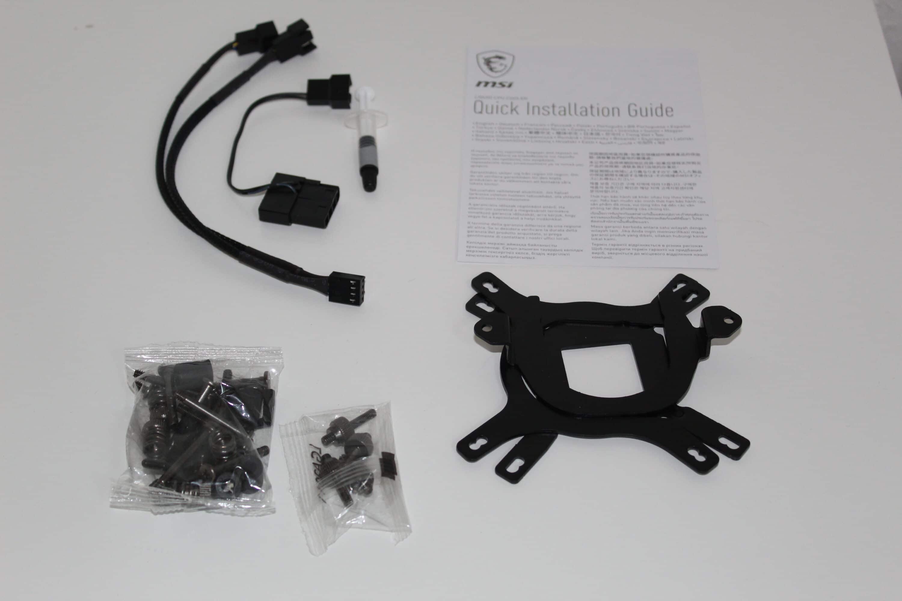 Der Lieferumfang ist durch Zubehör, wie z. B. das 4-Pin auf MOLEX-Kabel überdurchschnittlich – realistisch ist hier jedoch nur selten ein wahrer Nutzen zu finden. Selbiges gilt für das „Speed-Reduction“-Kabel – Möchte man eine tiefere Geschwindigkeit, so passt man in der Regel die Lüfterkurve im BIOS an. Aber auch hier gibt es seltene Fälle, in denen ggf. OEM-Mainboards auf eine solche Steuerung verzichten. In dem speziellen Szenario könnte man die MAG CoreLiquid 240R natürlich auf eine leisere Lautstärke bringen.