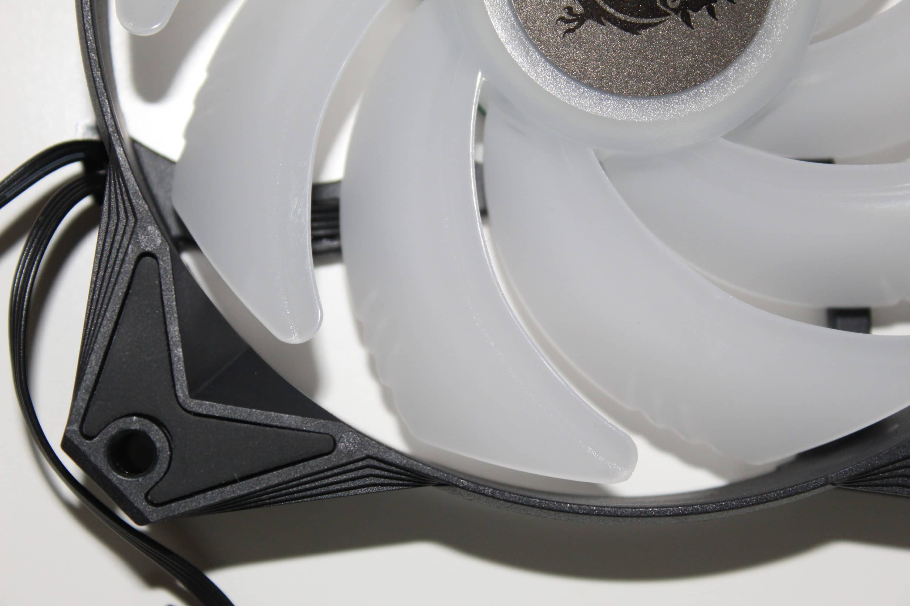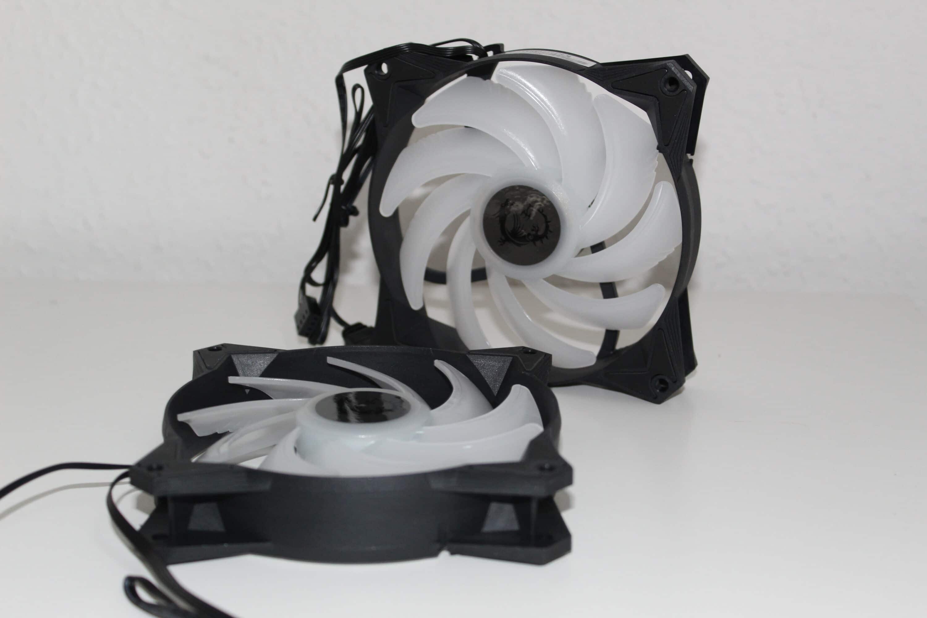 Die Lüfter bestehen aus einem schwarzen Rahmen und neun milchigen Rotorblättern. Diese werden ebenfalls mit LEDs beleuchtet, sodass dieser bei drehenden Lüftern komplett leuchtet. Auch hier setzt MSI auf den typischen 3-Pin-Stecker und löblicherweise ist hier an jedem Kabel ein Stecker und eine Buchse zu finden – so kann man die Lüfter in Reihe schalten und es wird nur ein einzelner ARGB-Header auf dem Mainboard benötigt, ganz ohne Y-Kabel oder Controller.