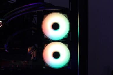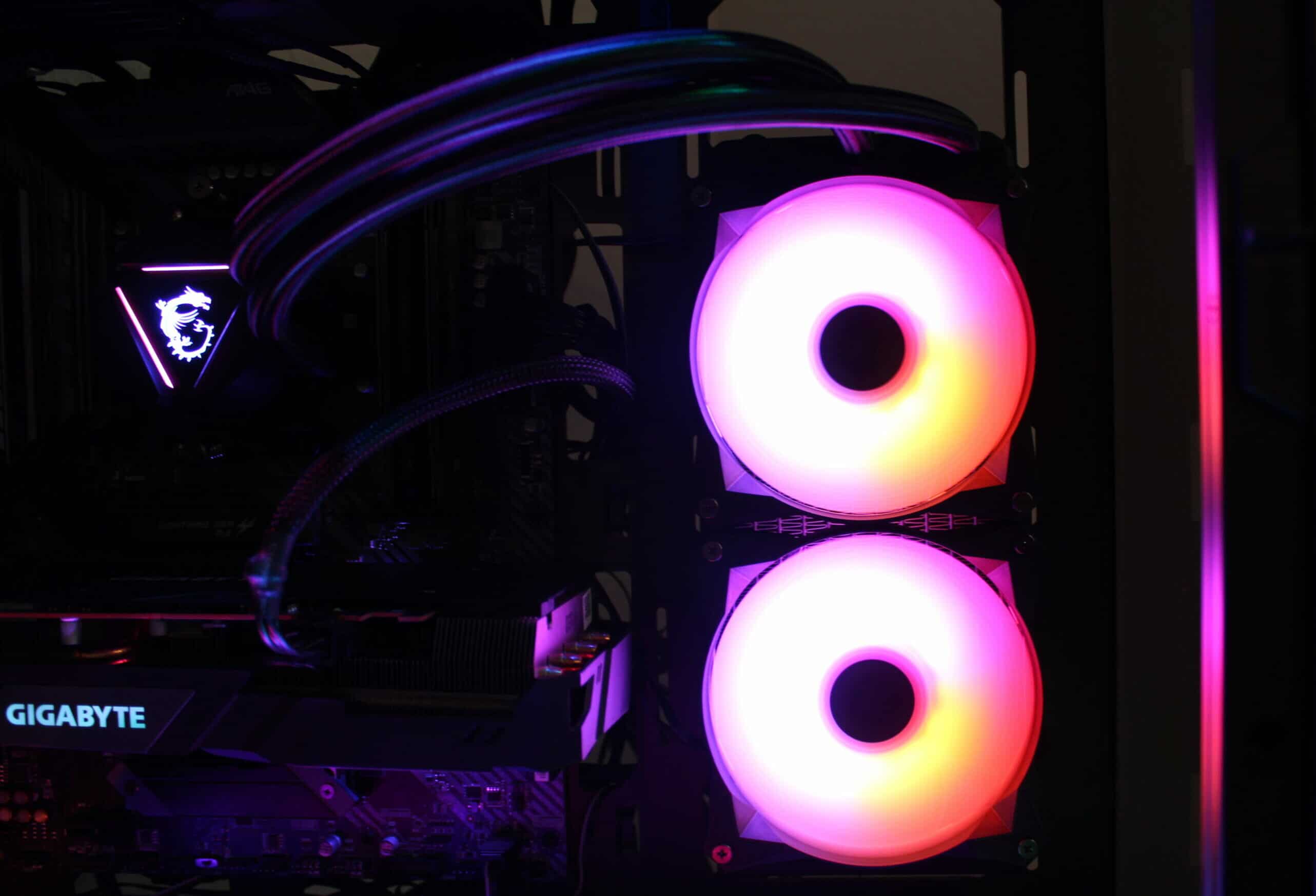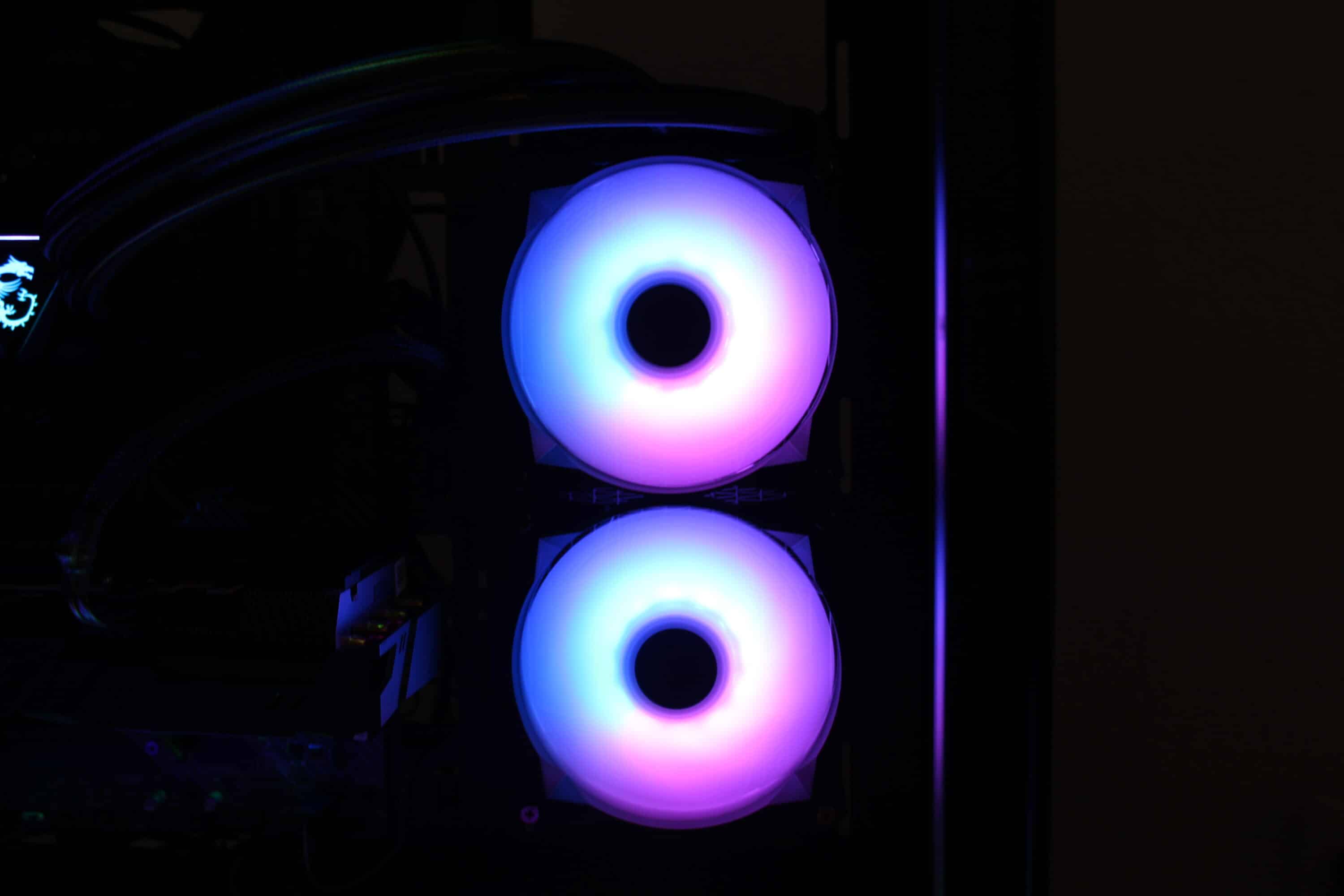 Die RGB-Beleuchtung des Wasserblocks und die der Lüfter ist gleichmäßig und kräftig. Wie gewohnt, bietet Mystic Light einige Modi, um z. B. Regenbogenverläufe oder auch statische Farben darzustellen. Besonders die Beleuchtung der Lüfter überzeugt. Schade, dass man diese aktuell nicht einzeln erwerben kann, um das Gehäuse komplett mit einheitlichen Lüfter zu versehen.