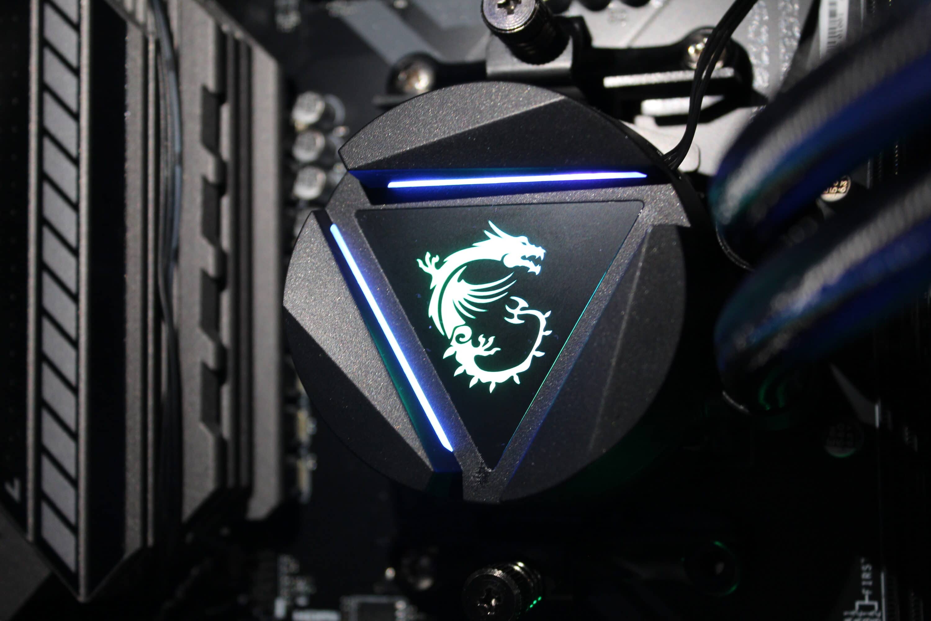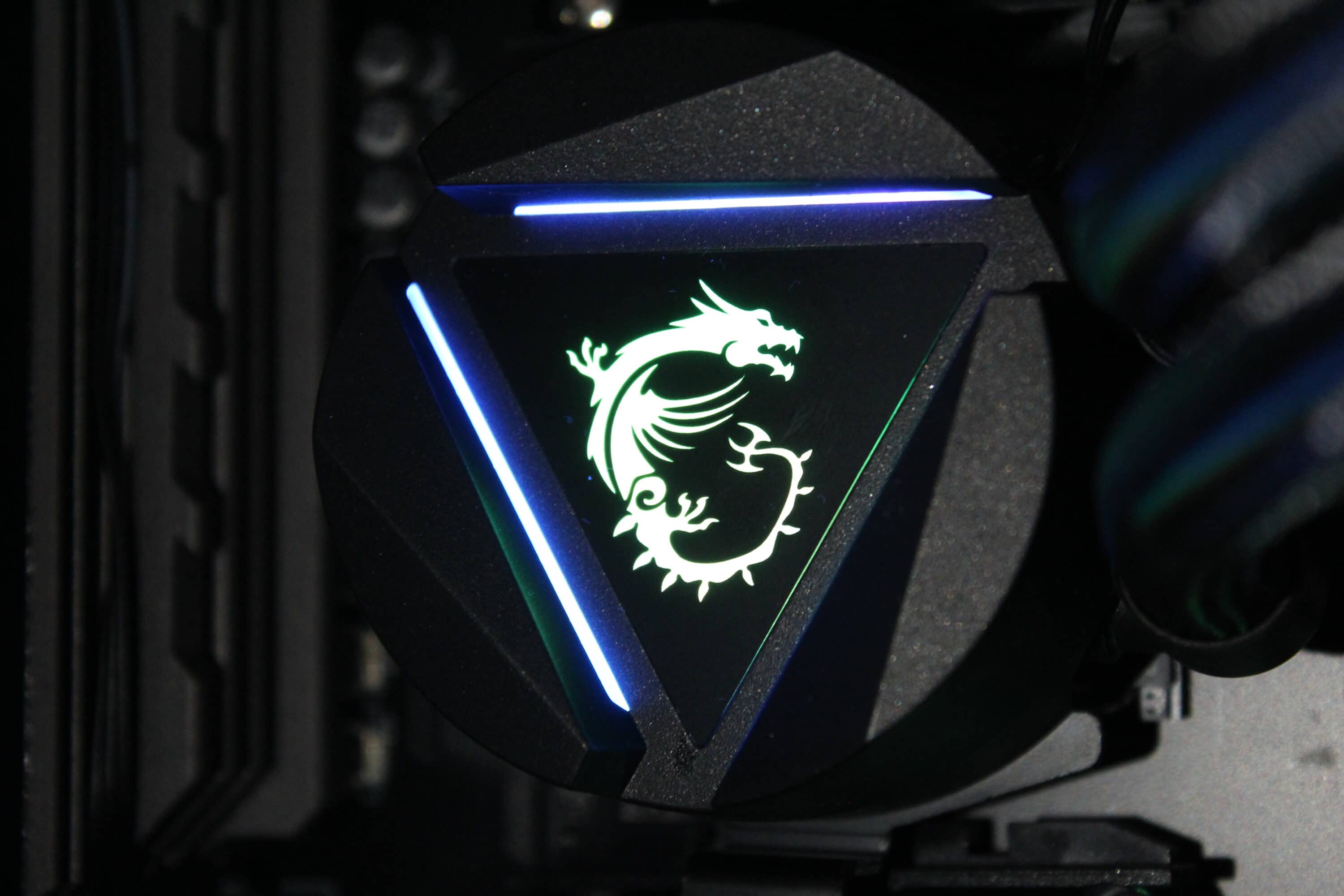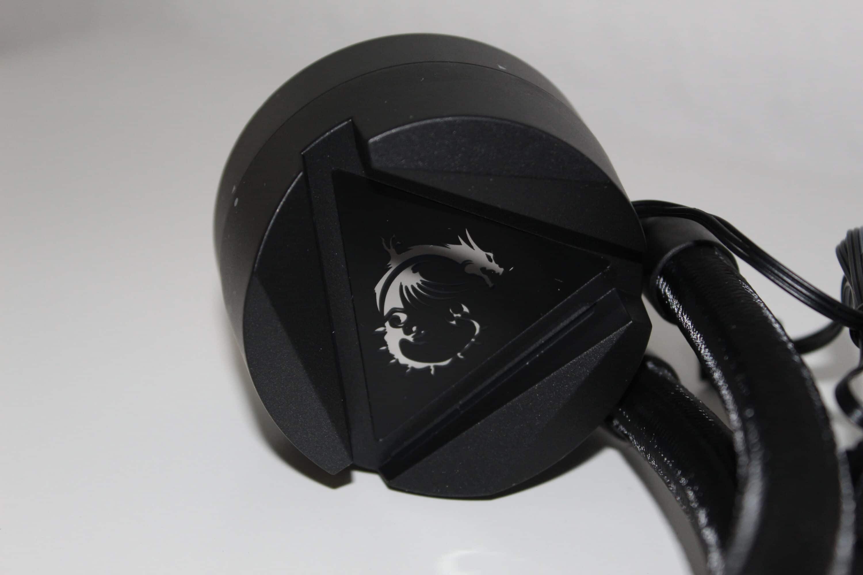 Auf dem Wasserblock befindet sich der MSI-typische Drache, welcher sich beleuchten lässt. Dies wird über einen 3-Pin-ARGB-Stecker realisiert – dieser ist in der Standardausführung verbaut und lässt sich so z. B. mit der MSI-eigenen Software Mystic Light steuern. Der Kopf des Blocks lässt sich rotieren, sodass man in jeder Montagemöglichkeit das Logo in der richtigen Ausrichtung sehen kann.