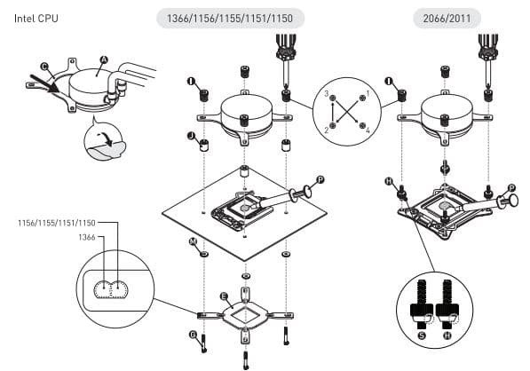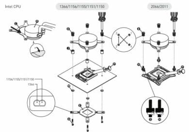 Die Montage auf den aktuellen Mainstream-Sockeln von Intel benötigt die beiliegende Backplate. Der Aufwand scheint hier etwas höher zu sein – dennoch ist dieser in einem vertretbaren Rahmen und im Schaubild gut dargestellt.