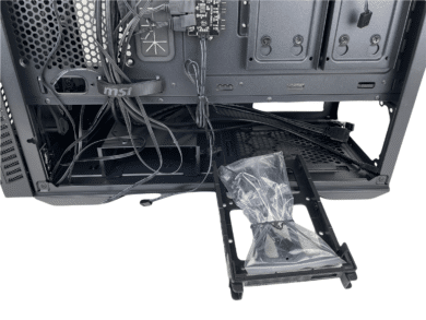 Der Netzteilschacht bietet Platz für Netzteile mit einer maximalen Länge von 220 mm. Möchte man ein größeres bzw. ein herkömmliches ATX-Netzteil verbauen ist das kein Problem. Hierfür muss dann aber der Festplattenkäfig weichen.