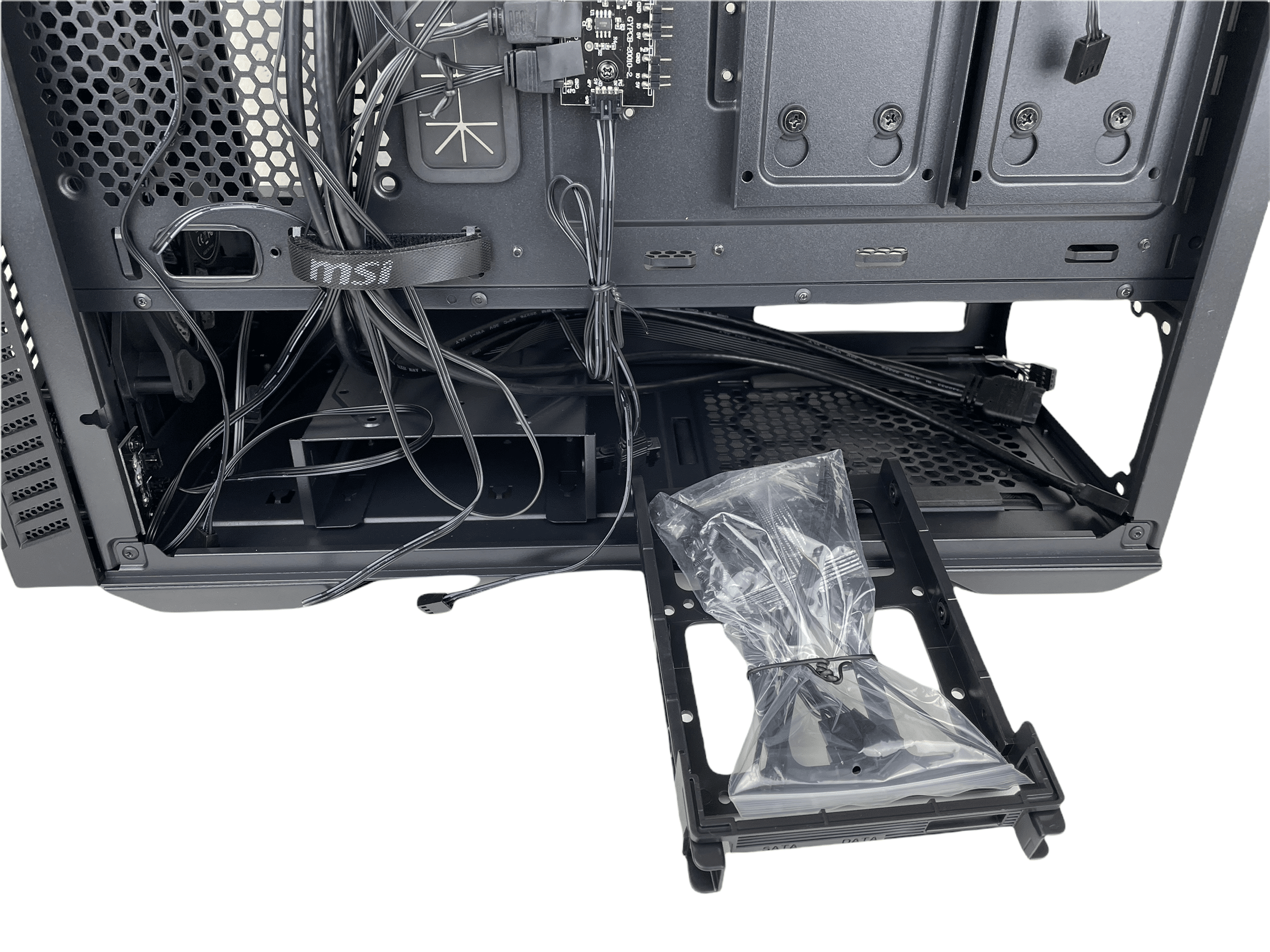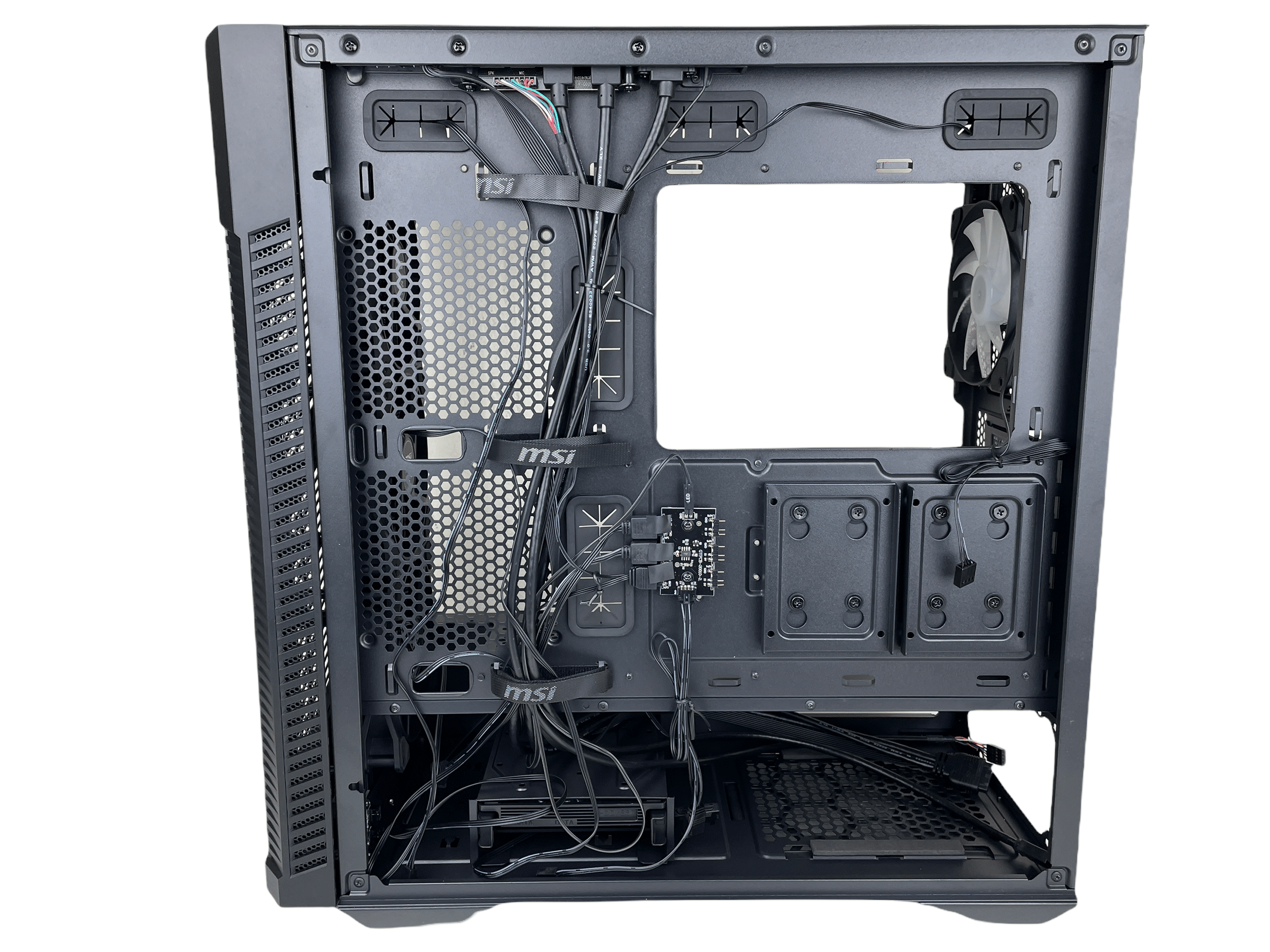 Zur Ausstattung gehört auch eine Platine, welche sechs Steckplätze im Angebot hat. Die Steuerung der Beleuchtung lässt sich dann über ein entsprechendes Programm (z. B. MSI Mystic Light) oder über den LED-Knopf in der Front I/O steuern. Neben der Platine befinden sich zwei Montageplätze für 2,5″-SSDs. Zur Montage der SSDs werden die Schlitten einfach nach oben geschoben und lösen sich dann aus der Befestigung.