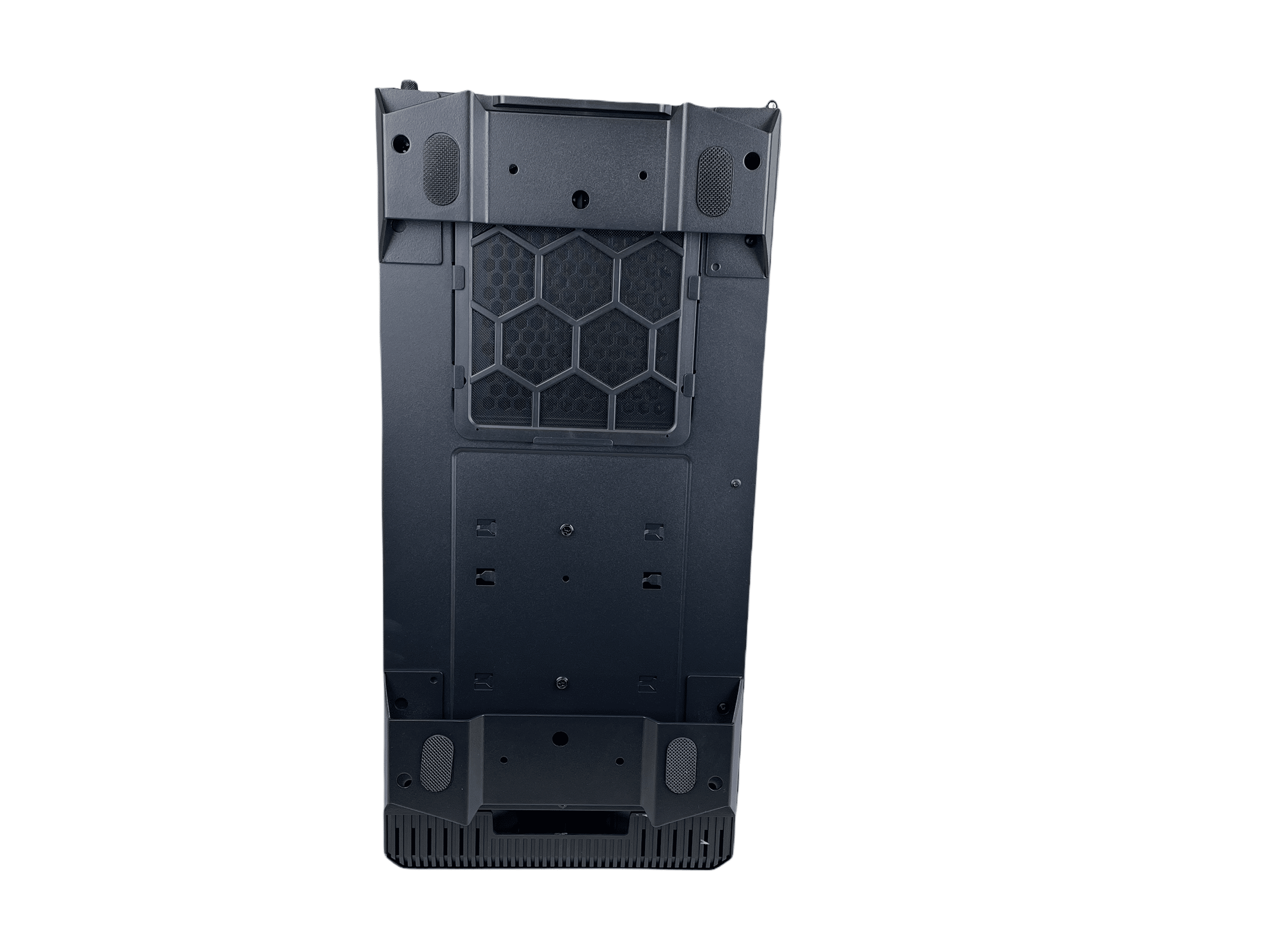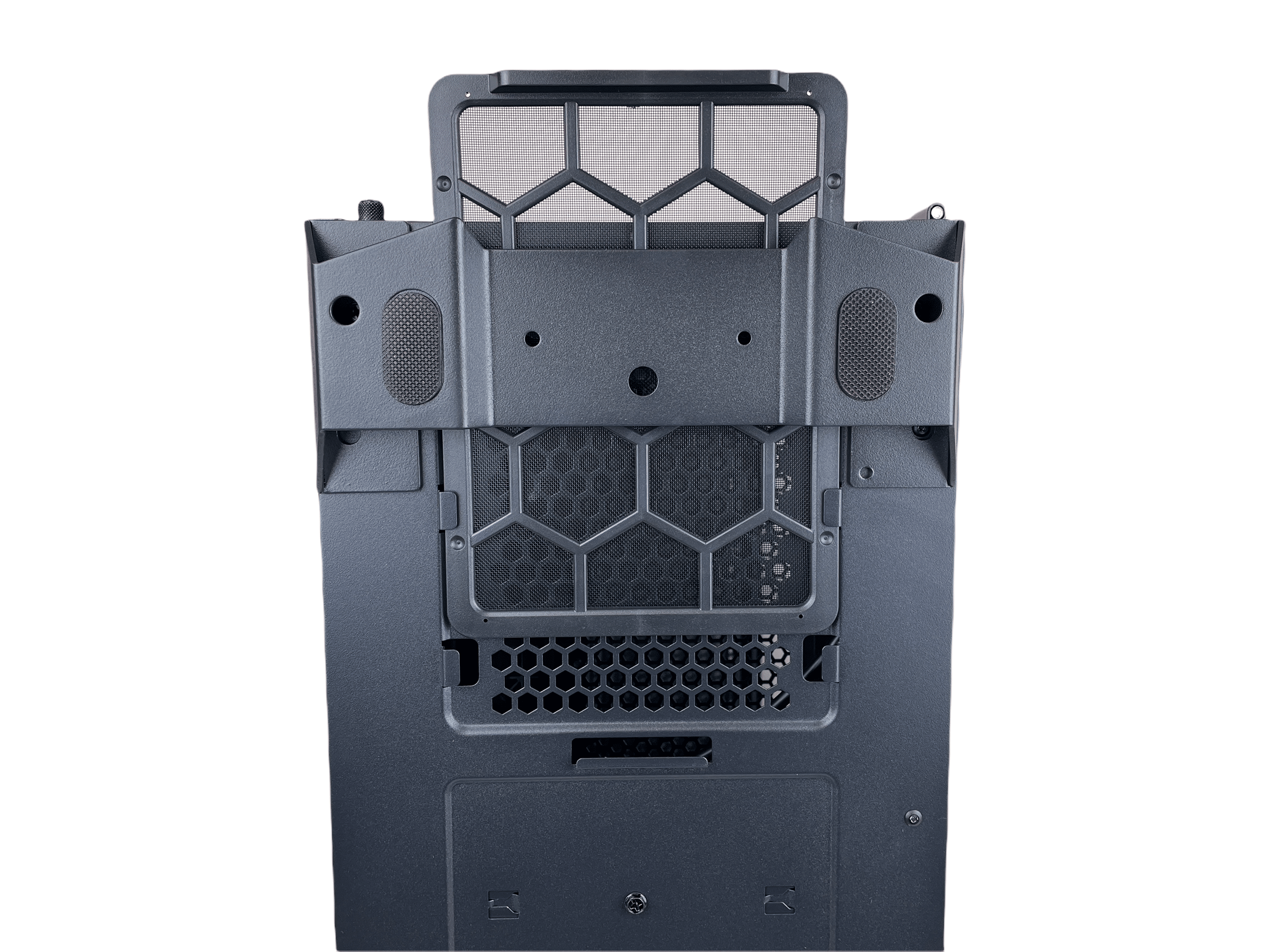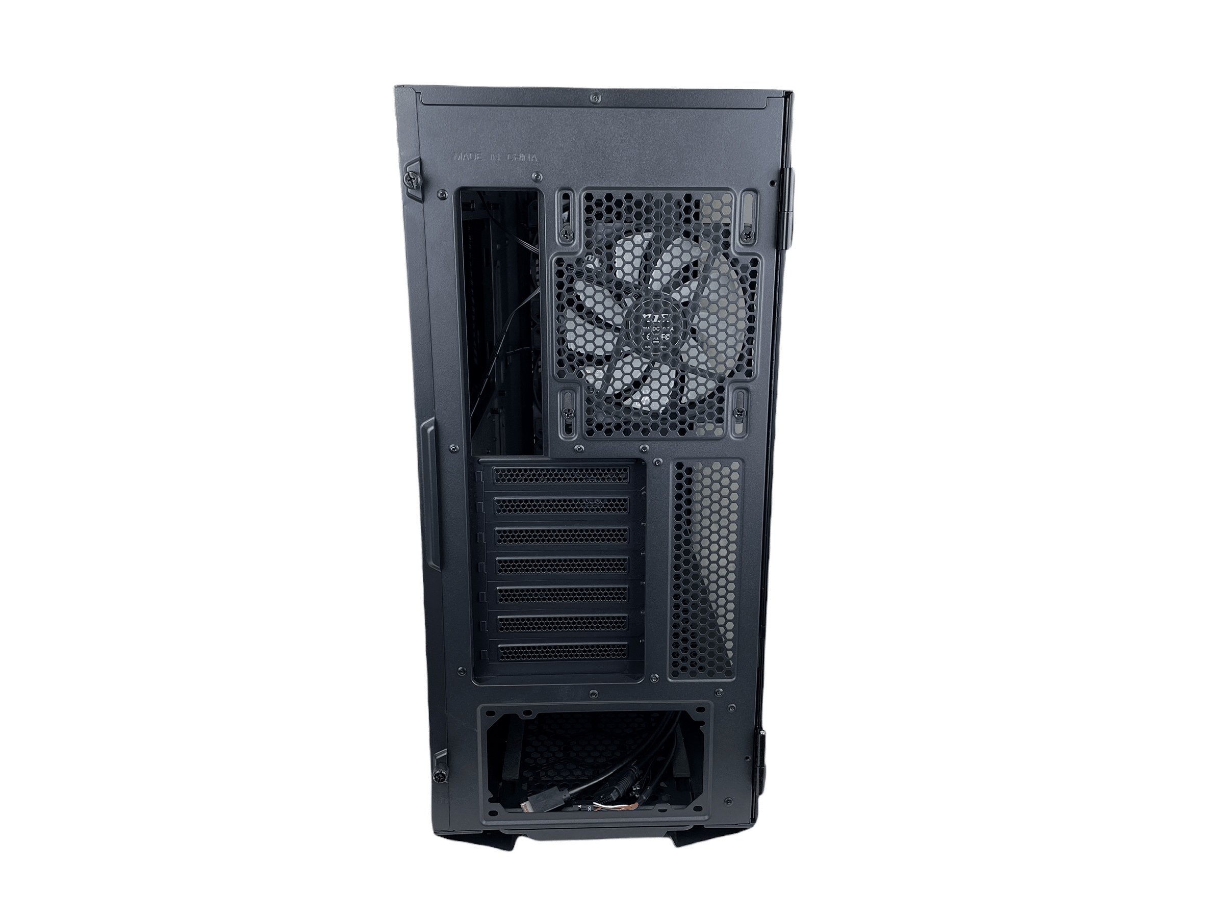 Der Heckbereich hat keine besonderen Überraschungen zu bieten. Das Heck hat sieben PCI-Plätze im Angebot und an den perforierten Flächen lässt sich auch hier erkennen, dass es sich um ein Airflow-Gehäuse handelt. Etwas vermisst haben wir in dieser Preisklasse einen Montage-Rahmen für das Netzteil. Da dieses aber von innen montiert wird, stellt das keinen Nachteil dar.