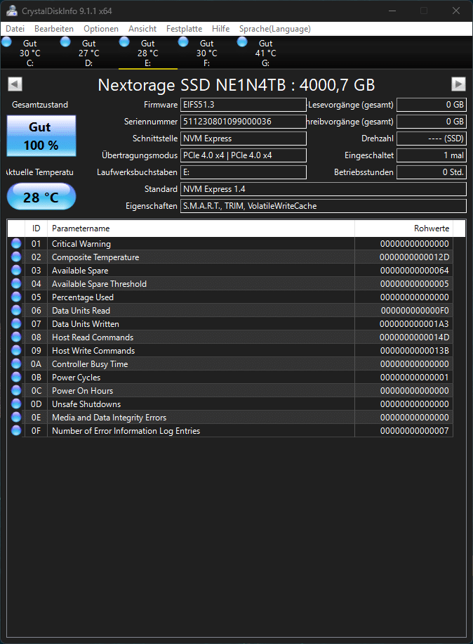 Zur Anzeige der technischen Daten nutzen wir das Tool CrystalDiskInfo: