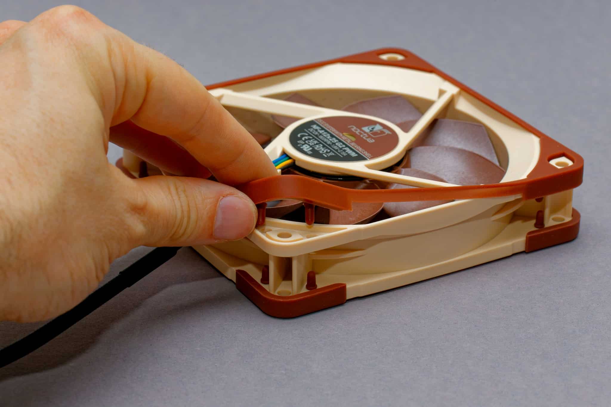 Beim Test als Gehäuselüfter werden jedoch die vibrationsverringernden Silikonhalterungen genutzt.