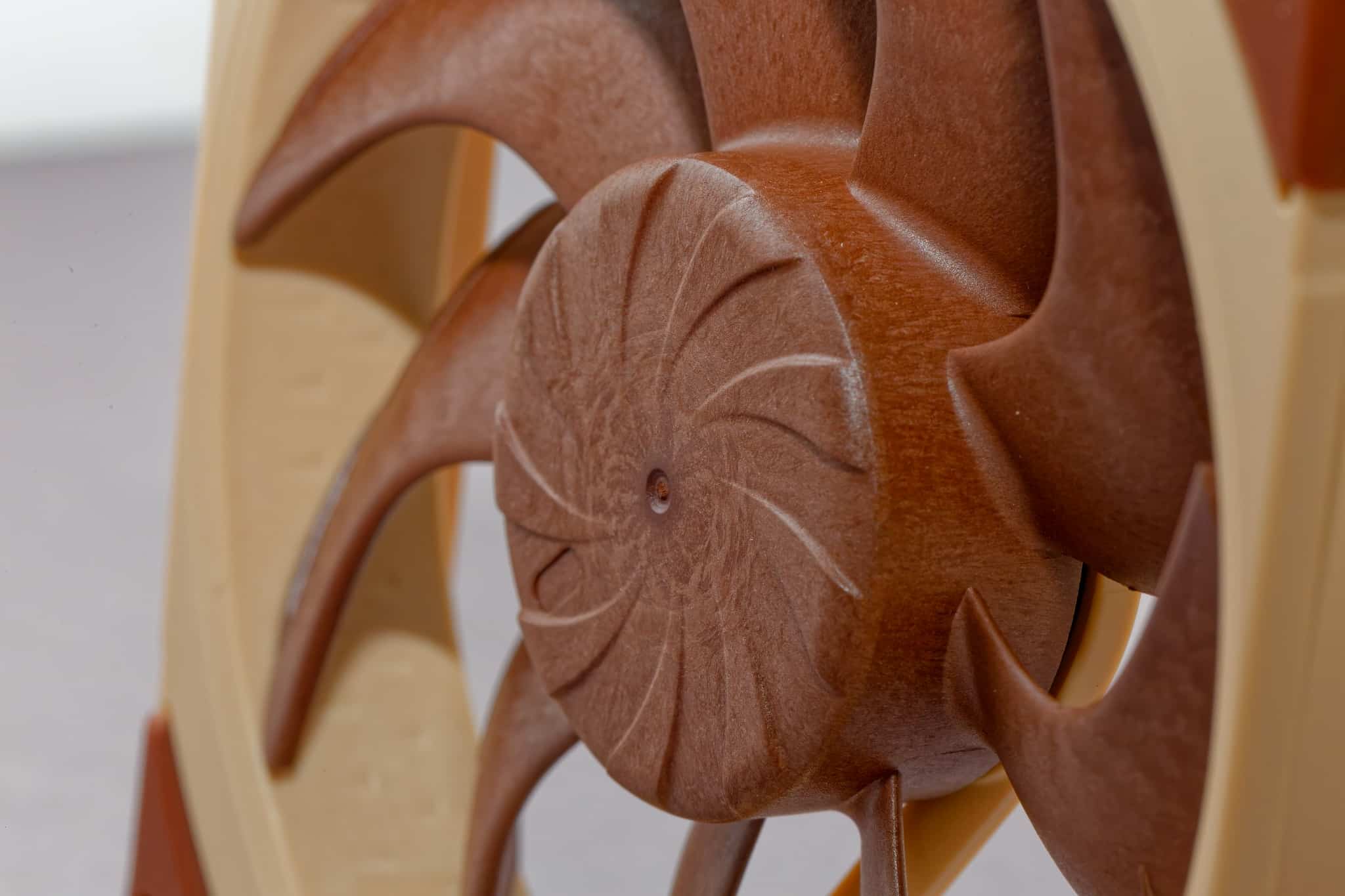 Auf den ersten Blick zeigt das Design: „Ich bin ein typischer Noctua-Lüfter“. Beiger Rahmen mit braunen Lüfterblättern und braunen Silikonecken sprechen dieselbe Sprache wie fast alle Standard-Lüfter der Marke. Die Unterschiede sind im Detail zu finden. Am Rahmen konnte ich keine nennenswerten Unterschiede zu den älteren Noctua NF-A12x25 finden. Aber die Form der Lüfterblätter unterscheidet sich deutlich: Diese besitzen nun die starke Wölbung, die bereits bei den Noctua NF-A14x25 G2 zu finden sind. Auch die Mitte des Impellers ist nun nicht mehr freiliegend, sondern entspricht der Form der größeren Schwestermodells.
