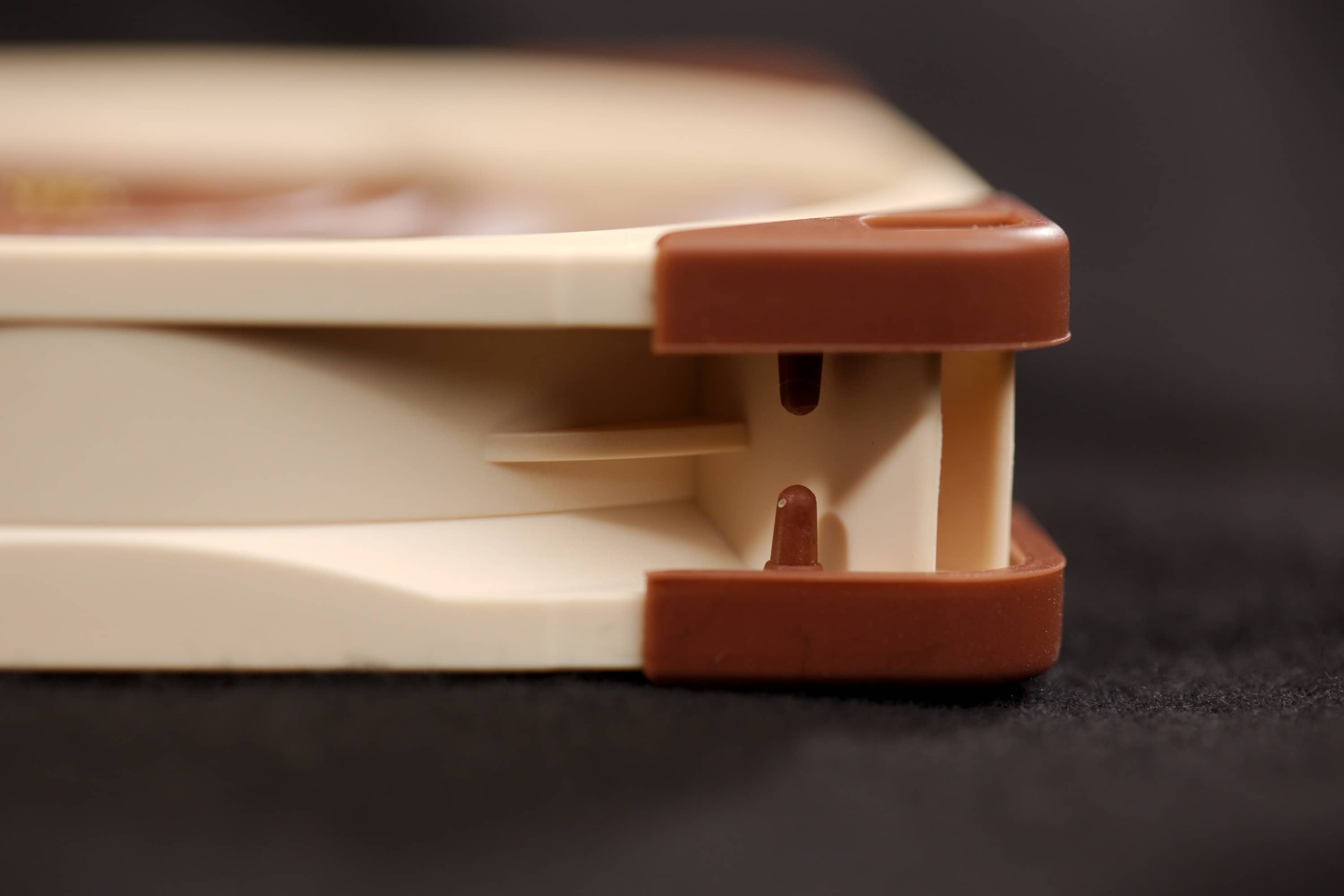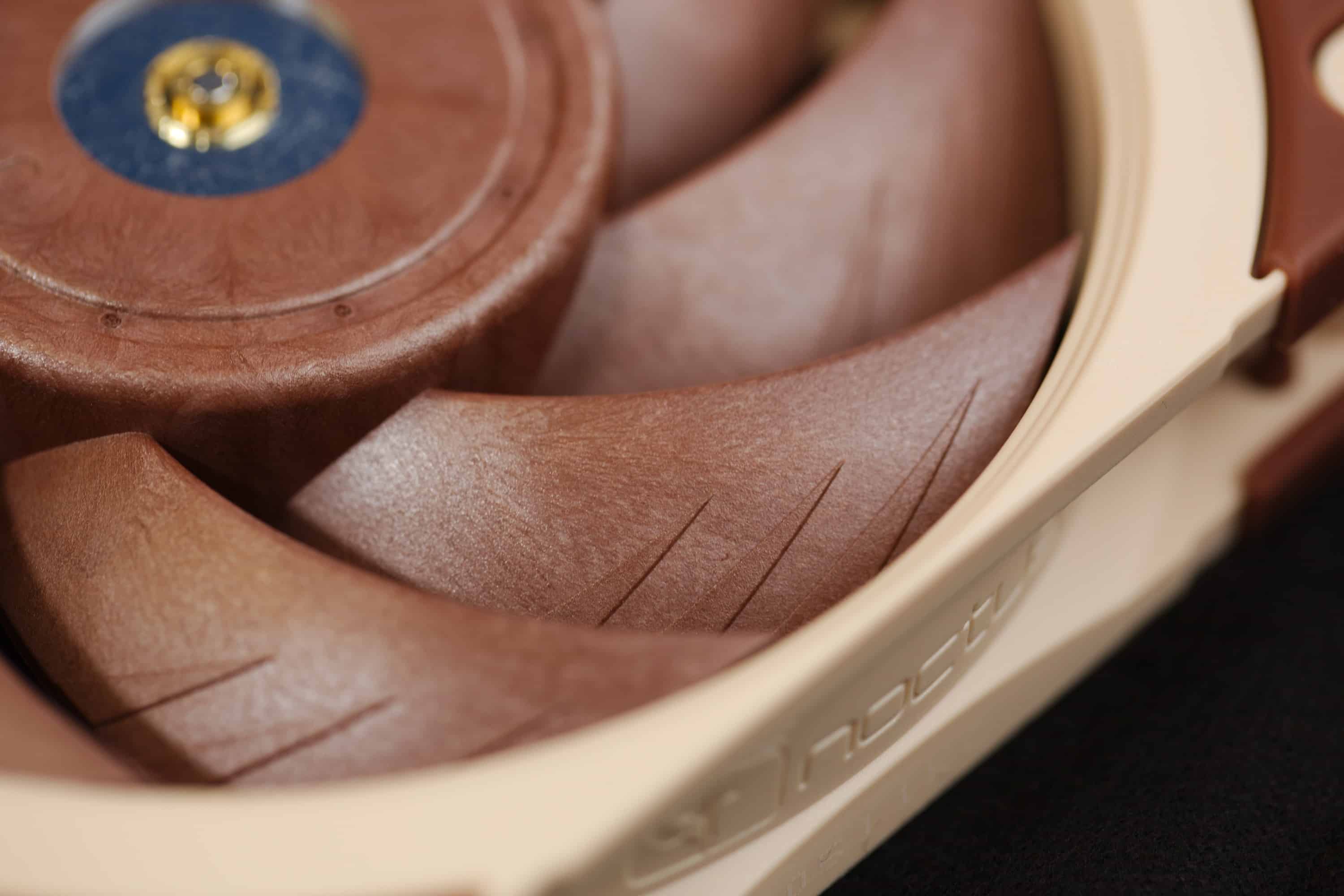 Insbesondere haben die Noctua NF-A12x25 einige neue Trends gesetzt, wie beispielsweise die vorne sehr spitz zulaufenden Lüfterblätter, die seitdem von vielen Konkurrenzmarken imitiert wurden. Die Verarbeitungsqualität ist sehr hochwertig, was man schon beim Anfassen merkt. Insbesondere die Lüfterblätter sind sehr fest, was durch das Flüssigkristall-Polymer erreicht wird. Die Folge ist, dass sie den Abstand der Lüfterblätter zum Rahmen sehr eng halten konnten. Normaler Kunststoff hätte hier das Problem, dass er sich bei höherer Drehzahl etwas streckt und am Rahmen reiben könnte. Aber mit diesem harten Material wird durch den geringen Abstand dafür gesorgt, dass man eine größtmögliche Nutzfläche hat und quasi keine Luft unkontrolliert wieder nach hinten herausgelenkt werden kann.
