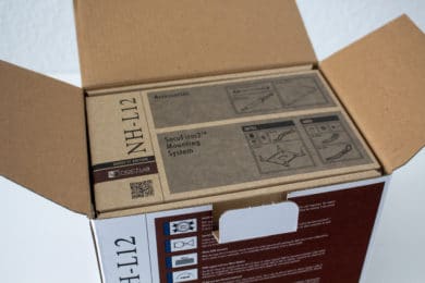 Unterhalb der Zubehör-Box liegt dann, gut geschützt durch Pappe, der Kühlkörper inklusive Lüfter. Wie wir es von Noctua gewöhnt sind, ist die Verpackung gut durchdacht und das Zubehör ist sehr umfangreich. Auch wenn dieser Kühler speziell für das LOUQE S1 Ghost gedacht ist, wäre die Beigabe von Klammern zur Montage eines zusätzlichen 120-Millimeter-Lüfters noch nett gewesen.