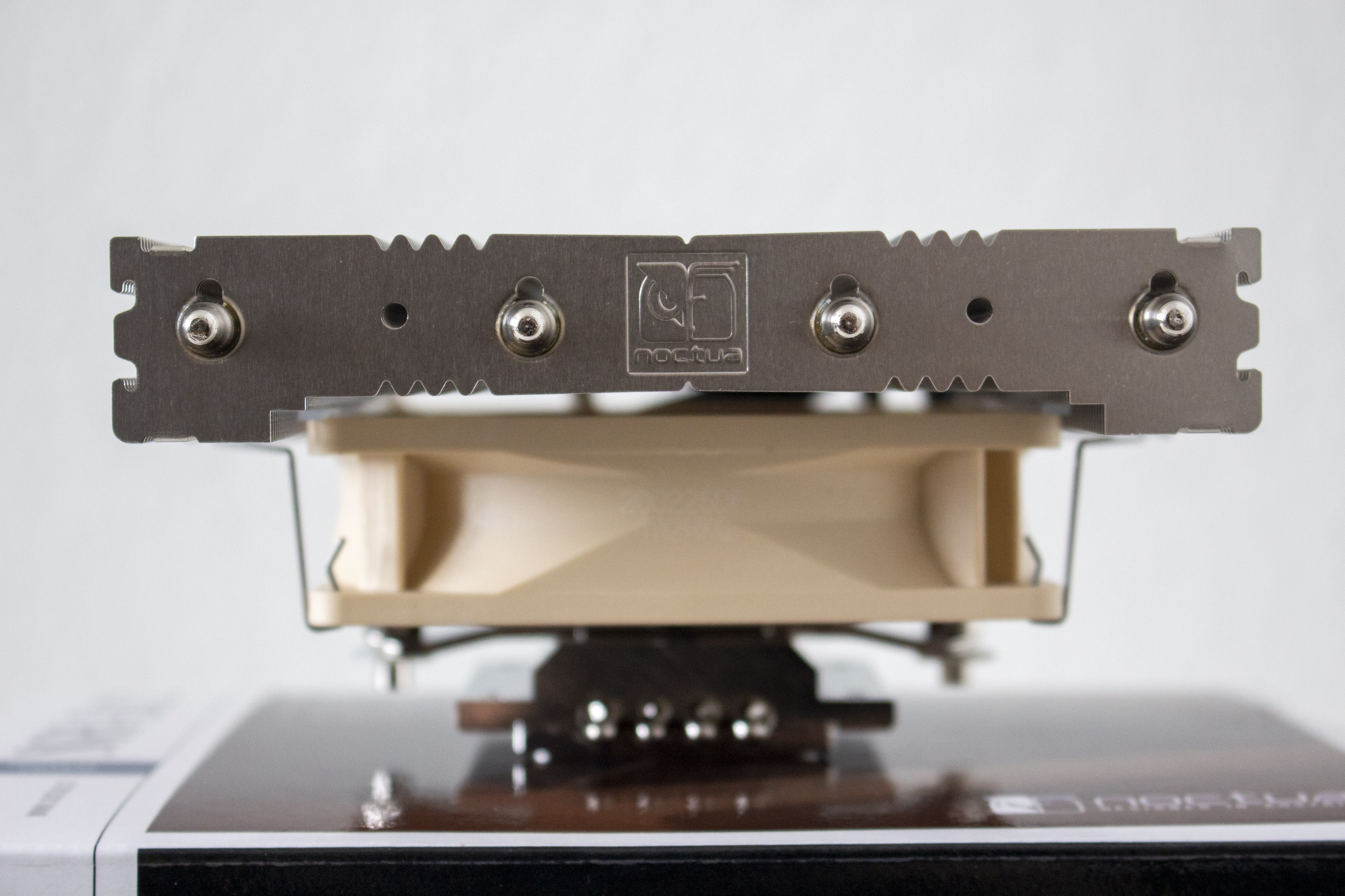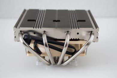 Der Noctua NH-L12 Ghost S1 Edition ist zwar ein Kühler speziell für ITX-Systeme, wirkt aber auf den ersten Blick doch recht wuchtig. Der Kühlerkörper basiert auf vier 6-Millimeter-Heatpipes, 60 Aluminium-Lamellen sowie einer glatten Bodenplatte aus Kupfer. Um eine einheitliche Optik zu erzeugen, wurden alle Heatpipes sowie die Bodenplatte vernickelt und in die die äußerste Lamelle wurde das Hersteller-Logo gestanzt.