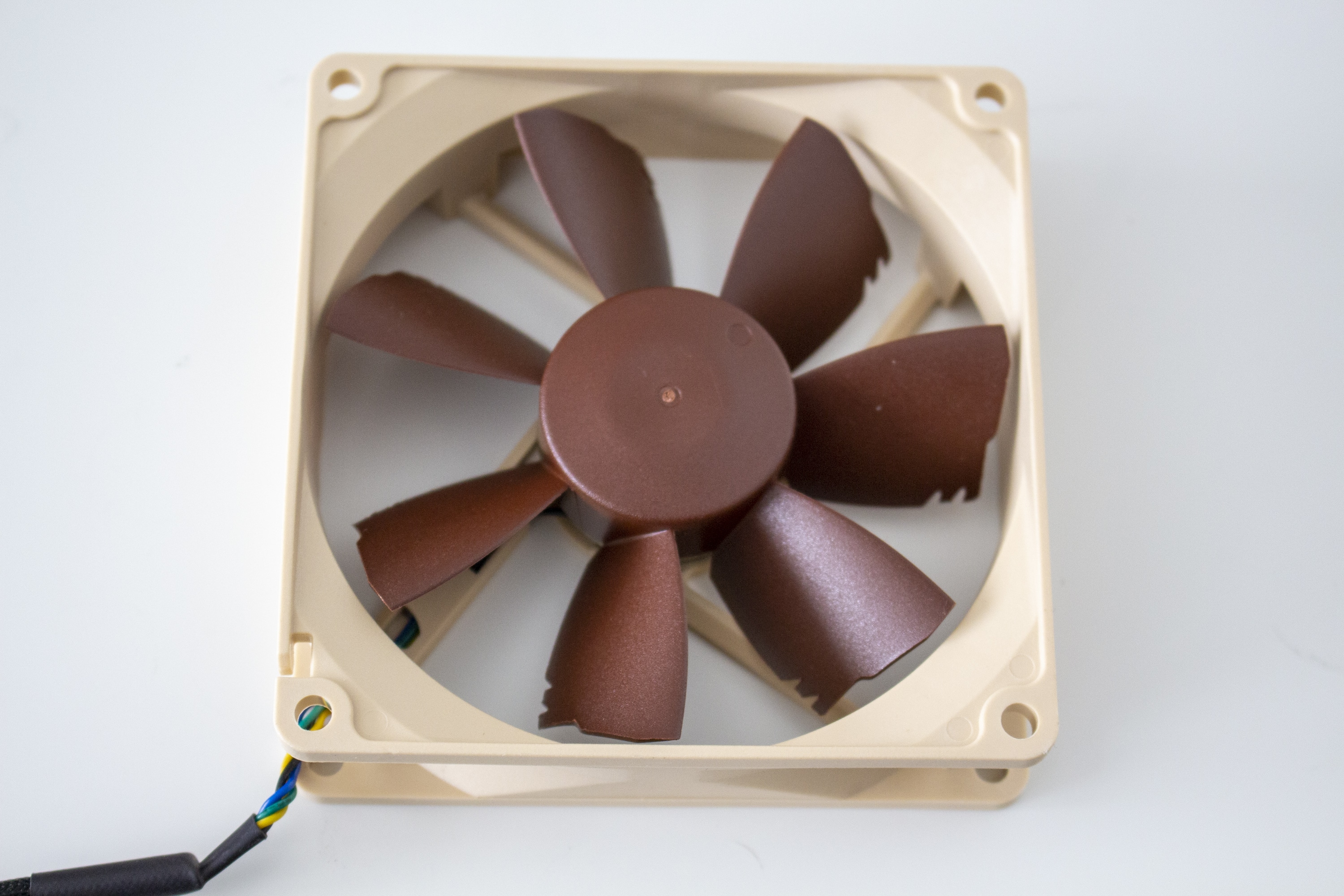 Der vorinstallierte Lüfter trägt die Bezeichnung Noctua NF-B9 PWM und ist ab Werk so orientiert, dass die Luft durch die Lamellen gesaugt und in Richtung des Sockel befördert wird. Er hat eine Rahmenbreite von 92 Millimetern, ist 25 Millimeter tief und dreht mit maximal 2600 Umdrehungen pro Minute. Der Anschluss erfolgt über ein schwarz gesleevtes Kabel mit 4-Pin-PWM-Anschluss.