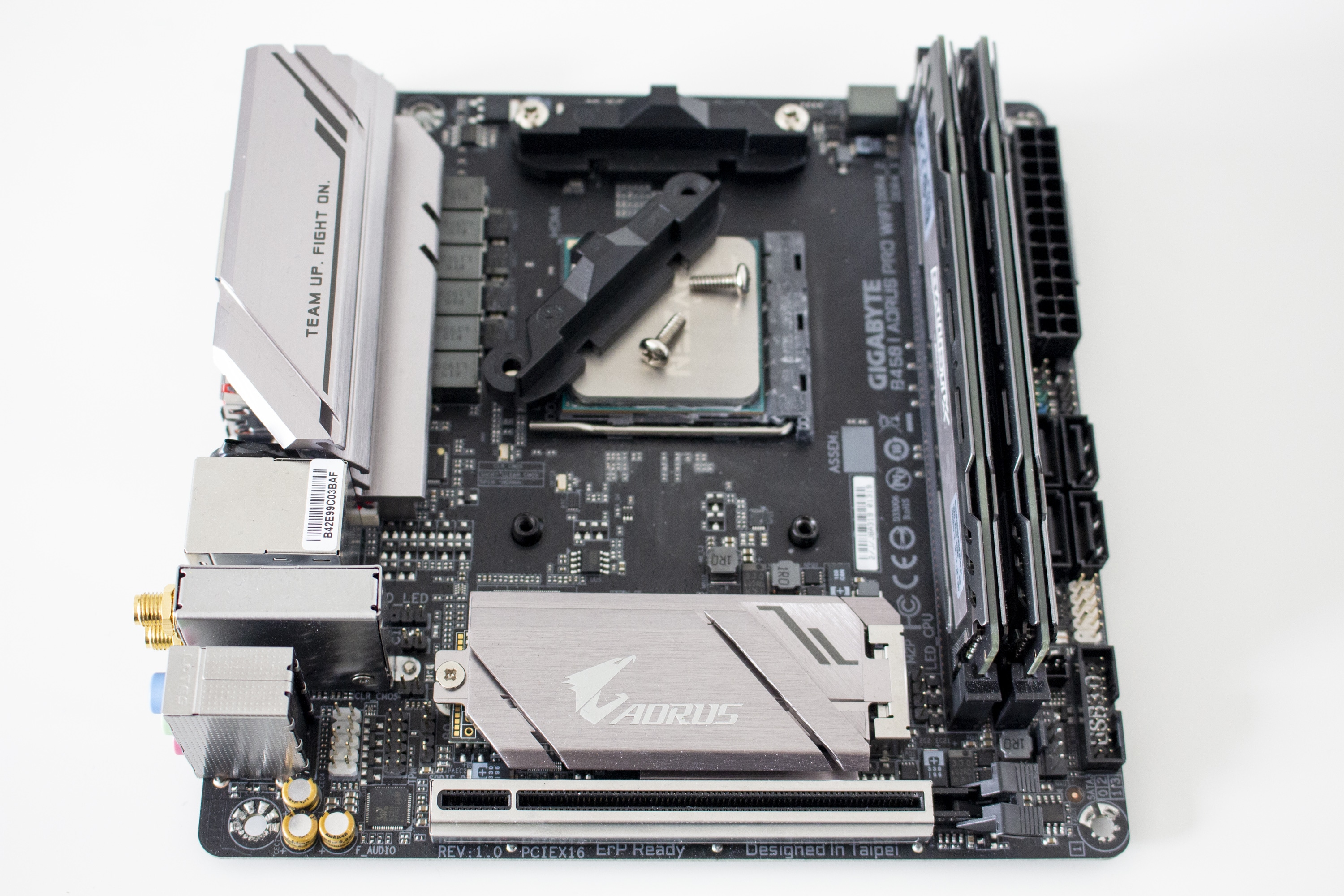 Durch seine Bauweise ist der Noctua NH-L12 S1 Ghost kompatibel bis bis zu 48 Millimeter hohen RAM-Riegeln. Damit passen zum Beispiel die beliebten G.Skill RipJaws als auch die G.Skill Trident Z unter diesen Kühler. Je nach Mainboard und Ausrichtung des Kühlkörpers könnte es aber dazu kommen, dass die Heatpipes über den PCIe-Slot ragen. Da der Sockel bei unserem Gigabyte B450 I Aorus Pro WIFI recht hoch auf dem Mainboard sitzt, gibt es bei dieser Hauptplatine keine Komplikationen. Außerdem führt Noctua zu jeden Kühler eine Kompatibilitätsliste.