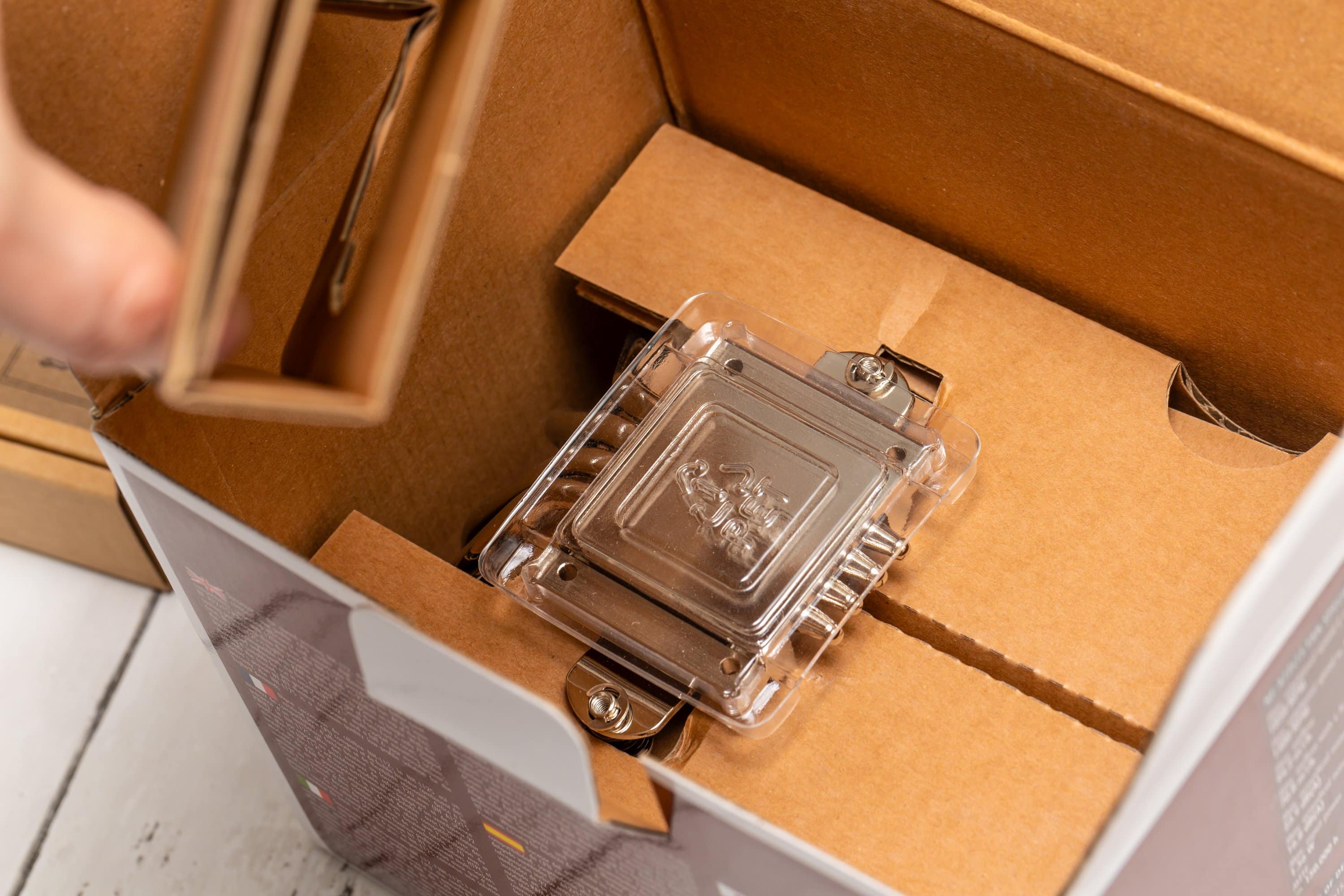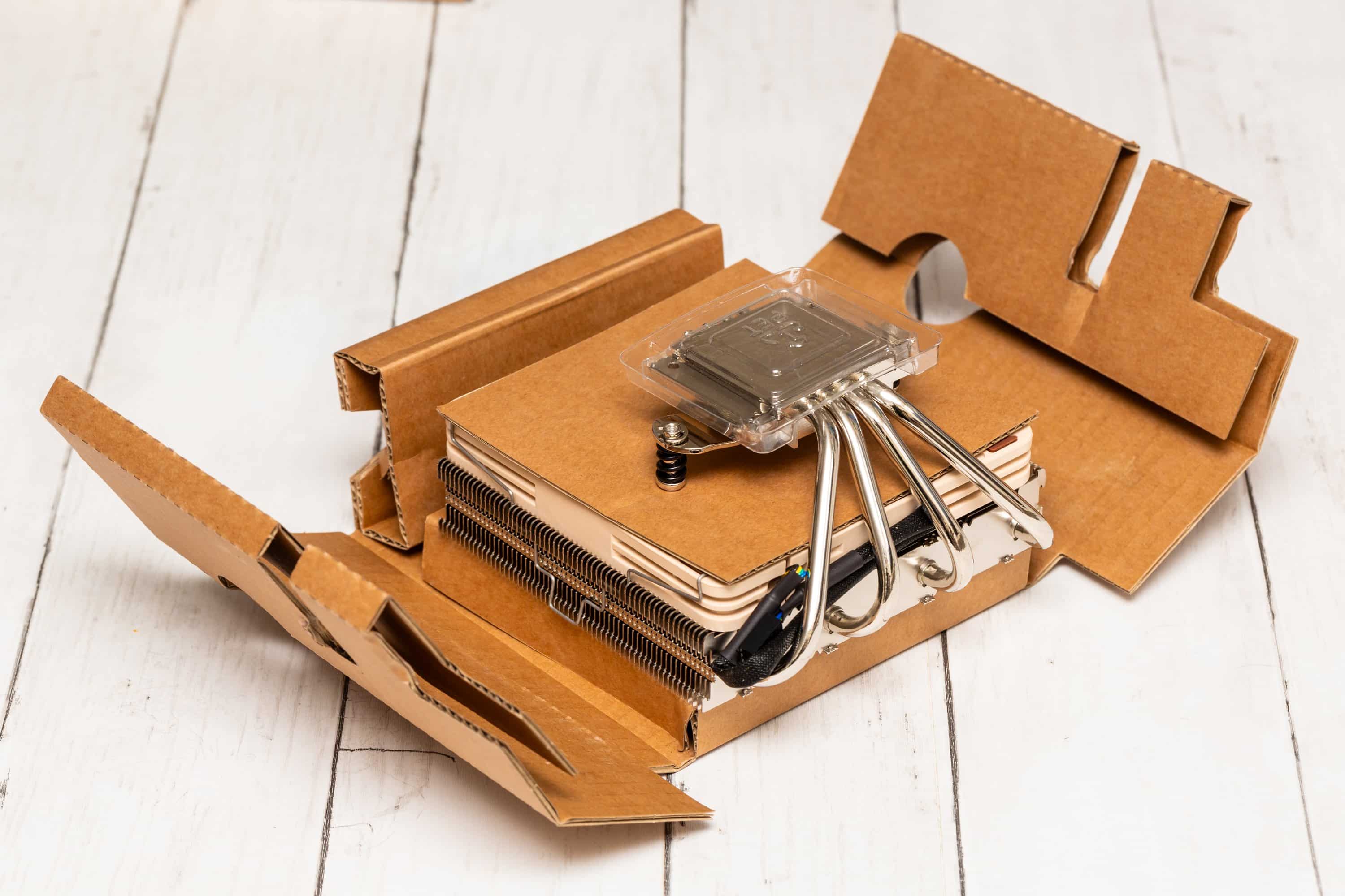 Das Verpackungsmaterial des Noctua NH-L12S besteht größtenteils aus Pappe, sodass der Plastikanteil gering ist. Lediglich die Komponenten des Montagematerials findet sich in kleinen Plastiktüten. Und die Schutzabdeckung der Kontaktfläche des Kühlkörpers besteht aus Kunststoff. Davon abgesehen besteht die Schachtel im klassisch braun-weißen Noctua-Look aus festem Karton. Darin sitzt die Zubehörschachtel und ein speziell auf den Kühlkörper zugeschnittener ineinander gefalteter Karton.